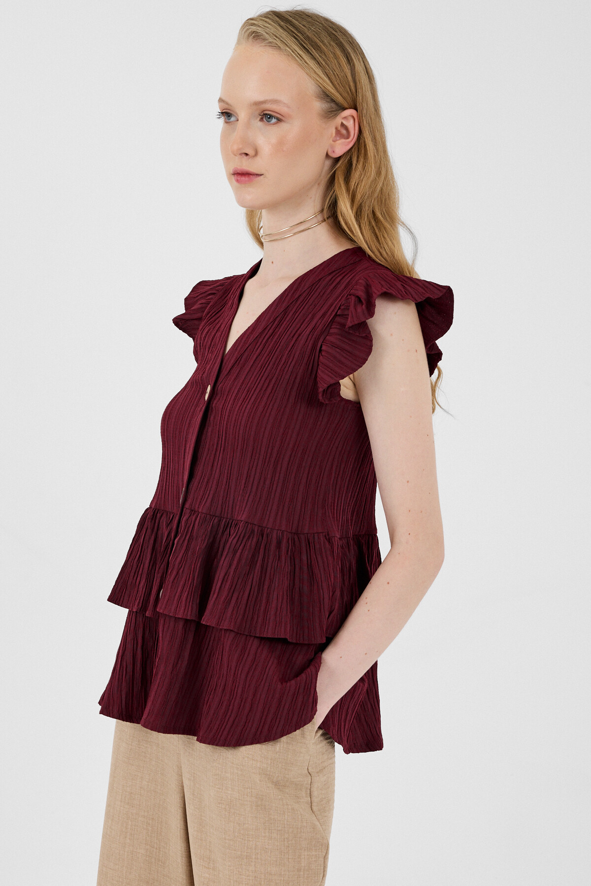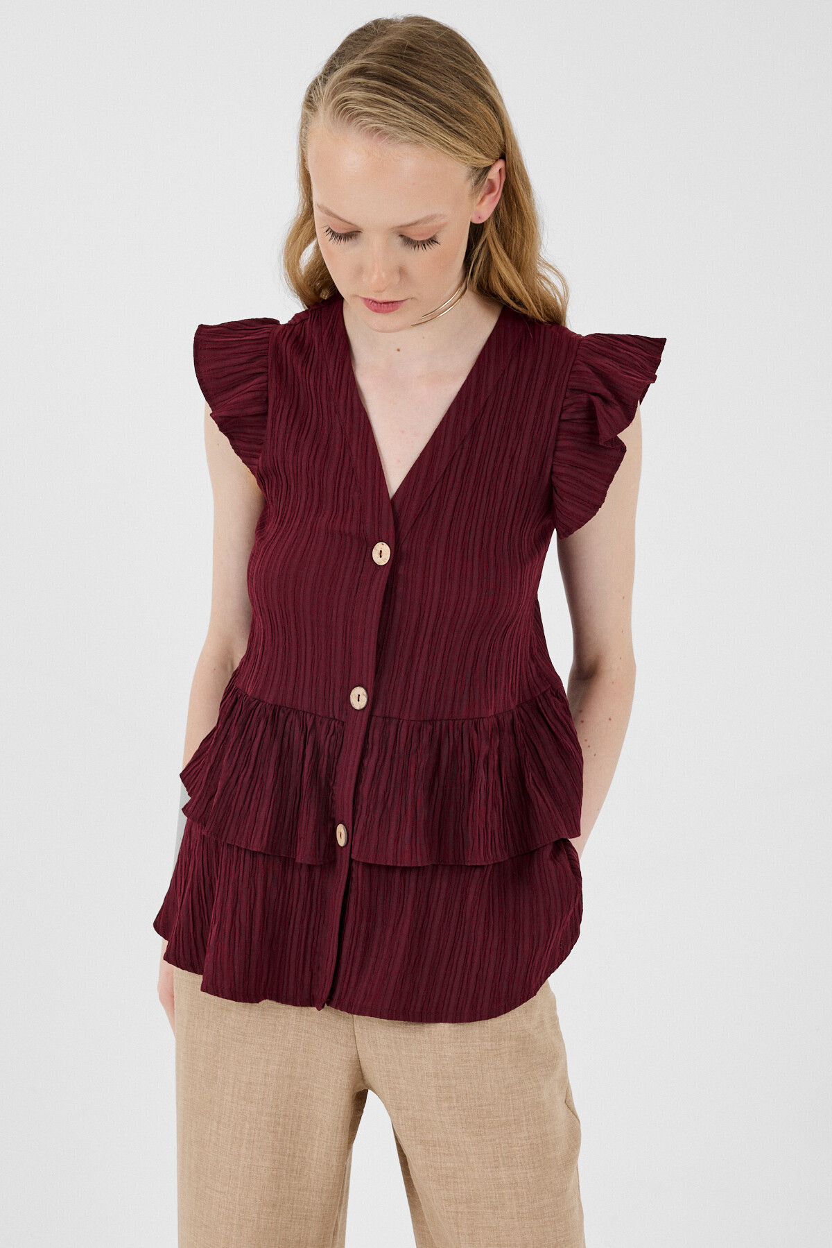 Bordo V Yaka Düğmeli Fırfır Kol Bluz 8052A