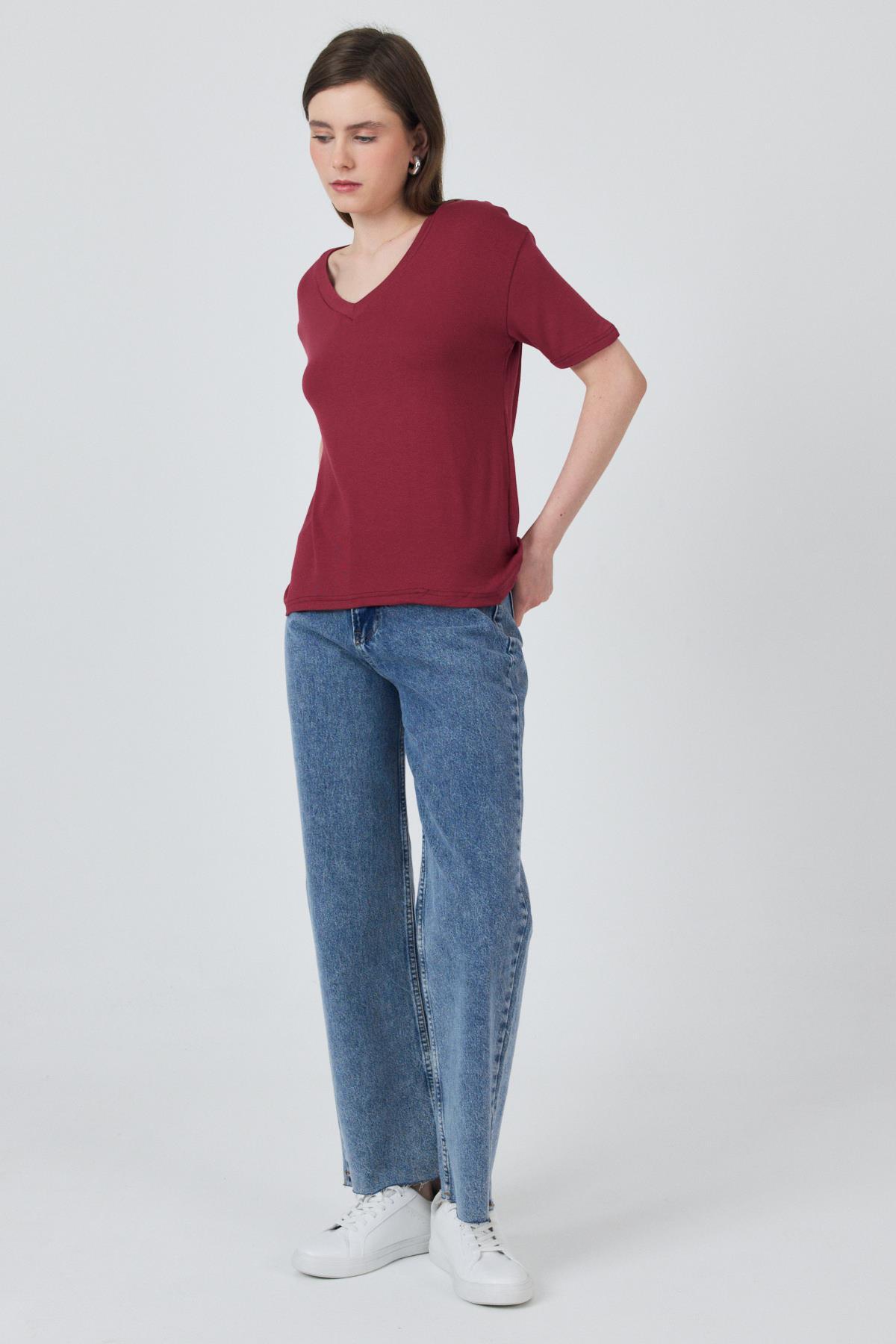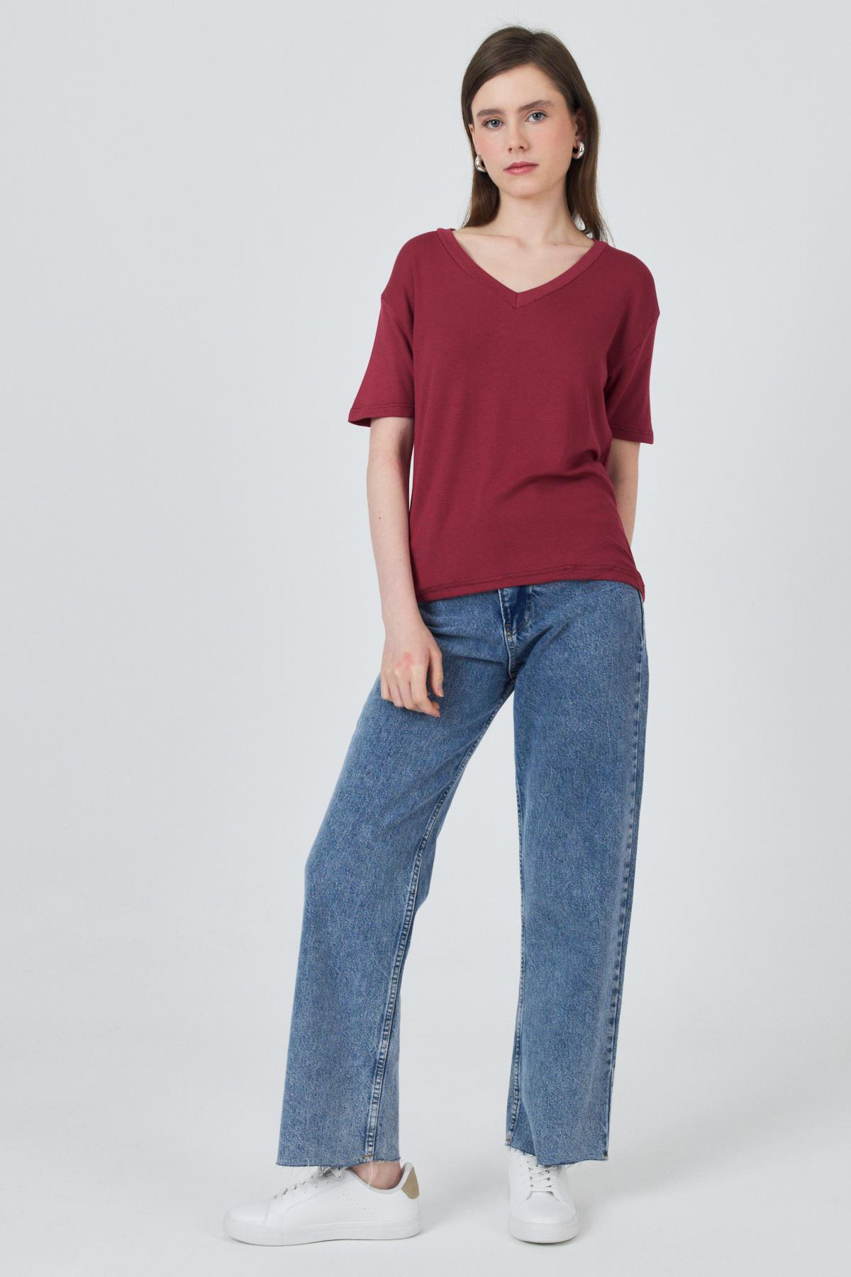 Bordo V Yaka Viskoz/Yumuşak Kumaş Dökümlü Tişört 3077