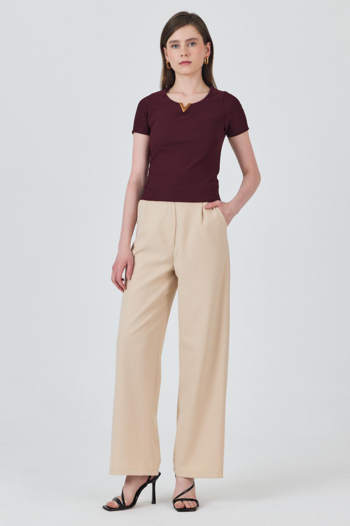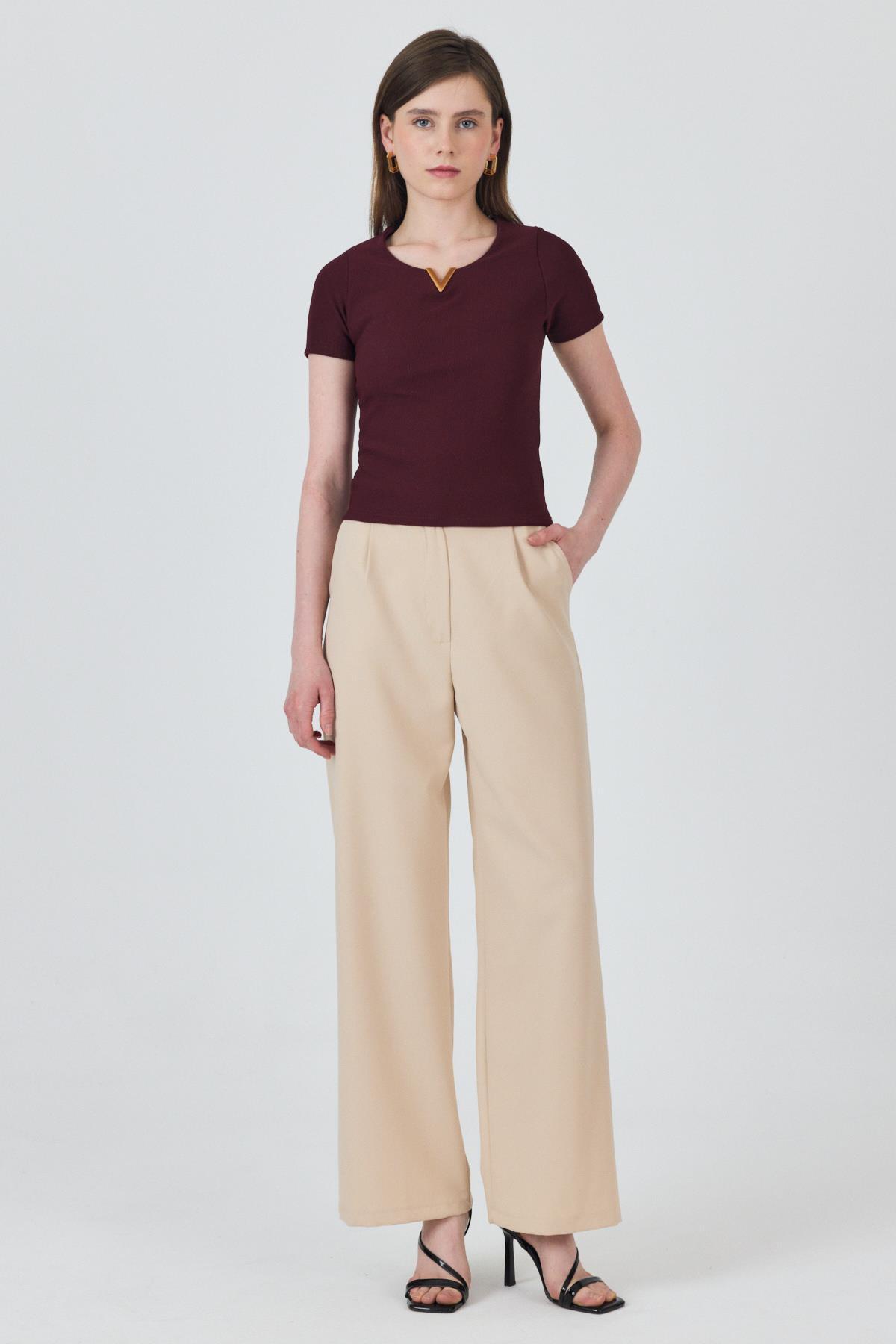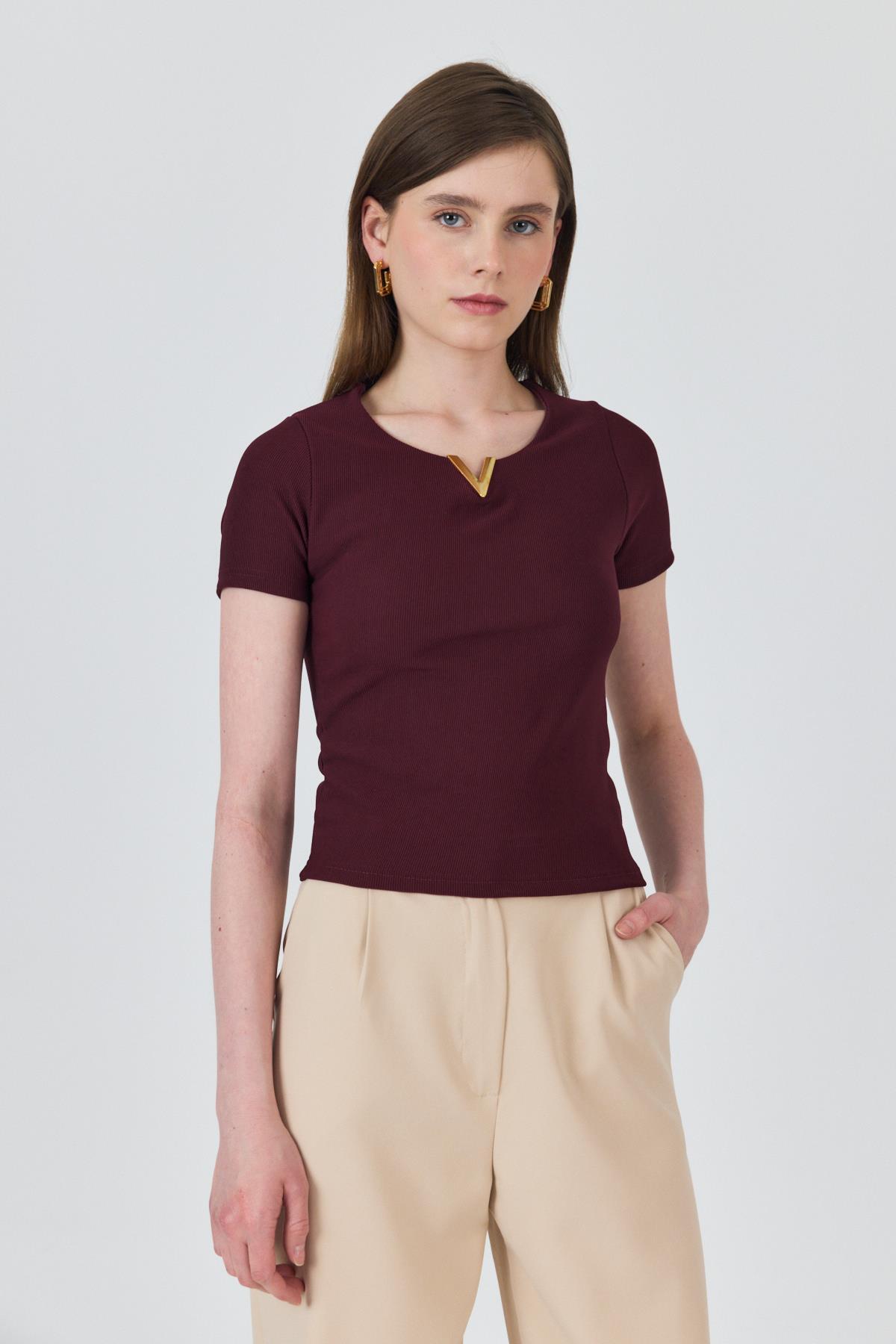 Bordo Yaka Aksesuar Detaylı Örme Tişört 2224