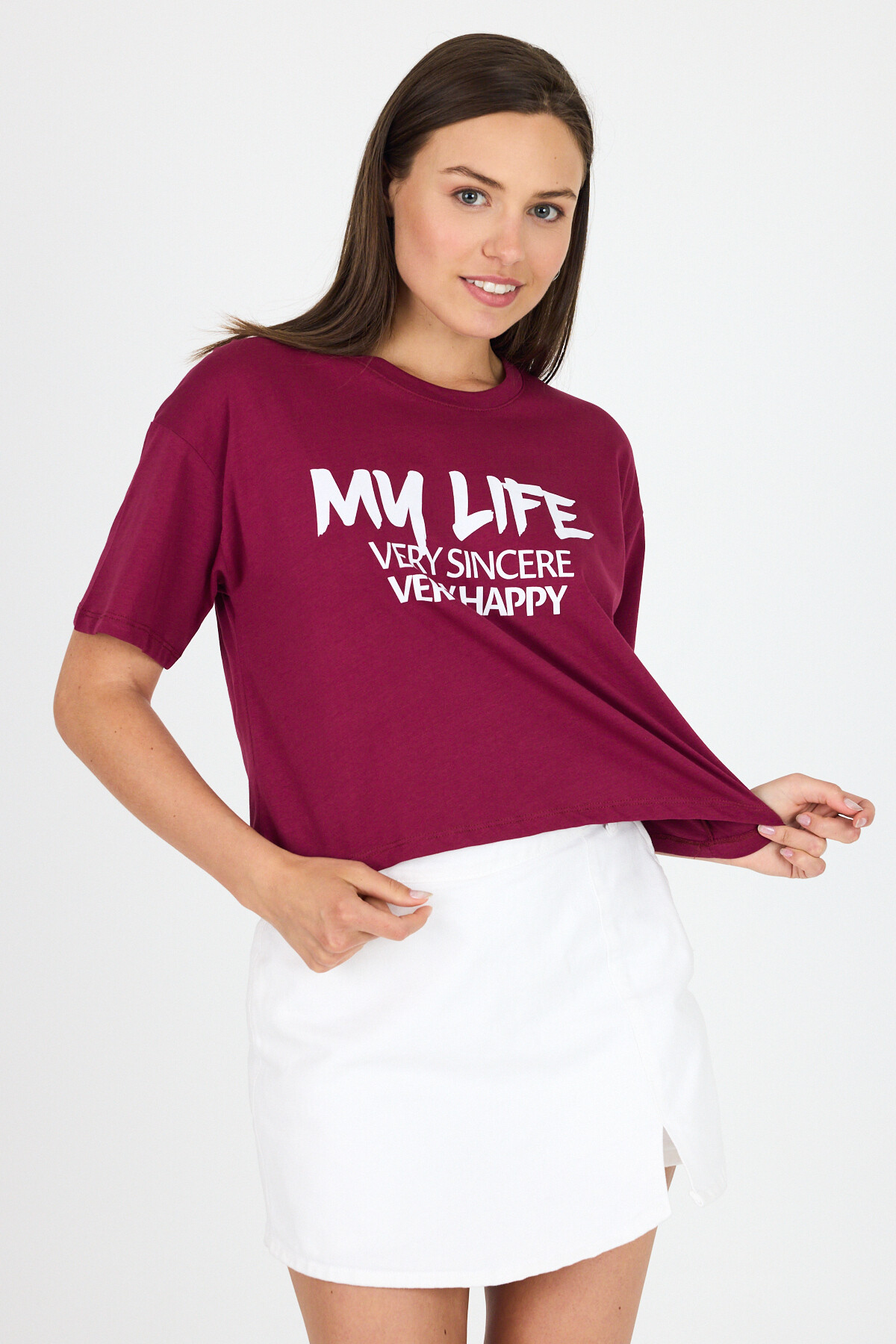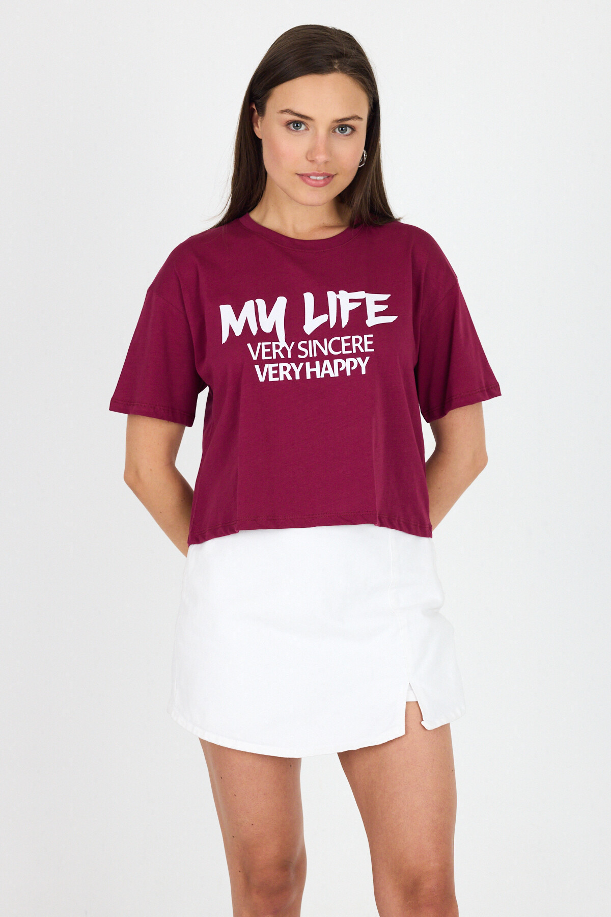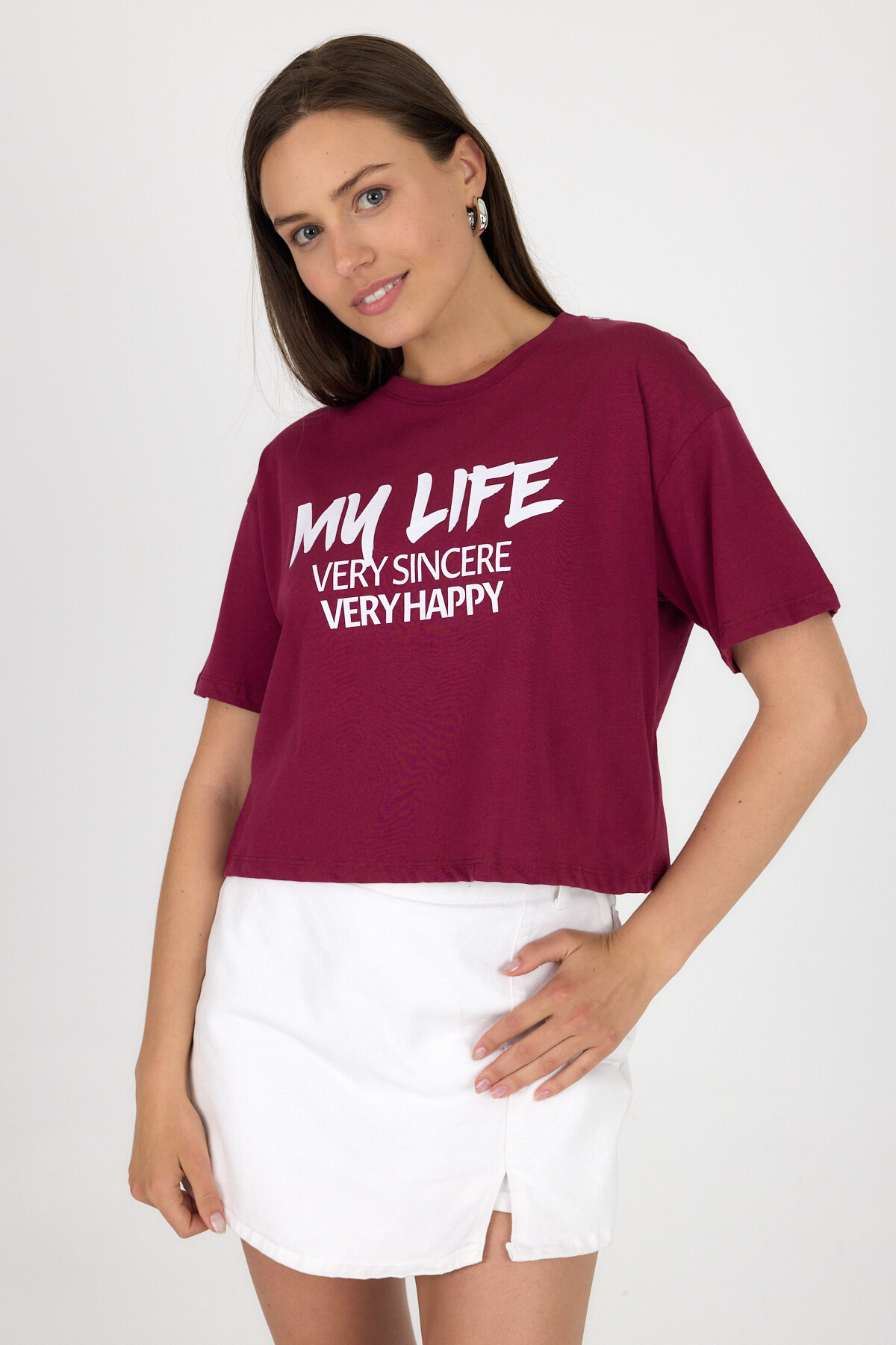 Bordo Yazı Baskılı %100 Pamuk Crop Tişört 9187M