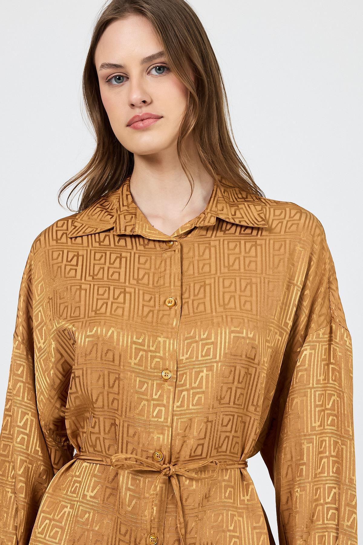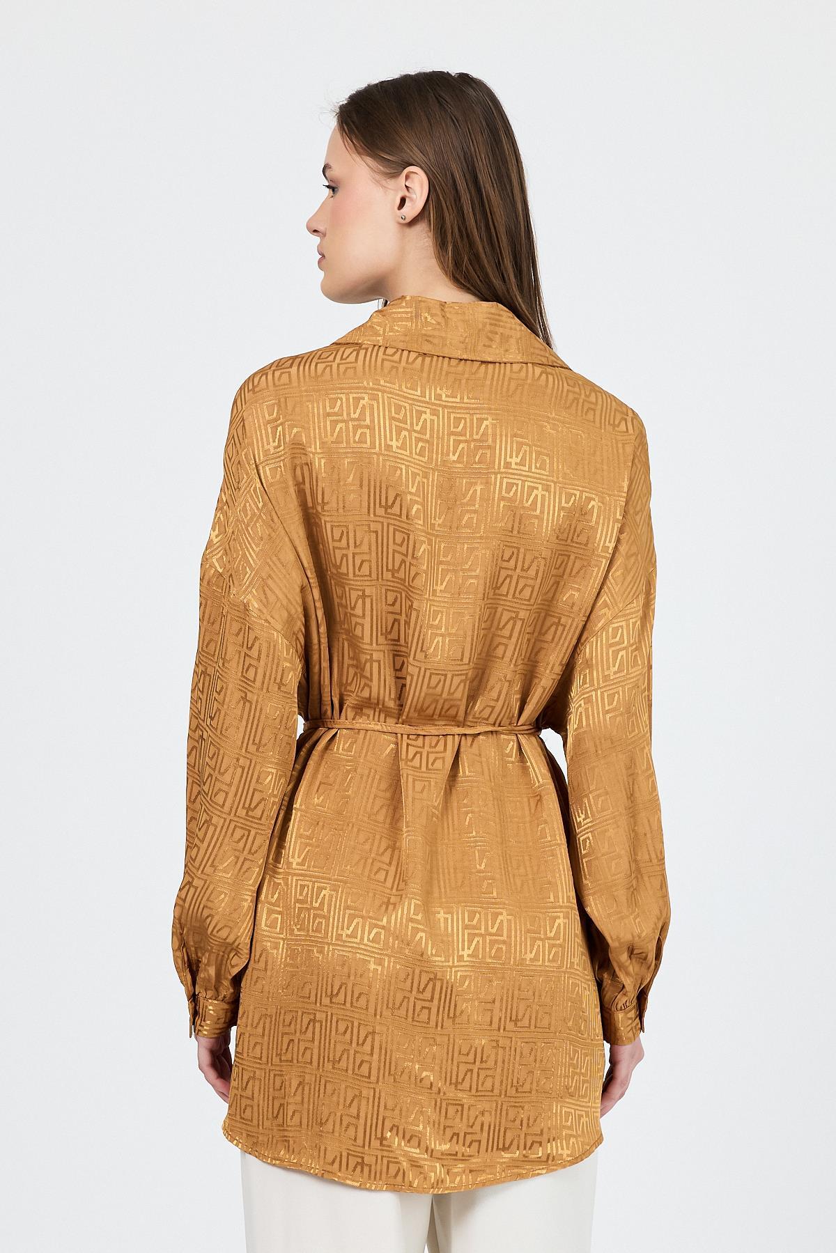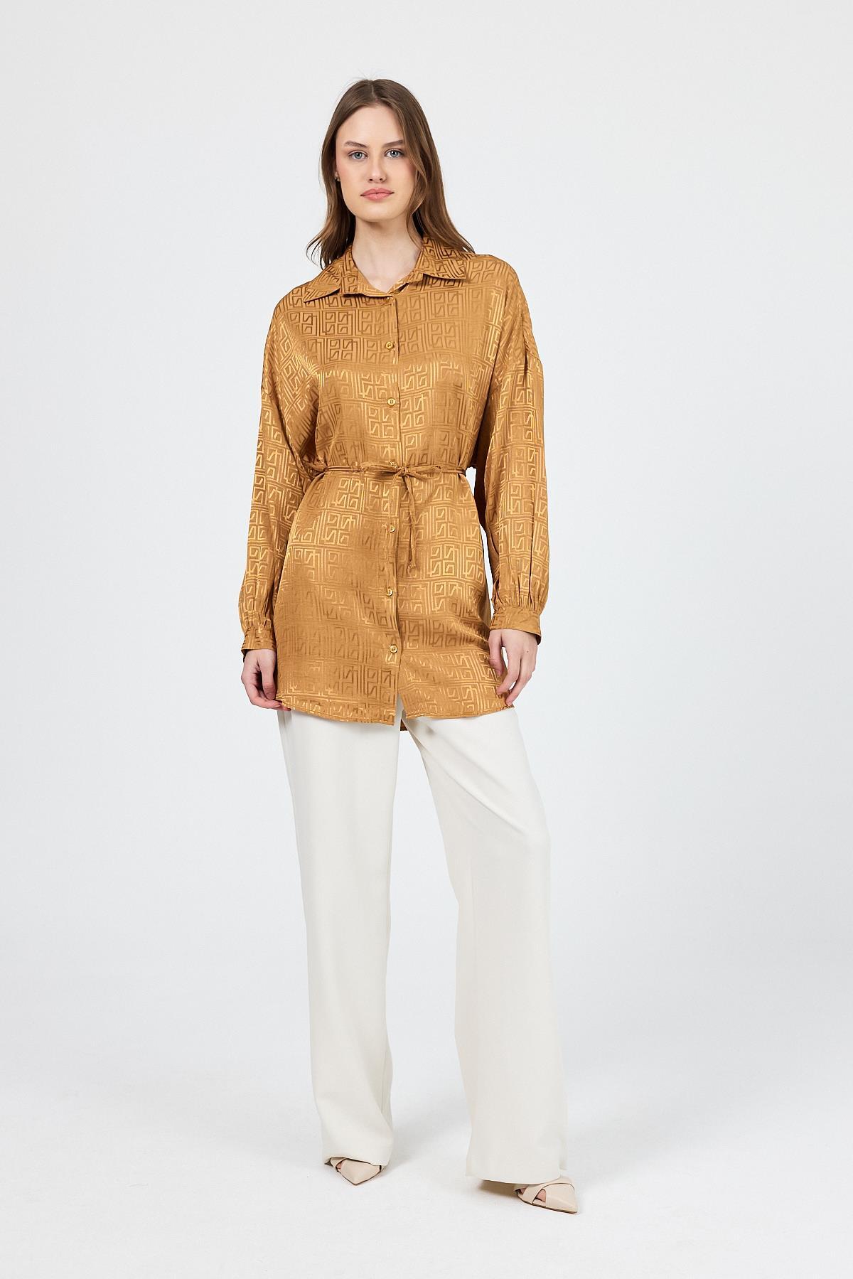Camel Desenli Saten Görünümlü İp Bağlama Detaylı Gömlek 4293A