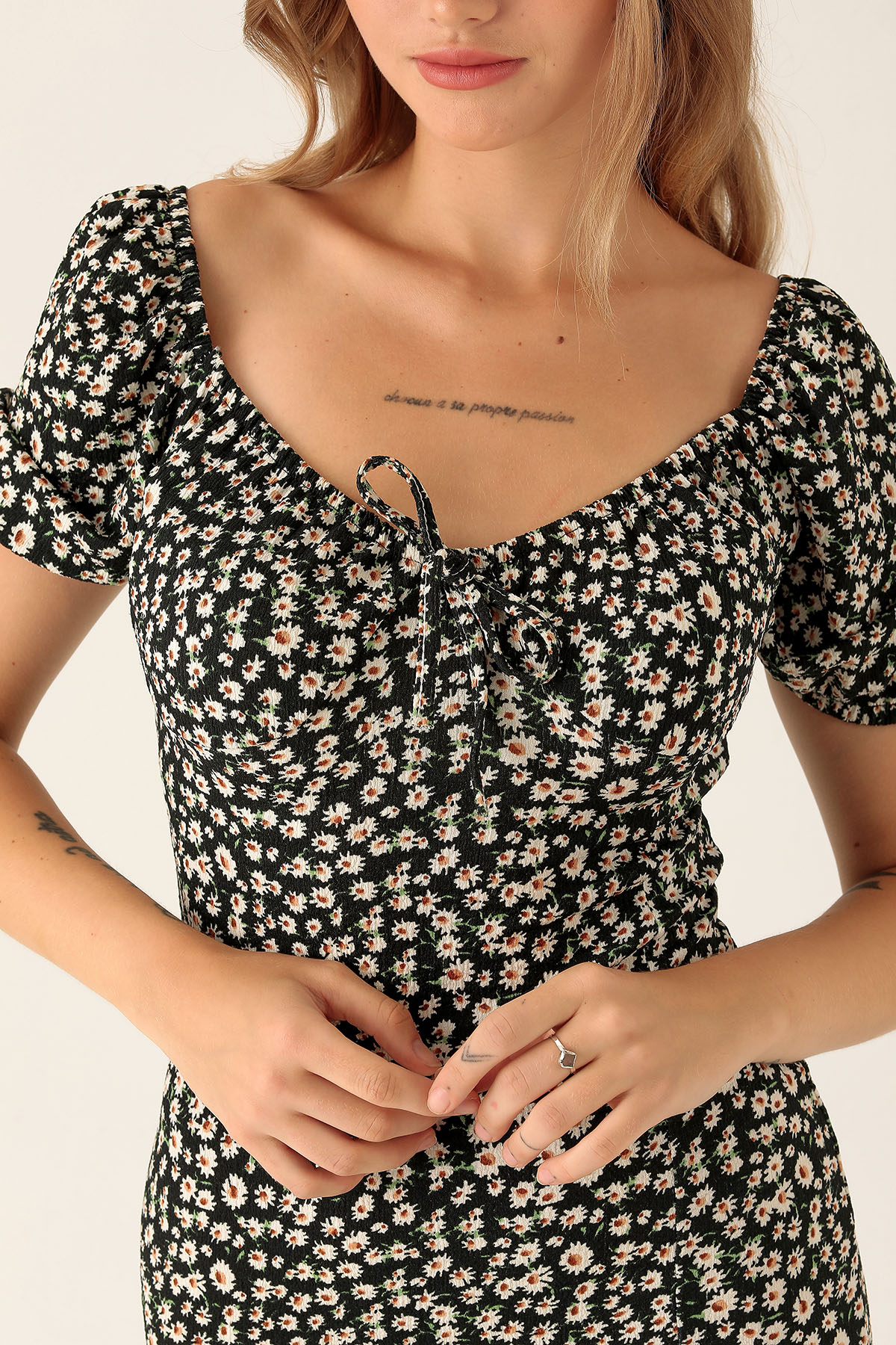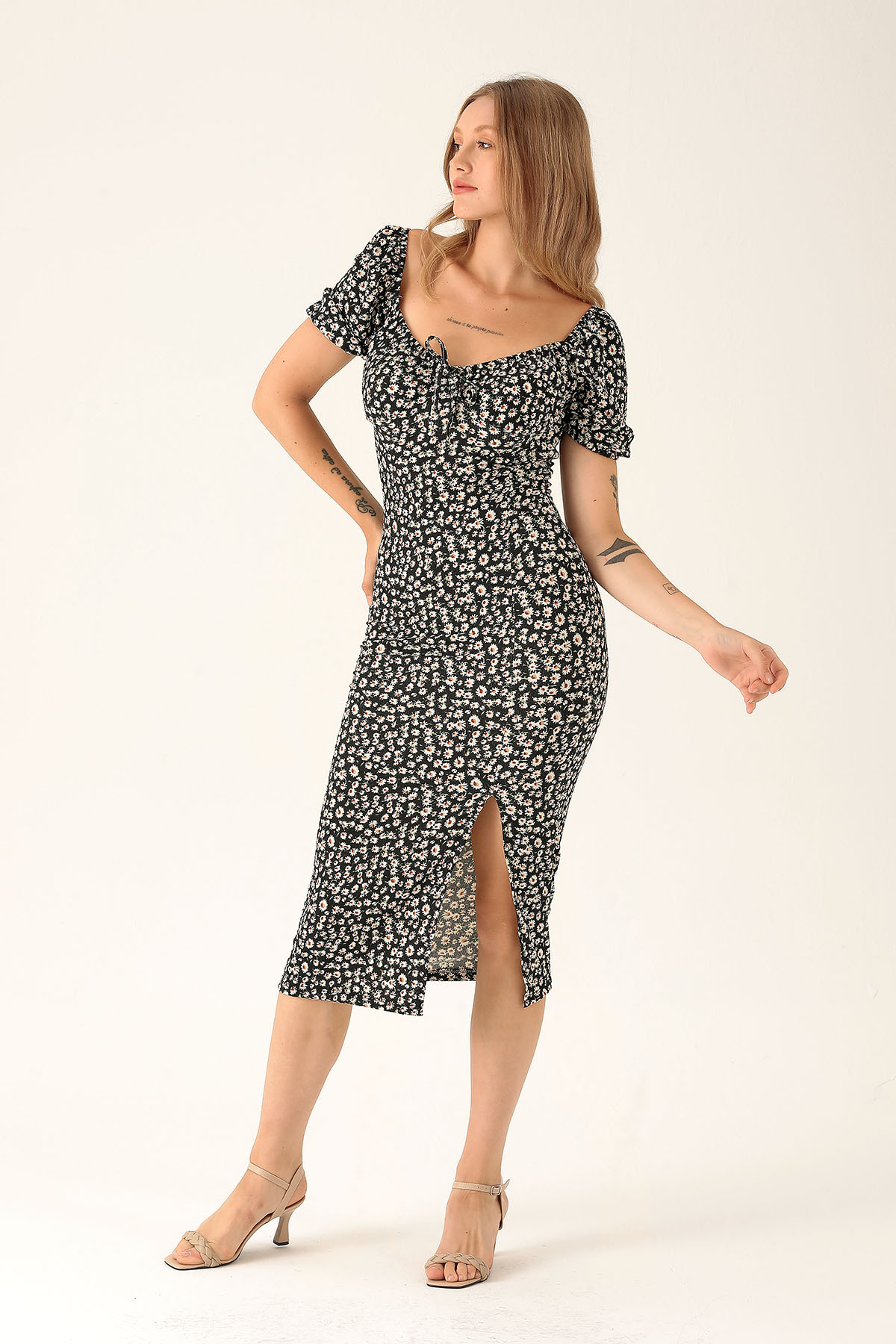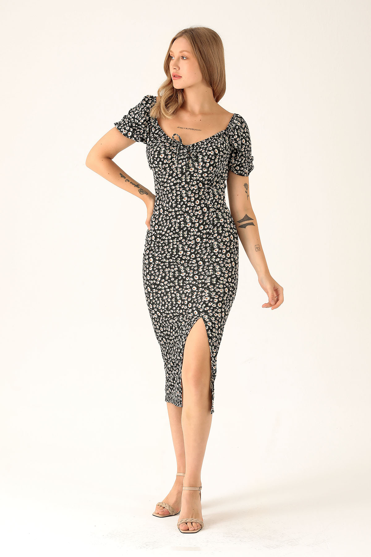 Çiçek Detay Yırtmaçlı Elbise - 10469 Siyah
