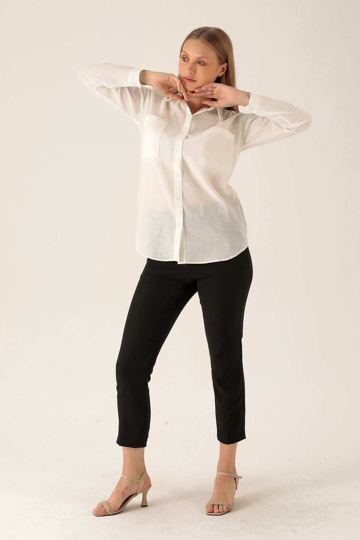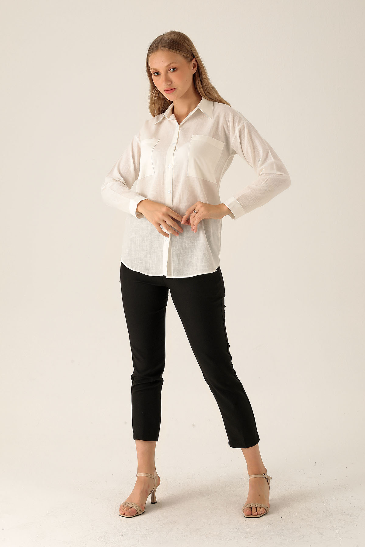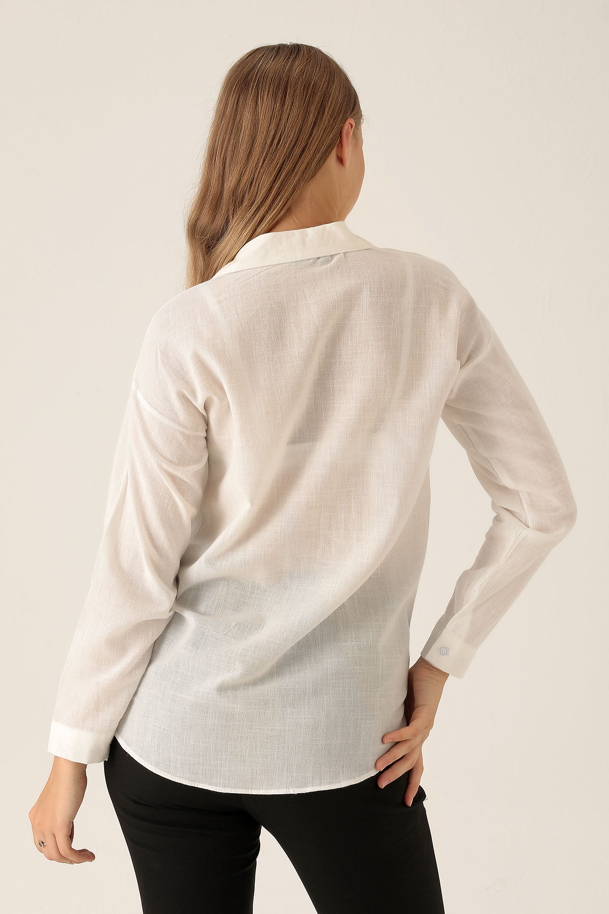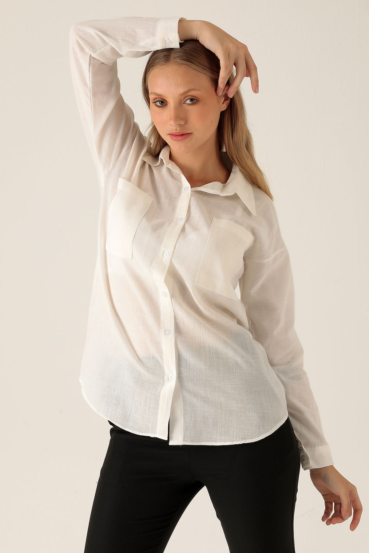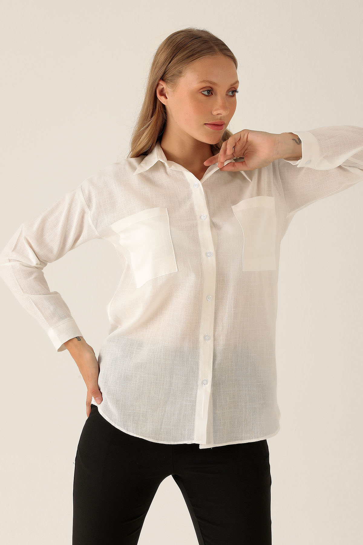 Çift Cep Keten Bayan Gömlek - 6496A Beyaz