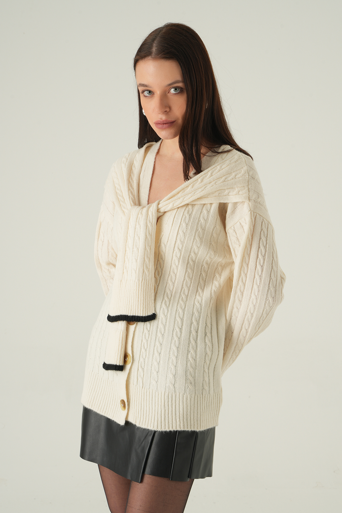Düğmeli Örgülü Hırka Ekru 2470
