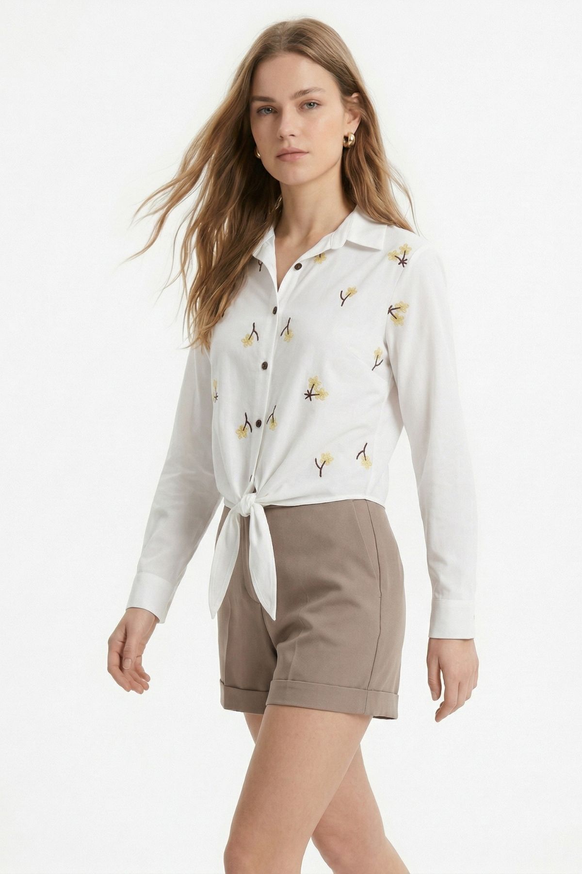 Ekru Çiçek Nakışlı Bağlamalı Gömlek 6282