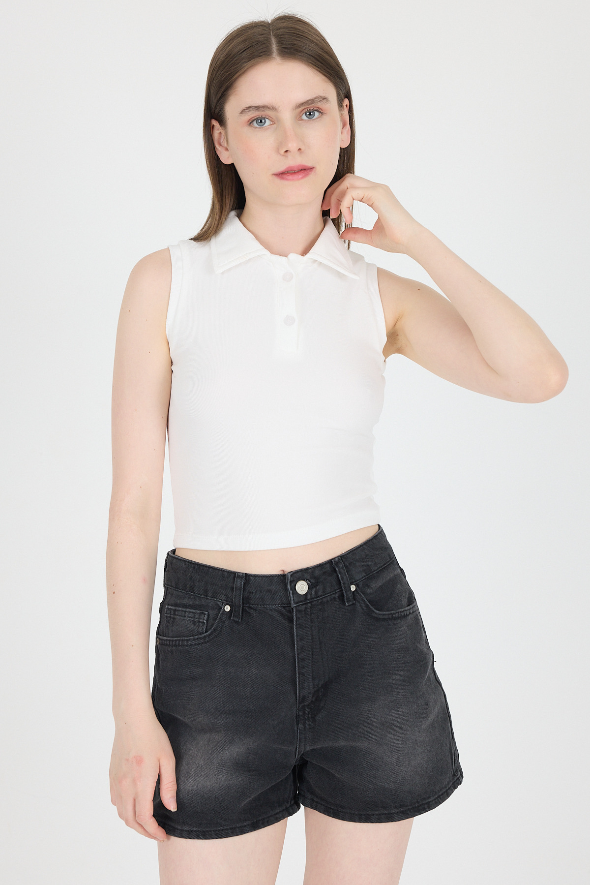 Ekru Düğmeli Polo Yaka Sıfır Kol Örme Bluz 2219