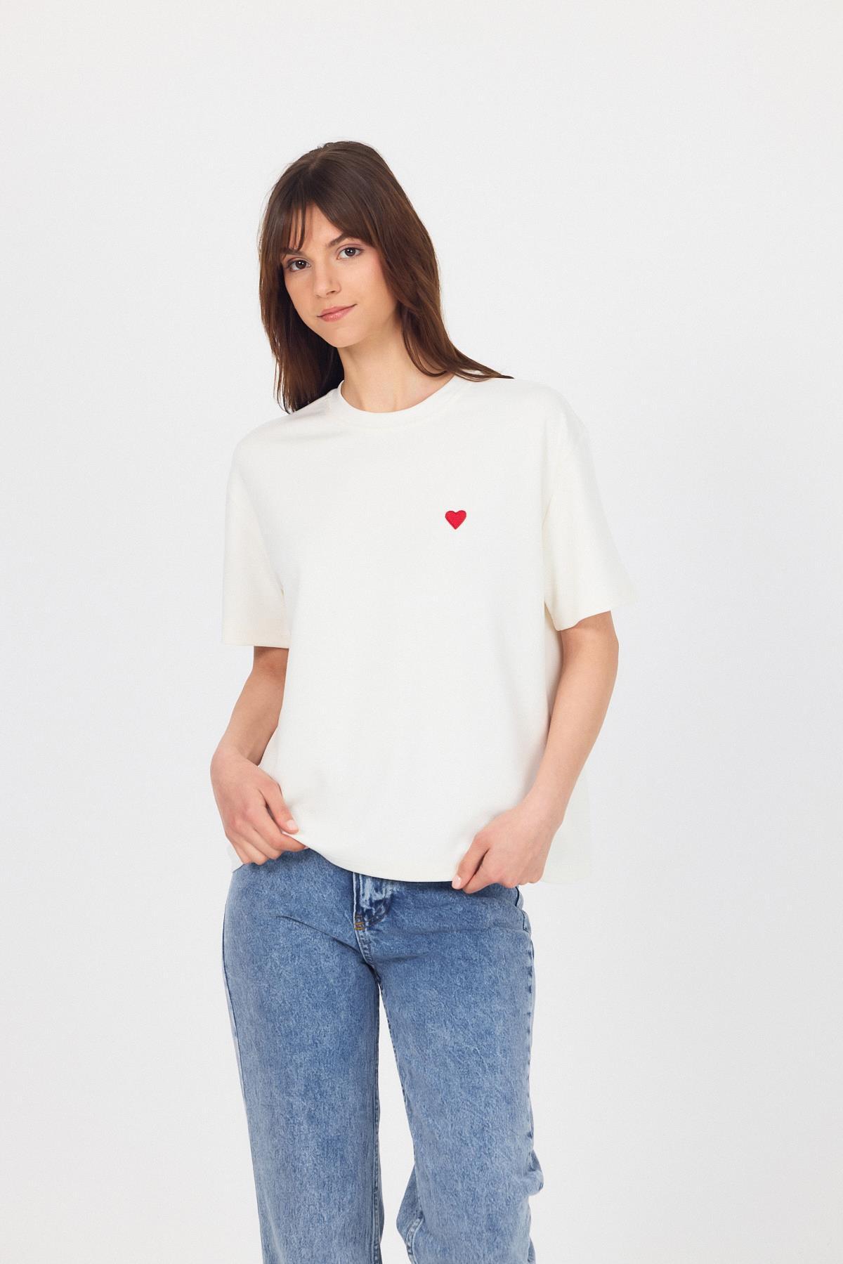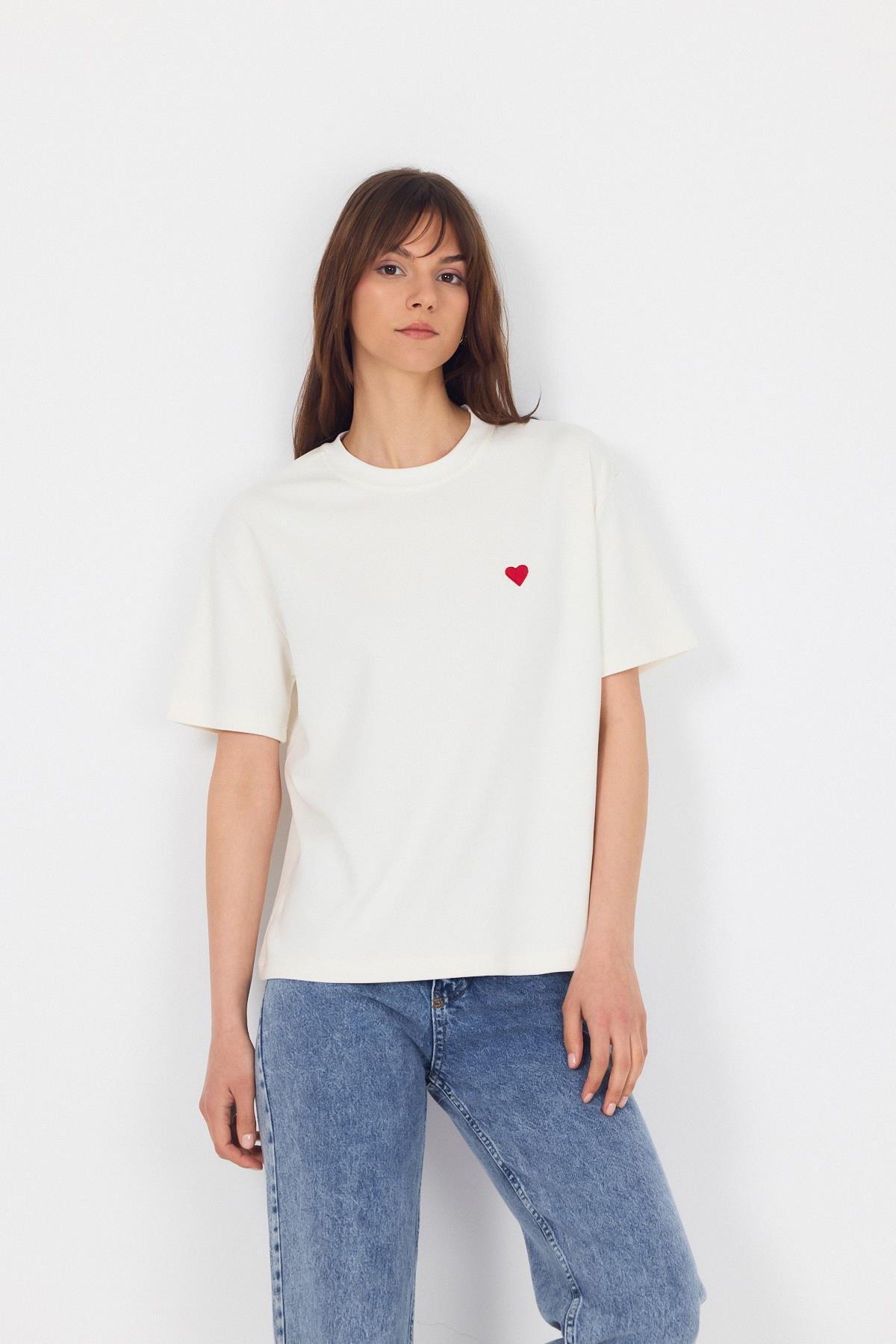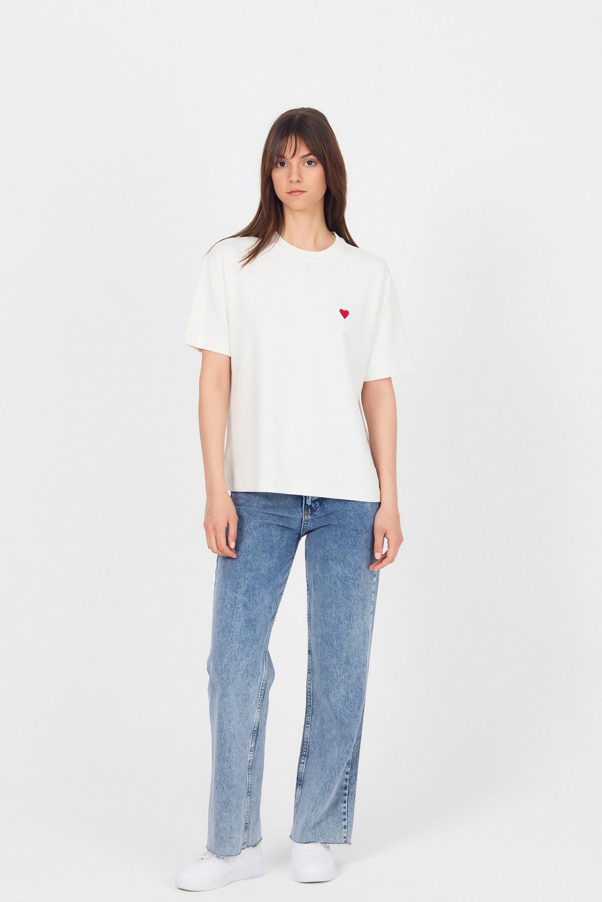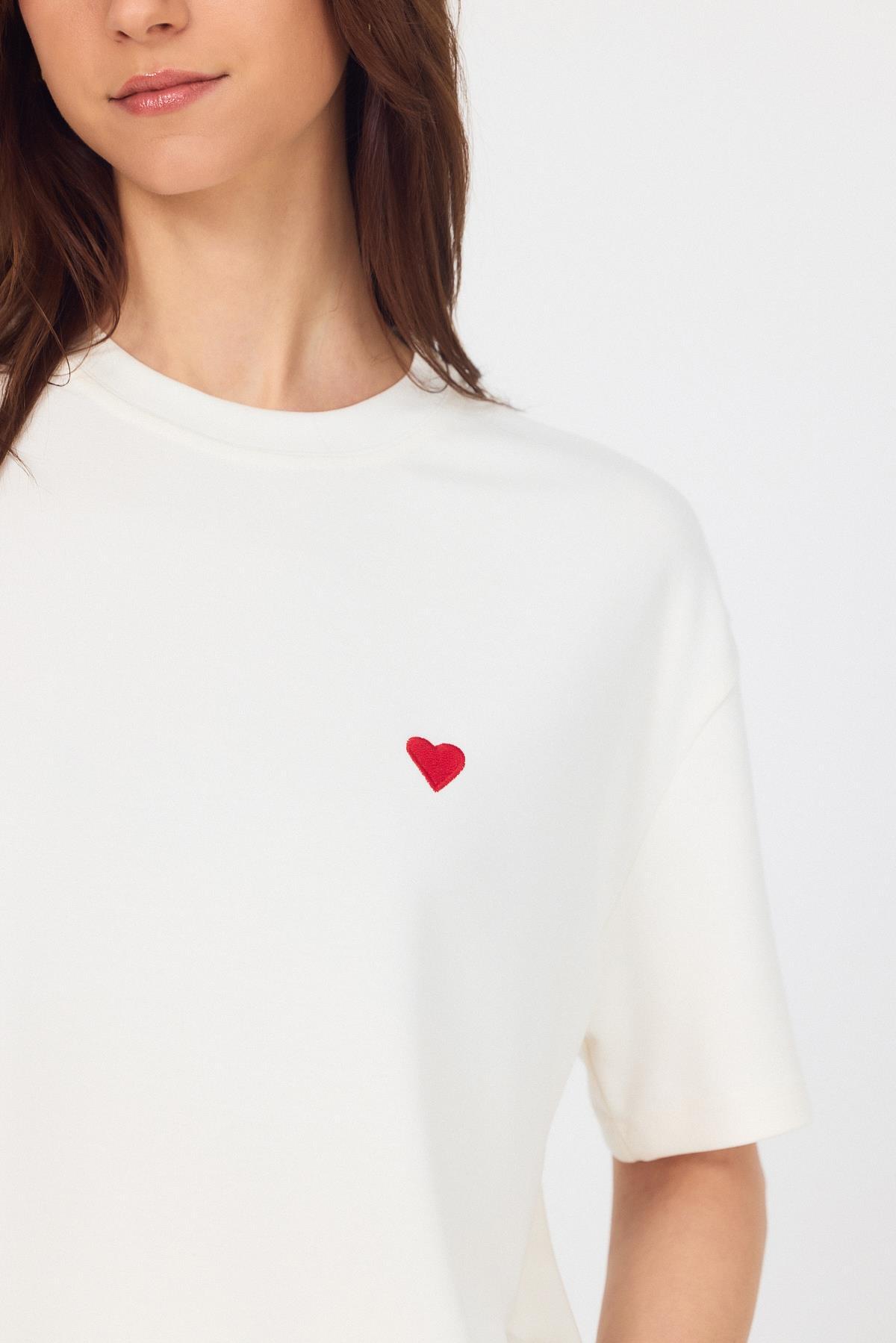 Ekru Kalp Nakışlı Premium Kumaş Tişört 6218