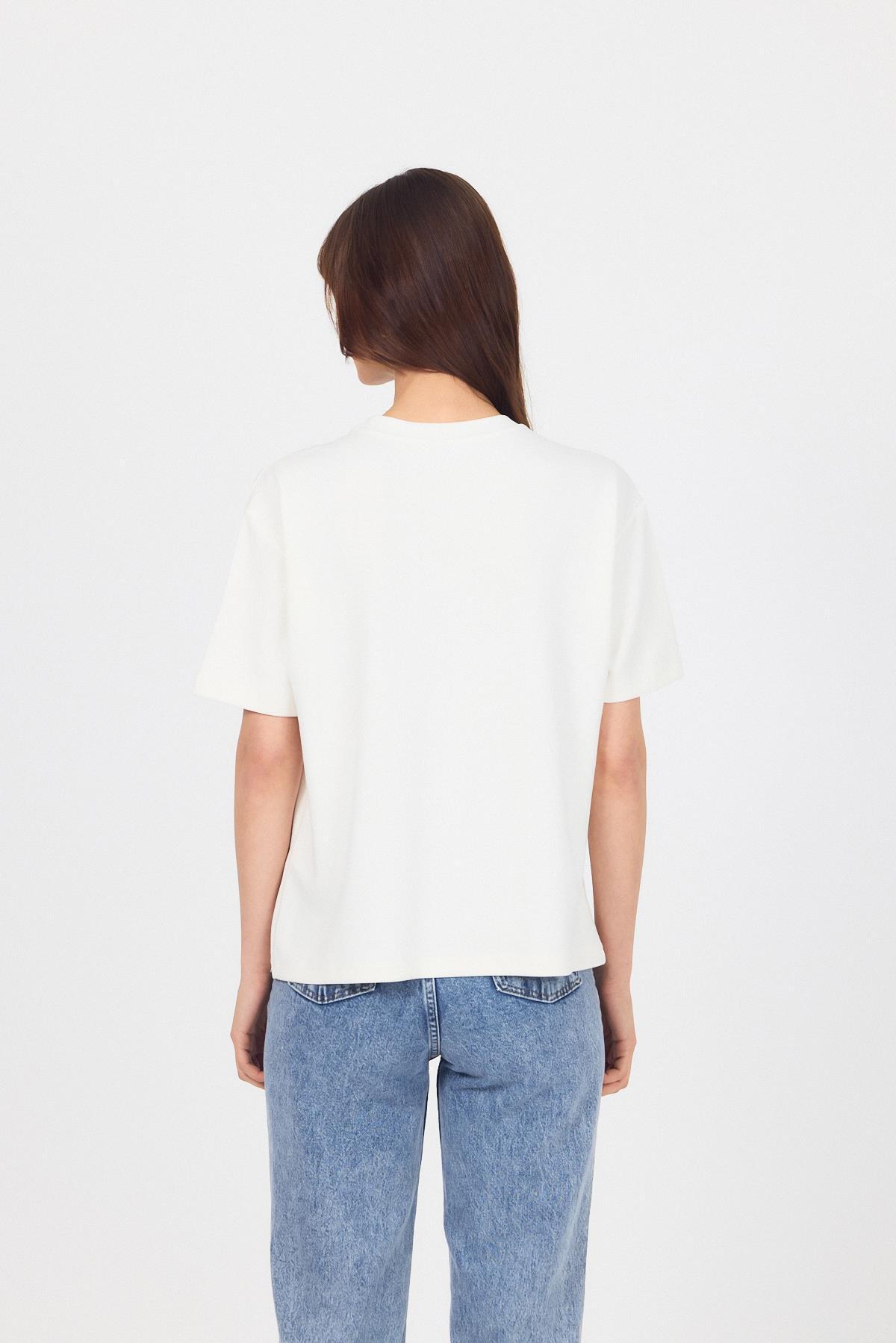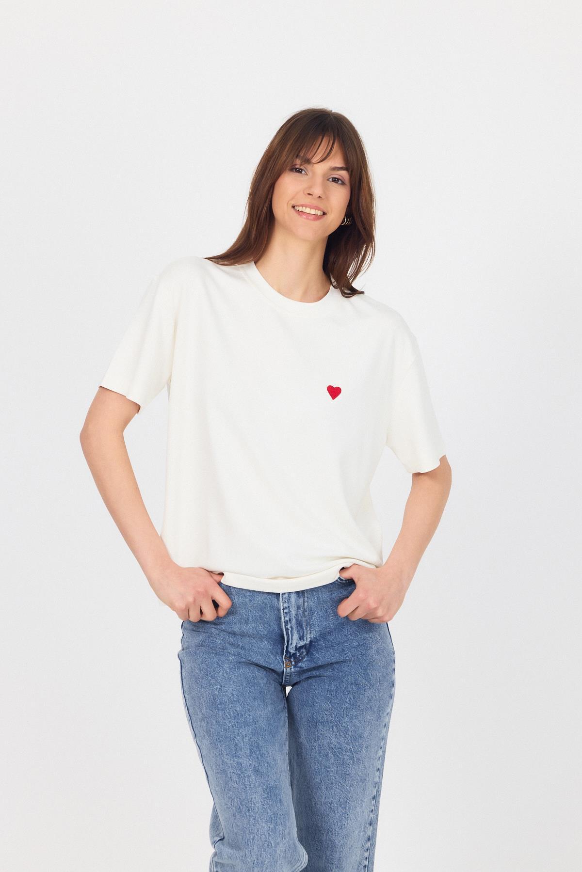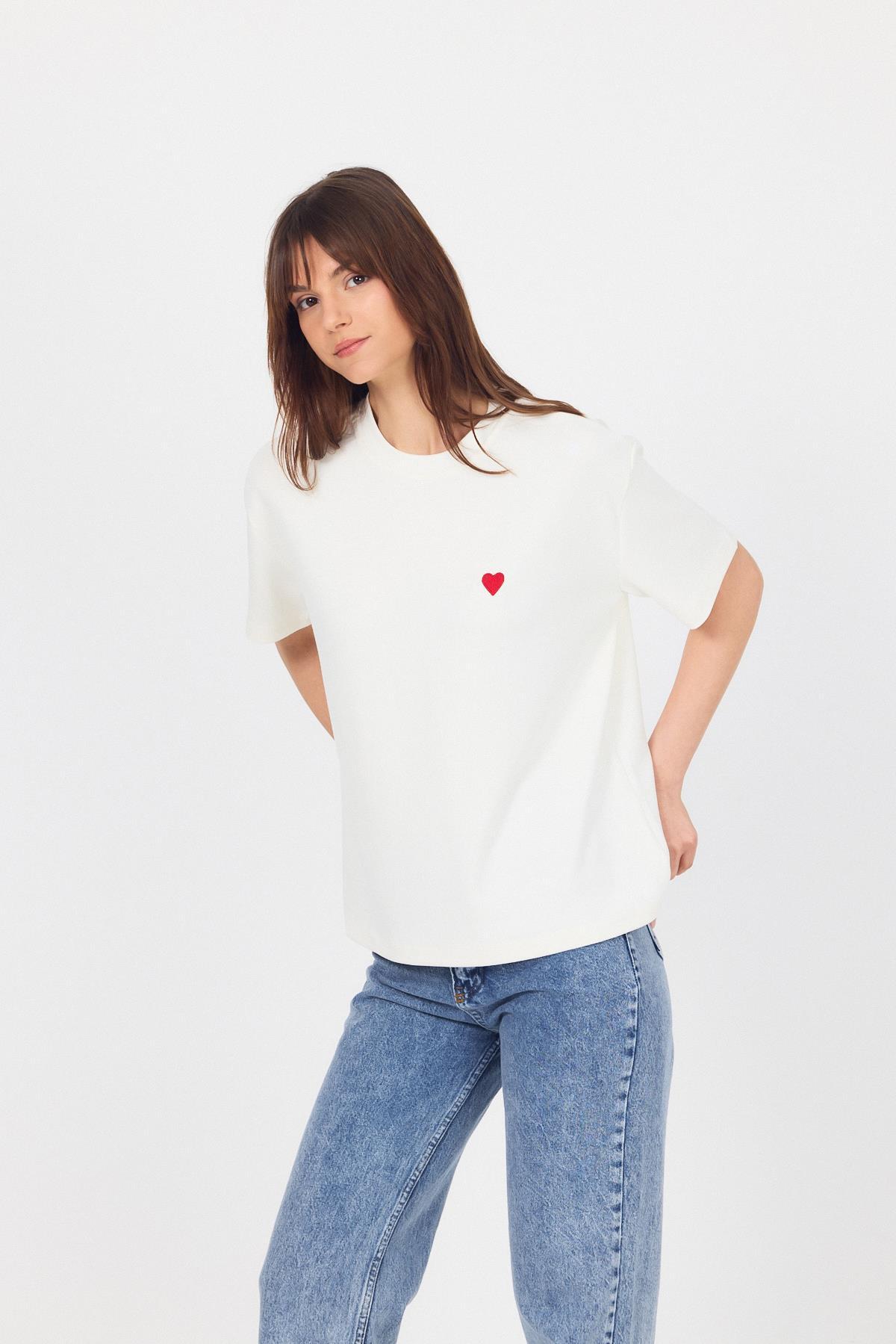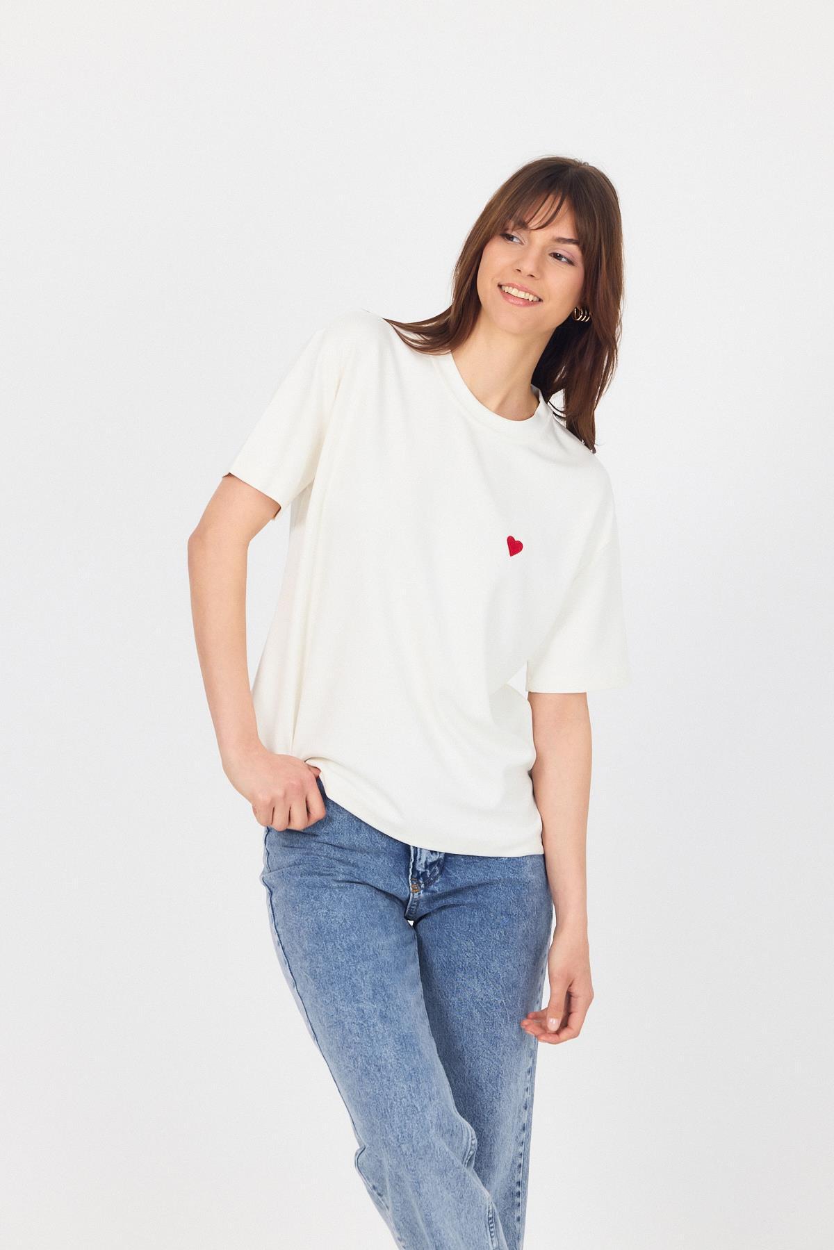 Ekru Kalp Nakışlı Premium Kumaş Tişört 6218
