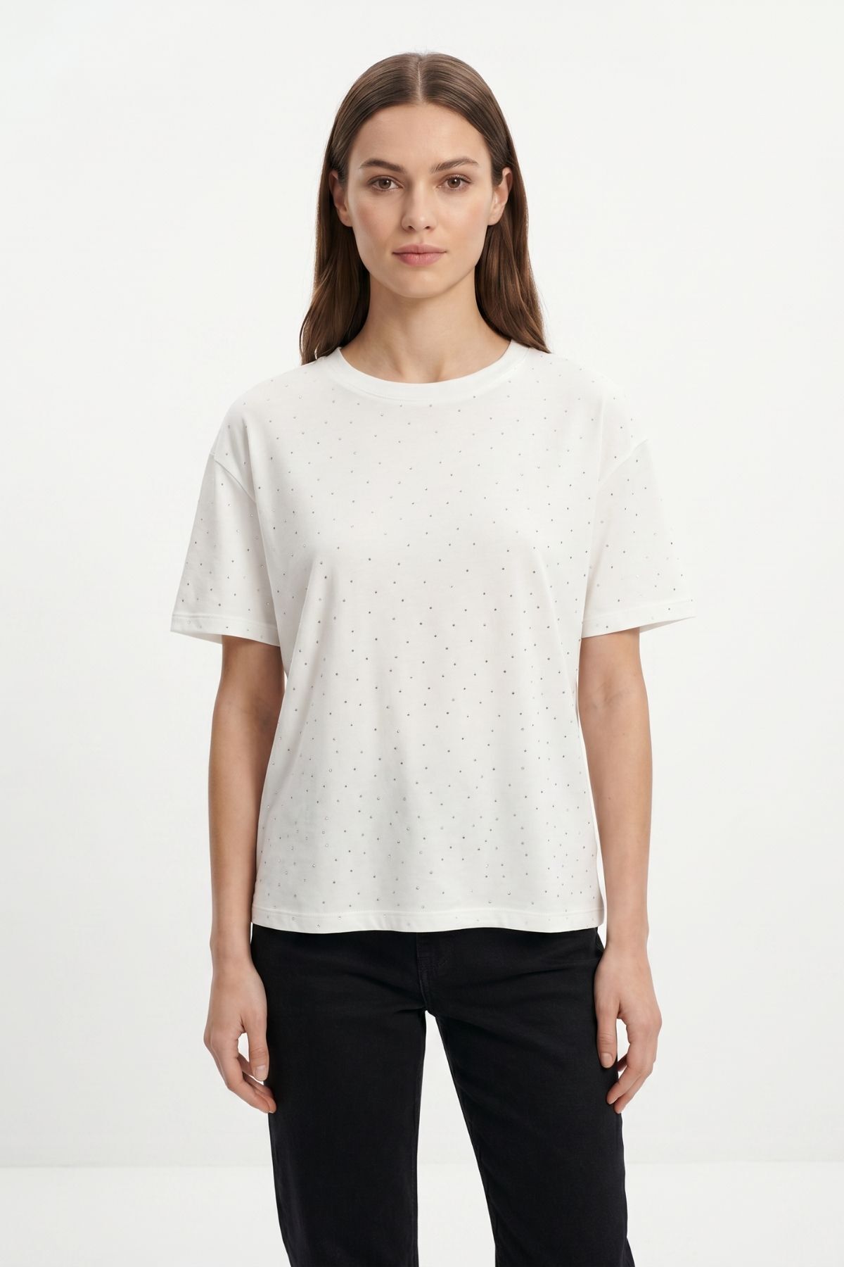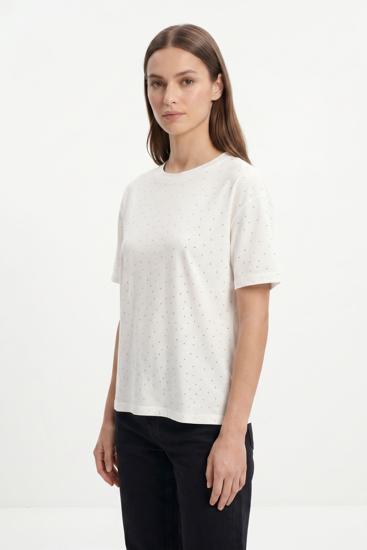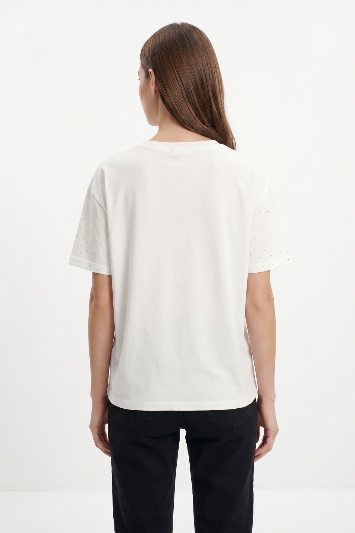 Ekru Taşlı Bisiklet Yaka Tişört 1762