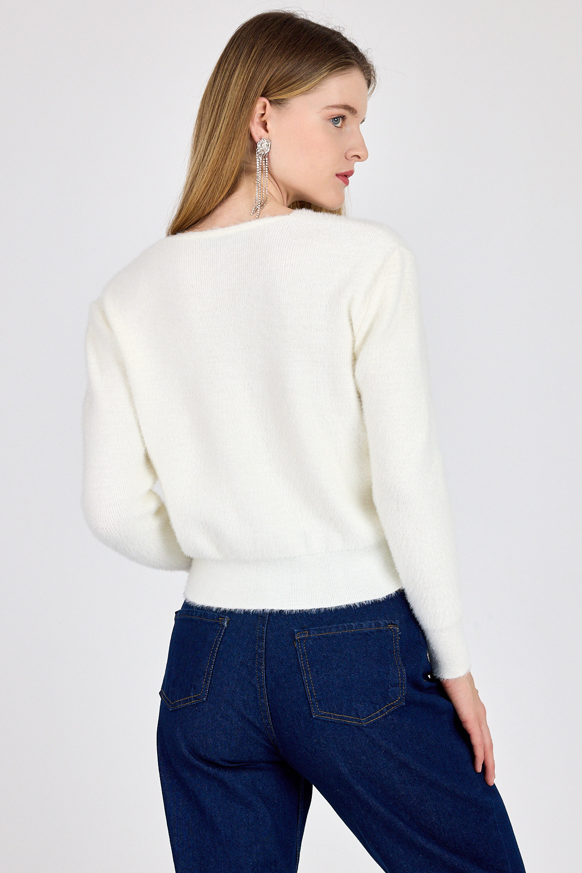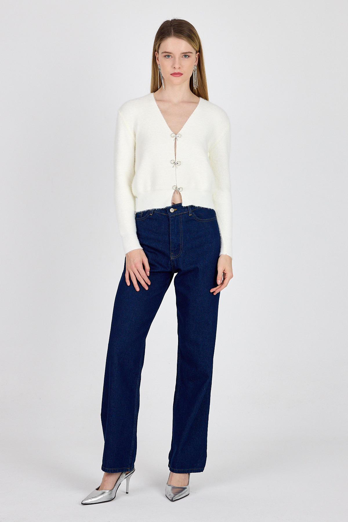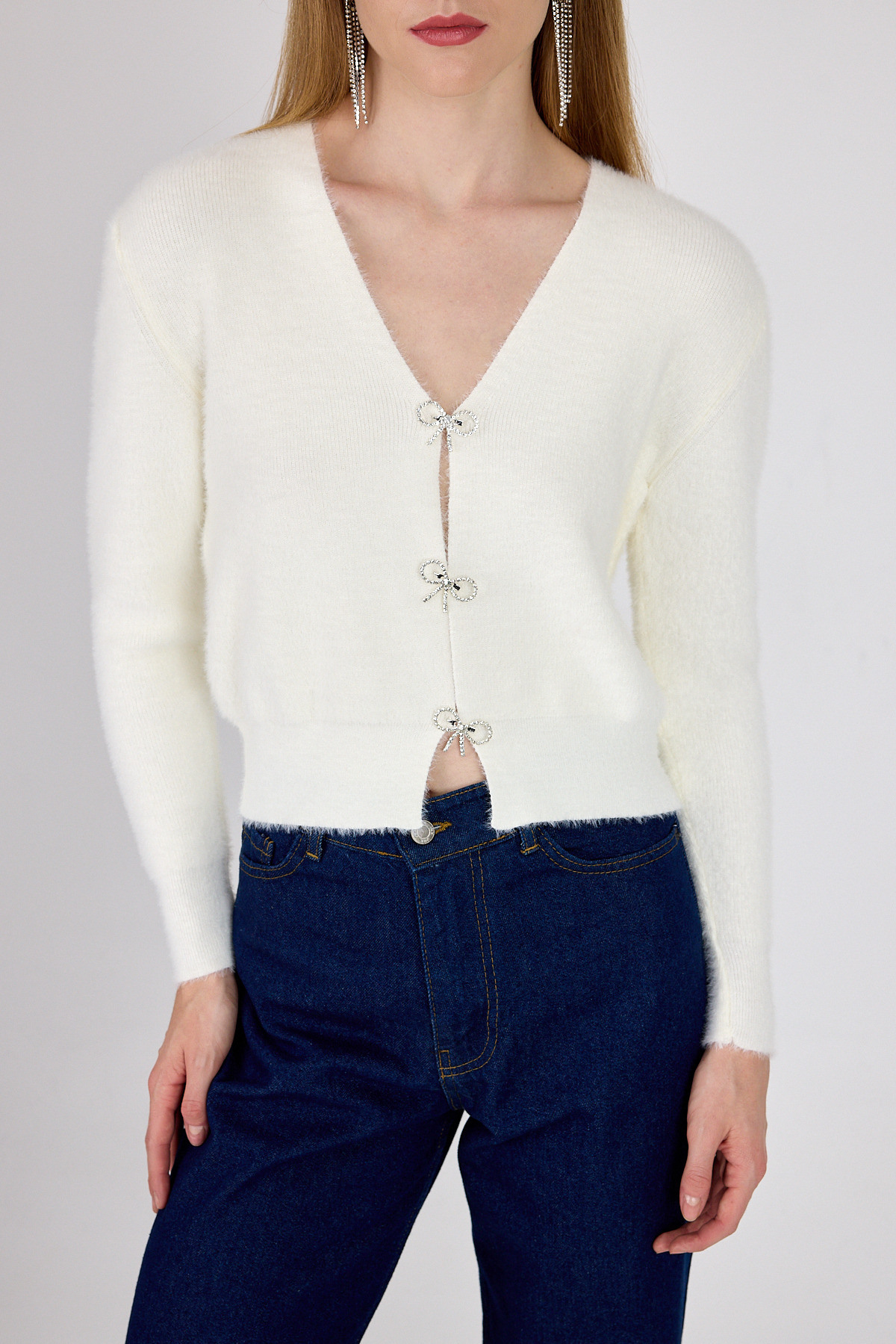 Ekru Taşlı Fiyonk Düğmeli Kadın Triko Hırka 6803