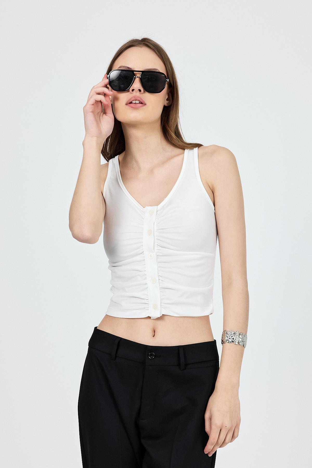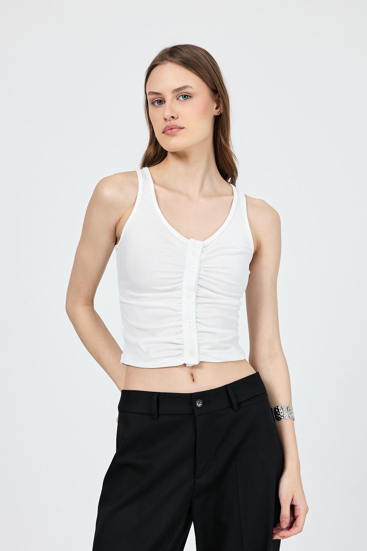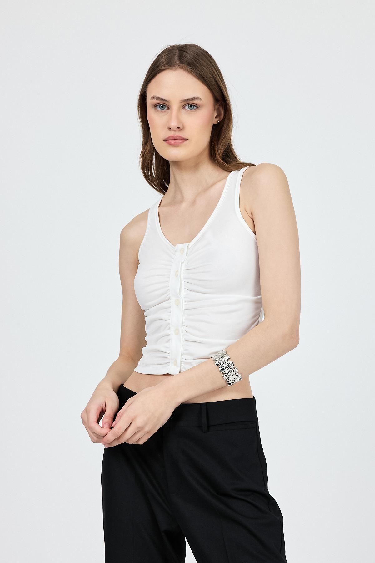 Ekru U Yaka Büzgülü Düğmeli Atlet 13298