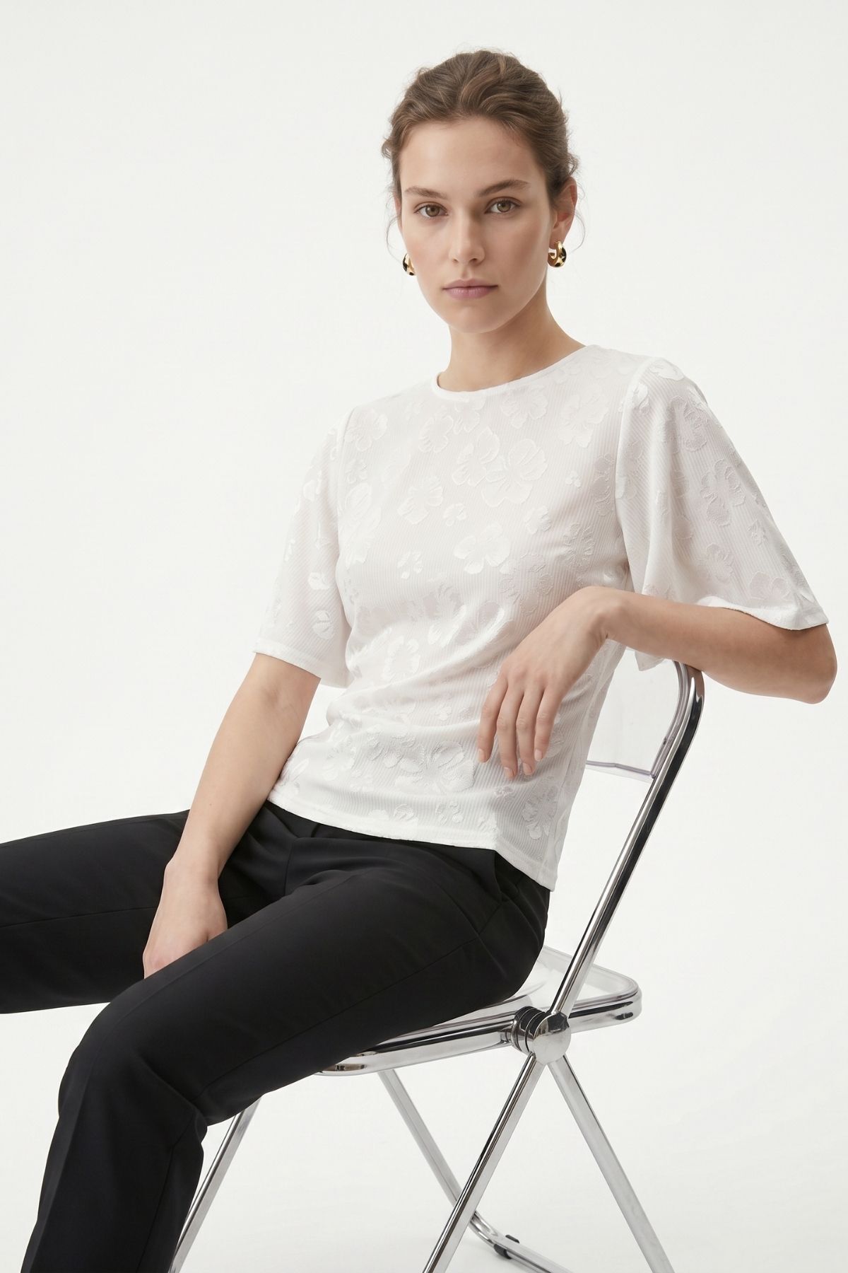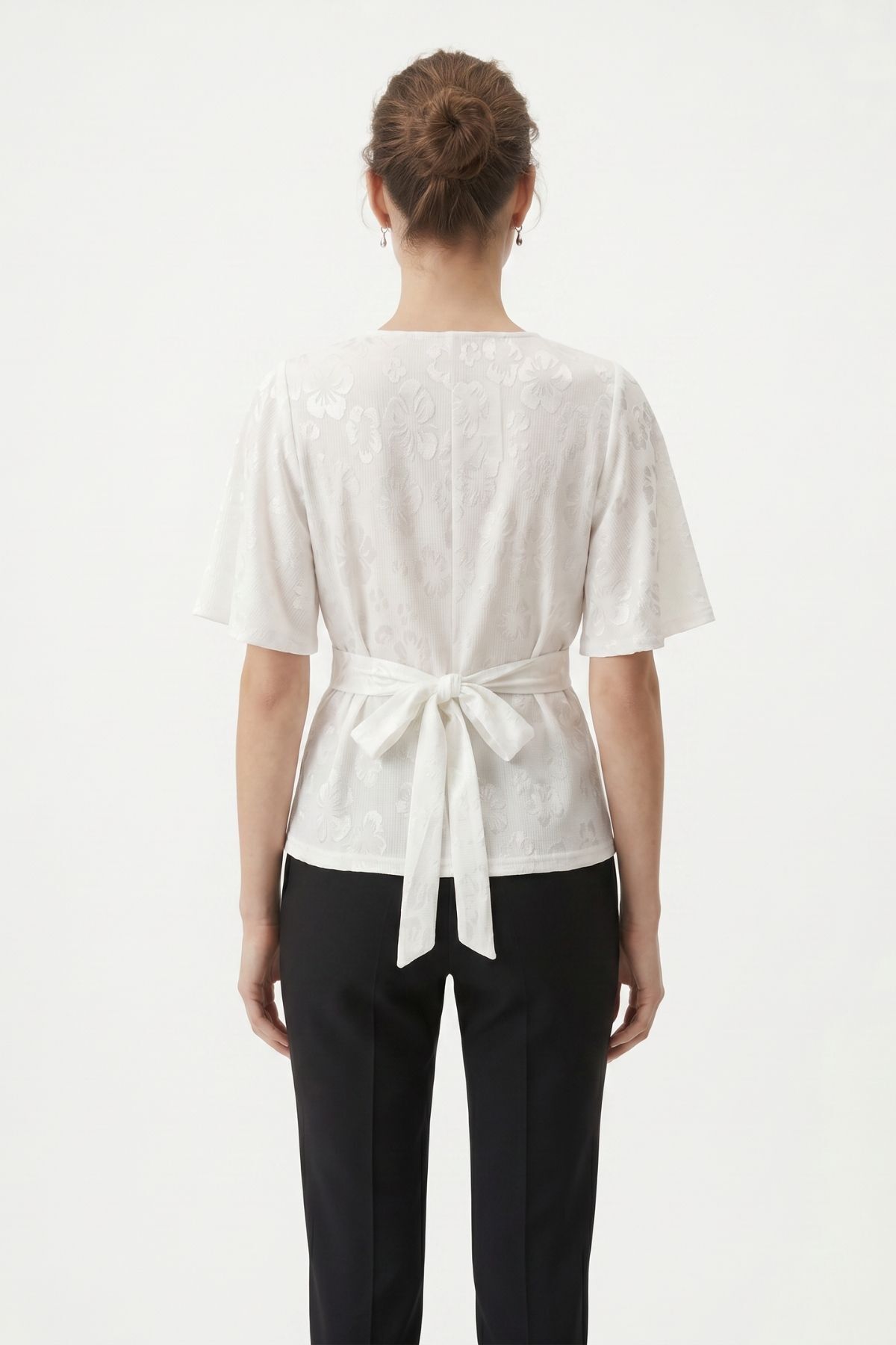 Ekru Volan Kollu Sırt Bağlamalı Jakarlı Bluz 261151