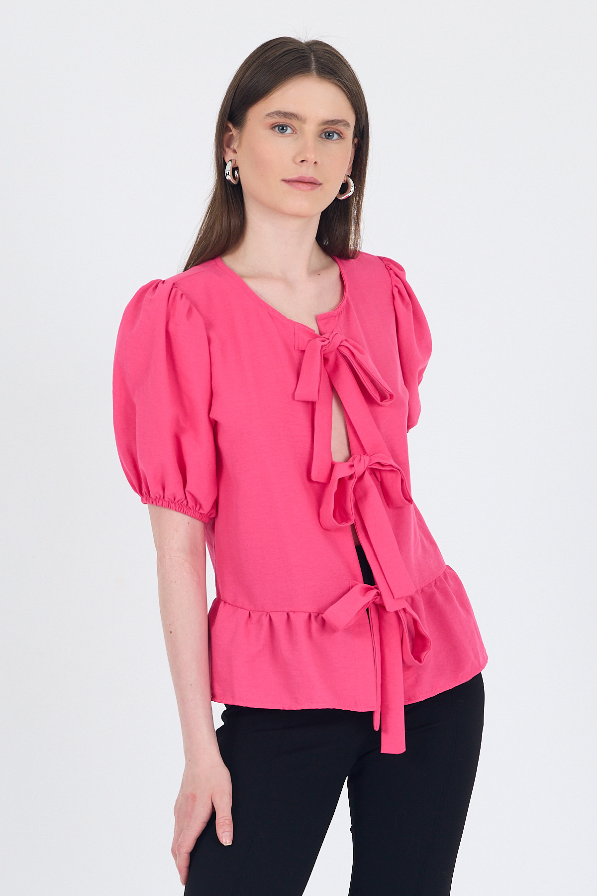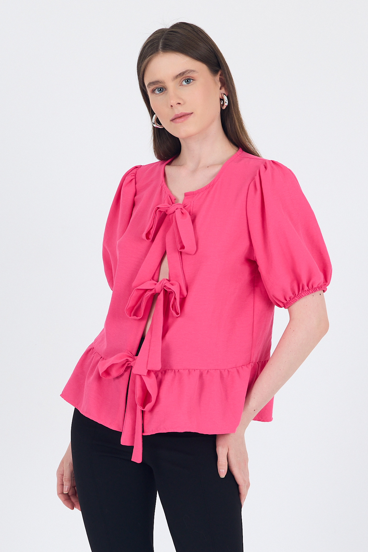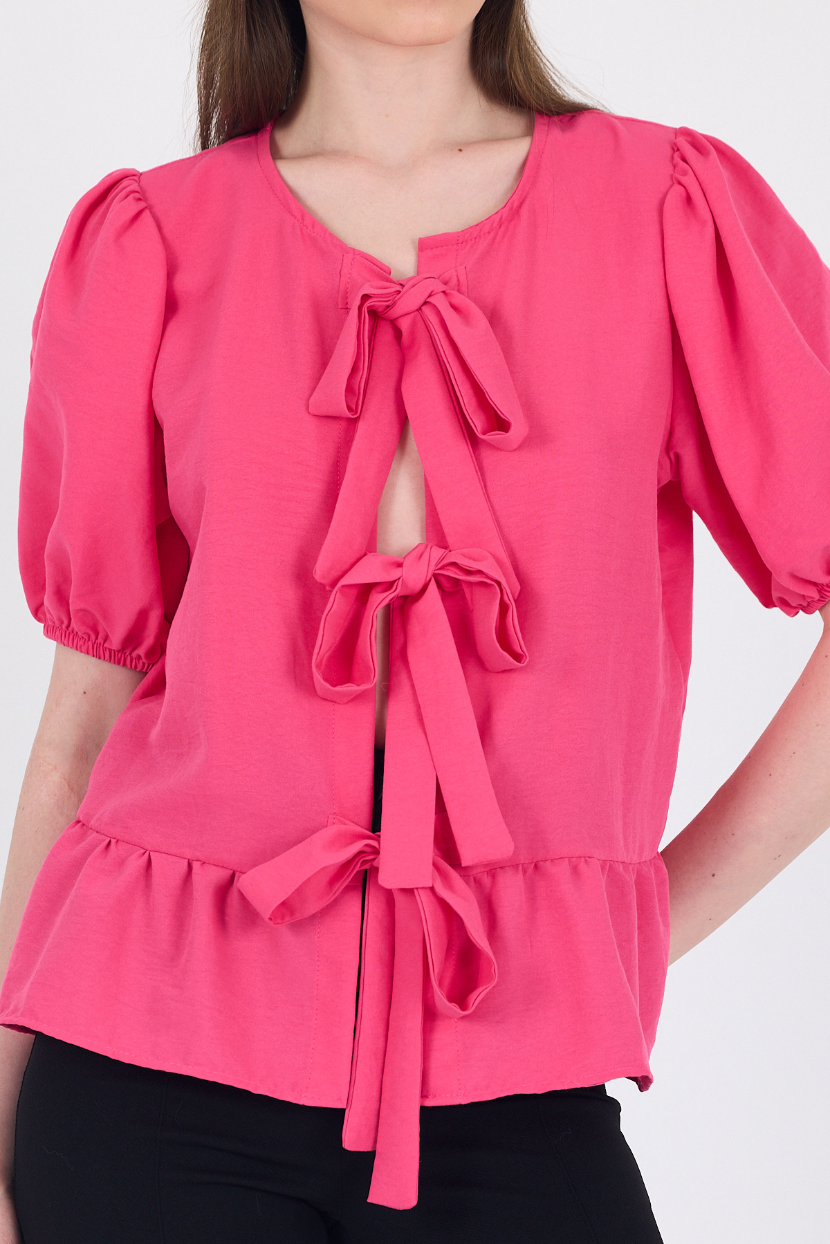 Fuşya Bağlama Detaylı Balon Kollu Bluz 4334A