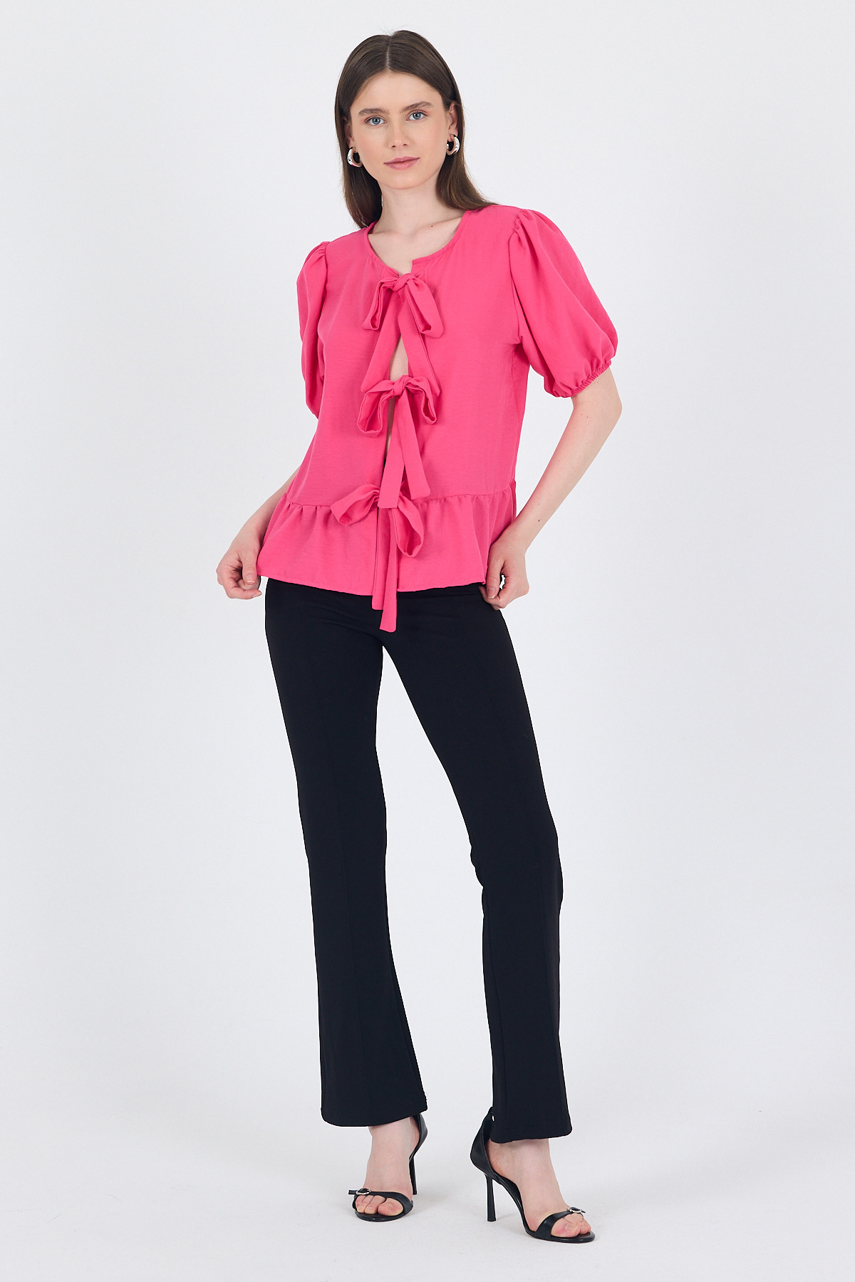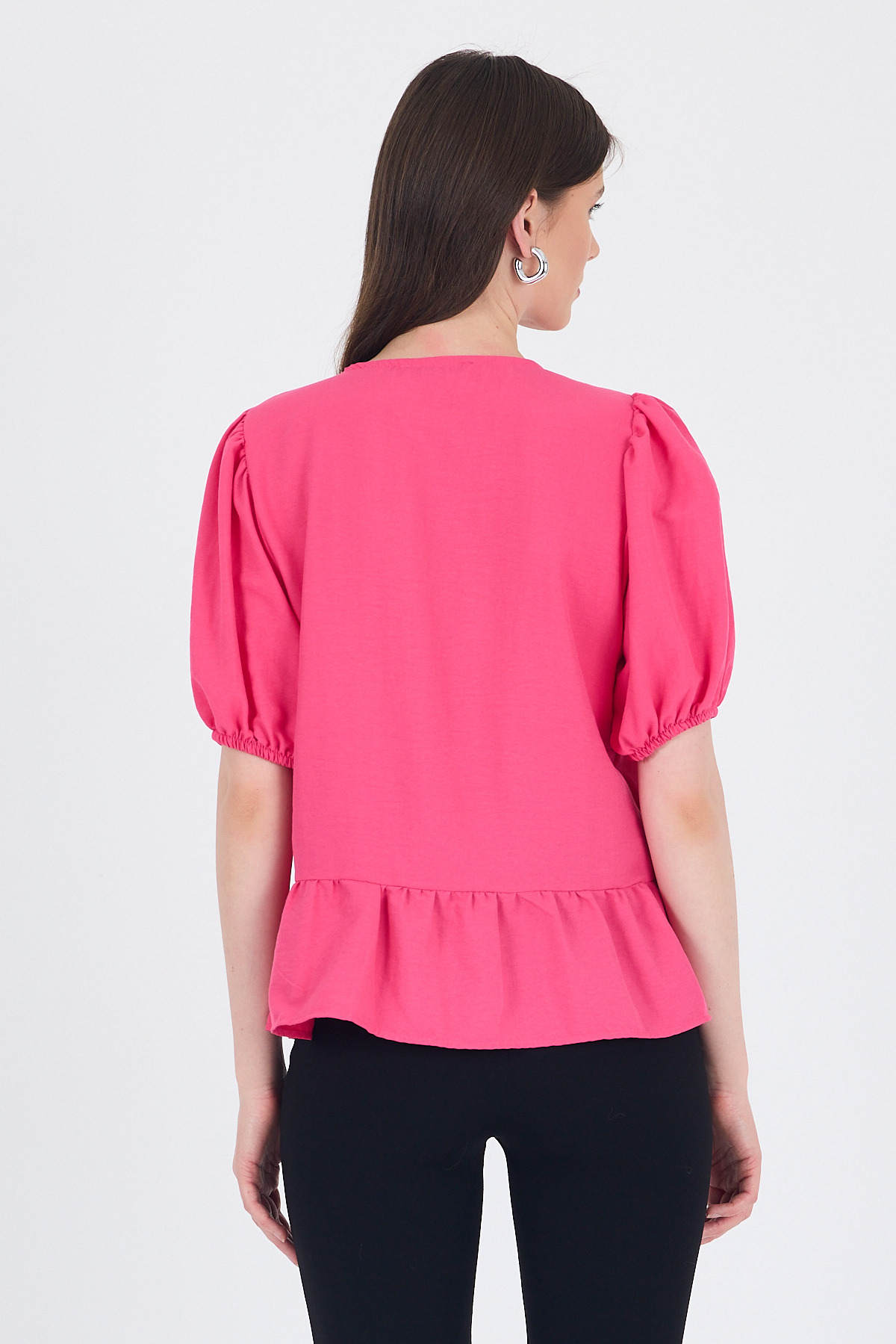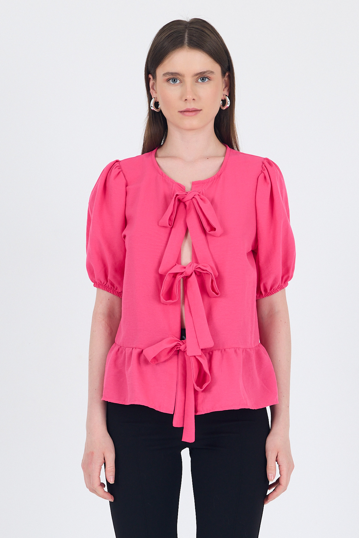 Fuşya Bağlama Detaylı Balon Kollu Bluz 4334A