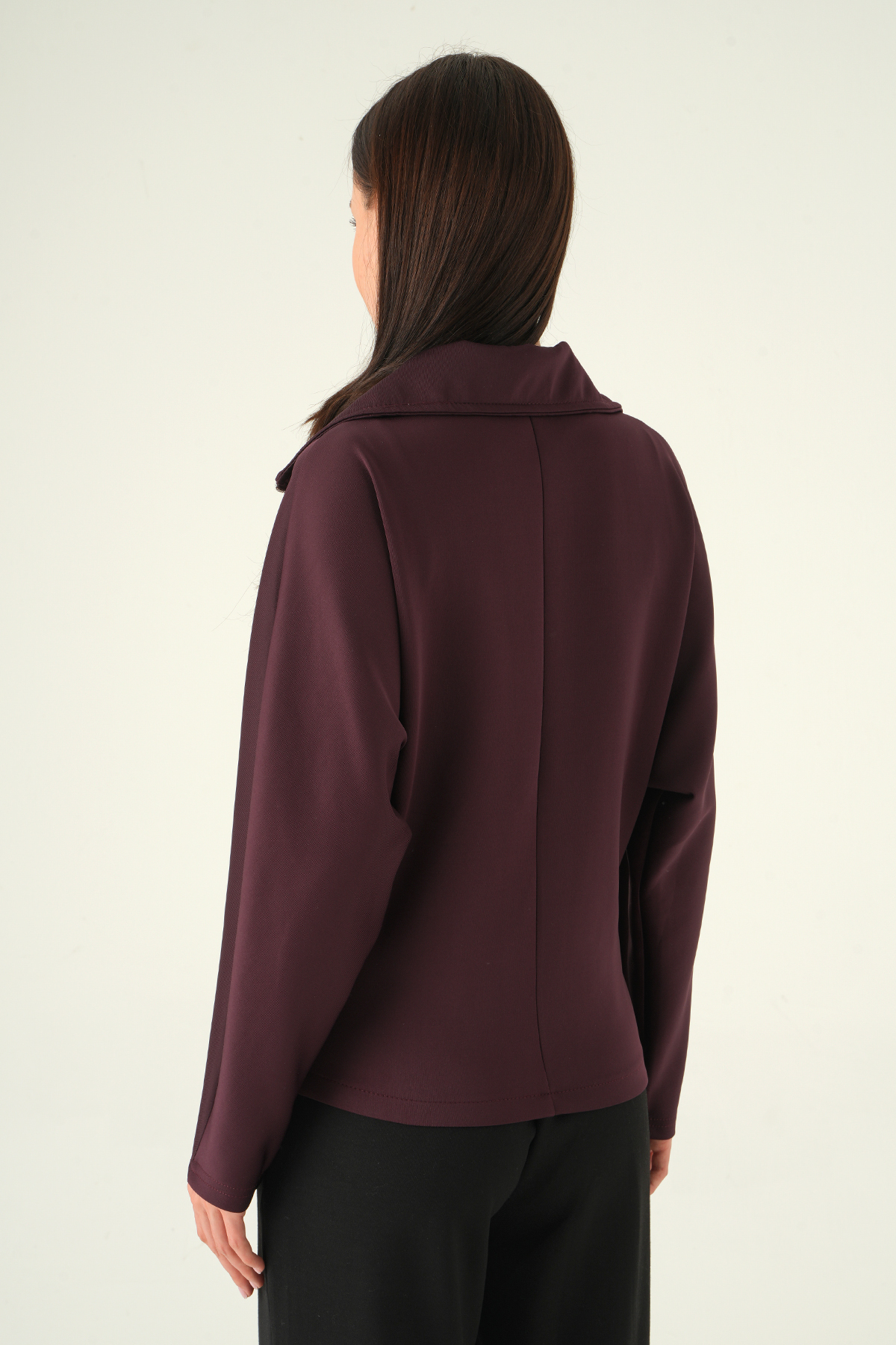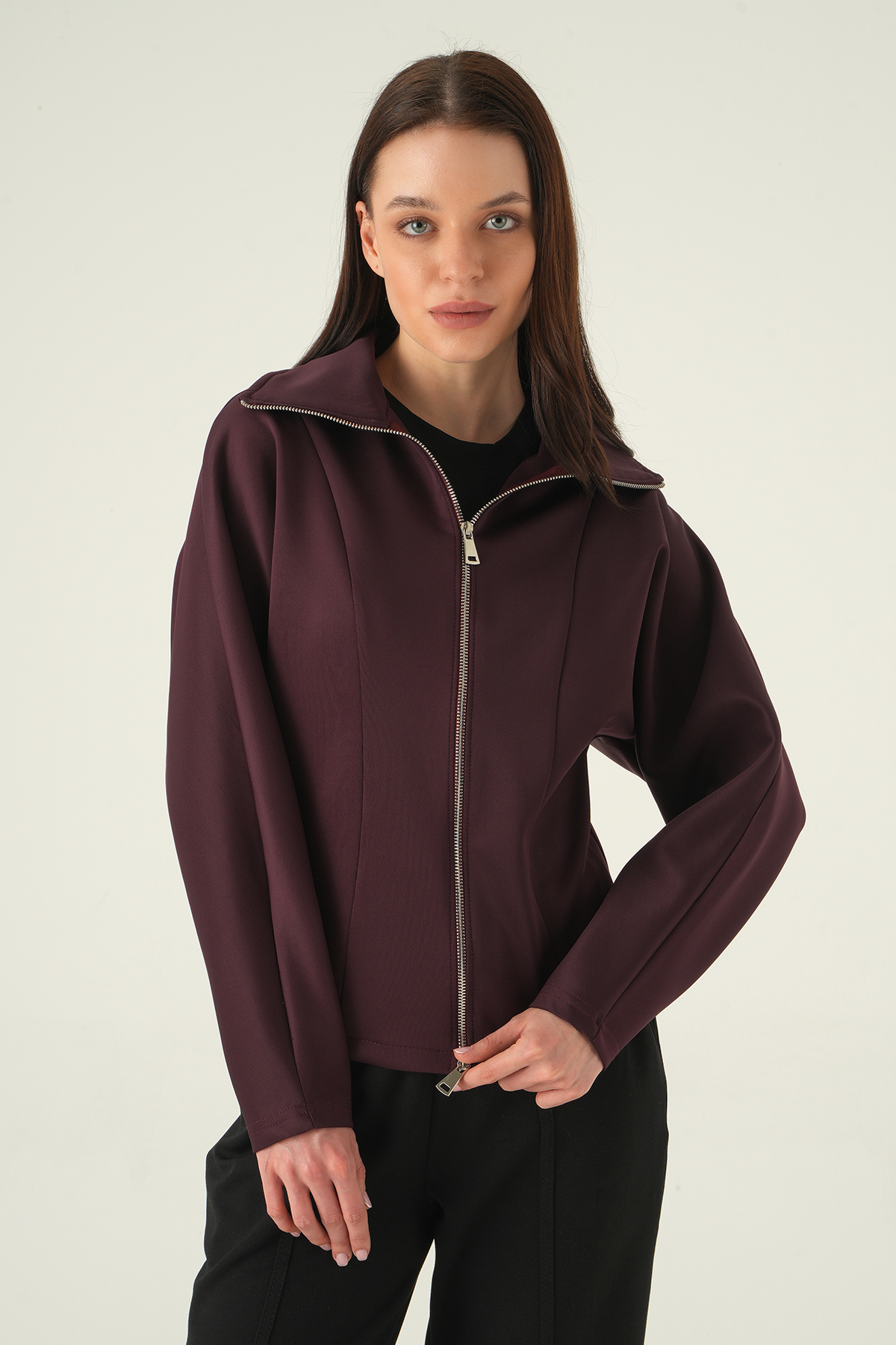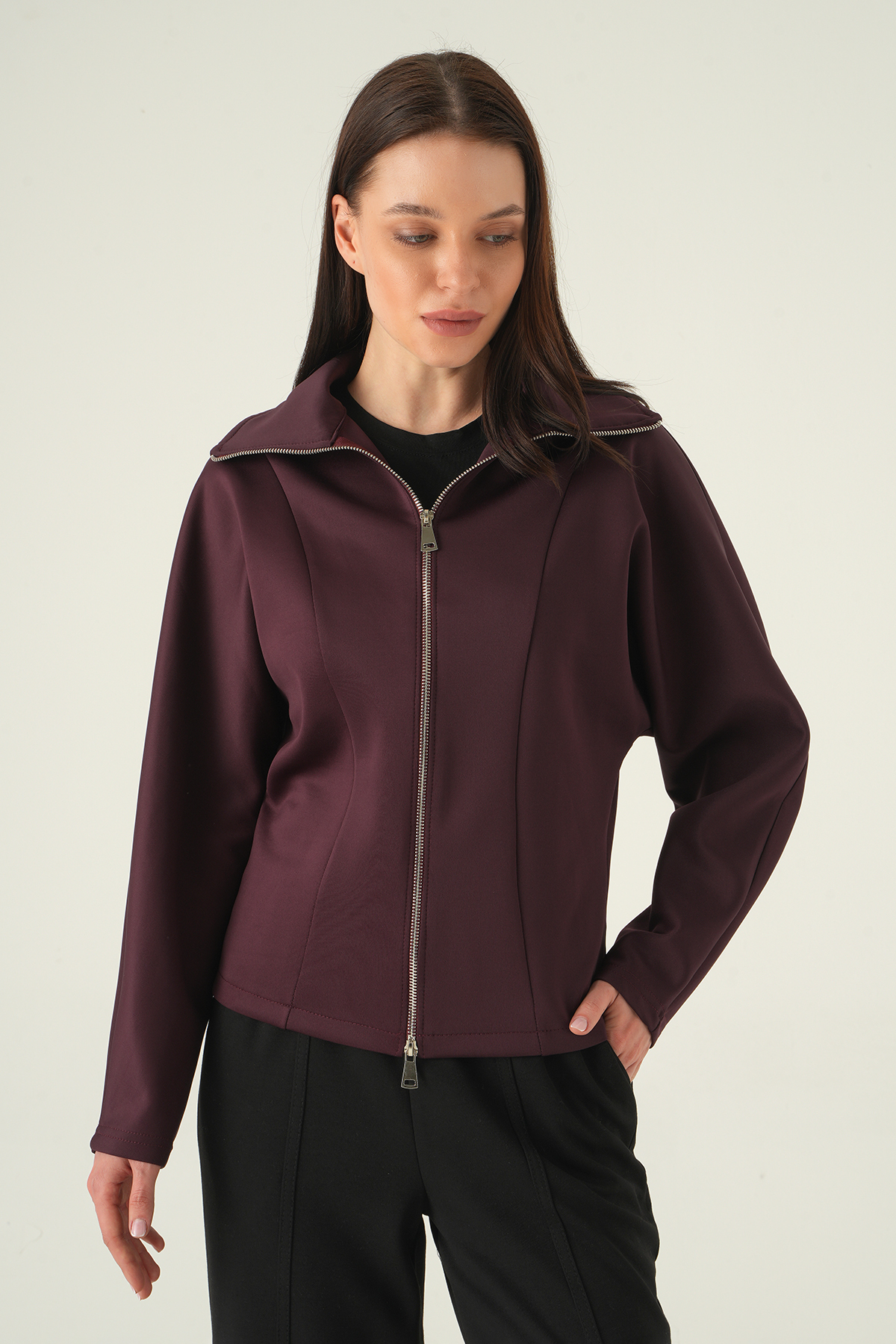 Gömlek Yaka Fermuarlı Hırka Mürdüm 8366A