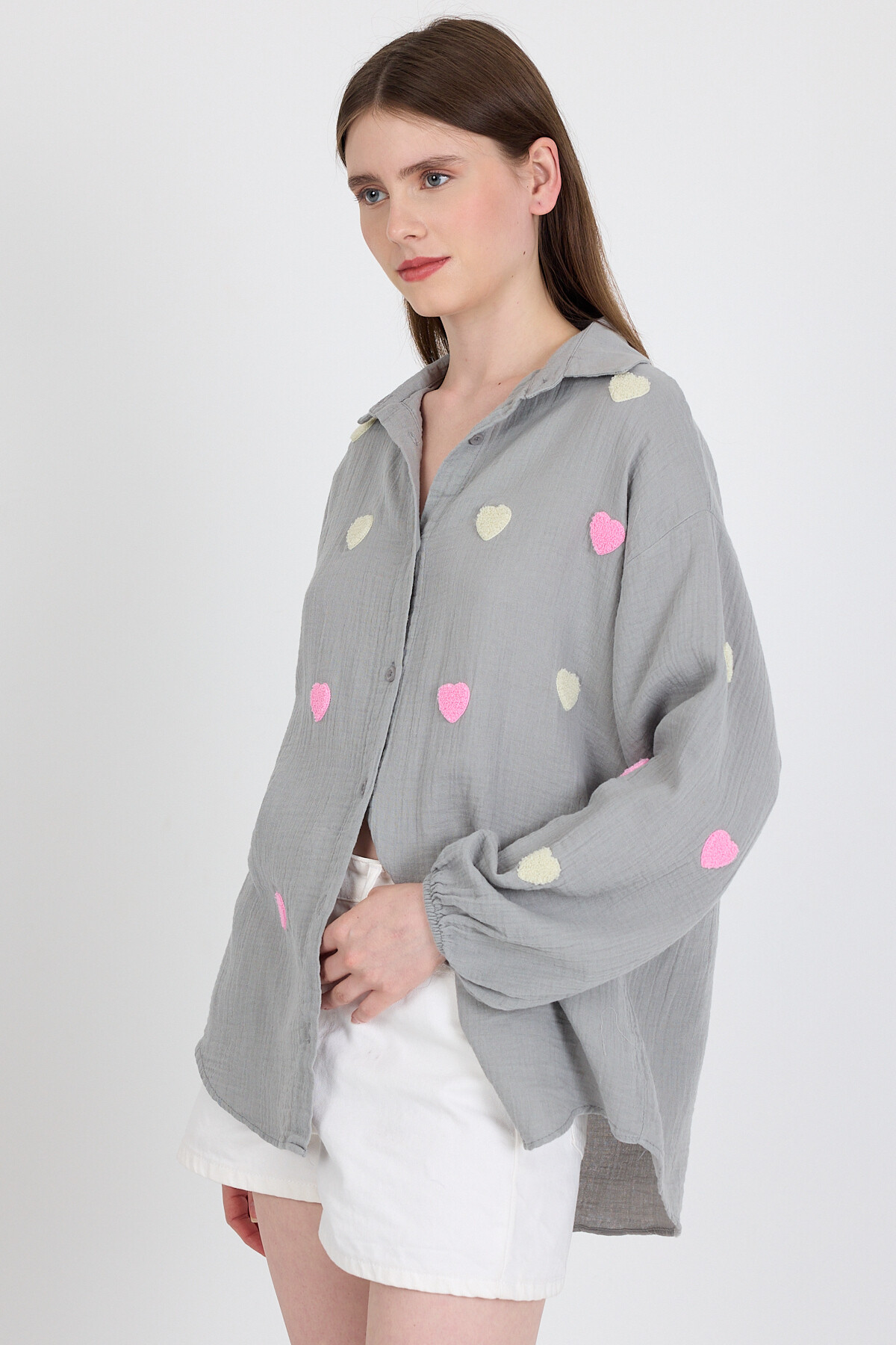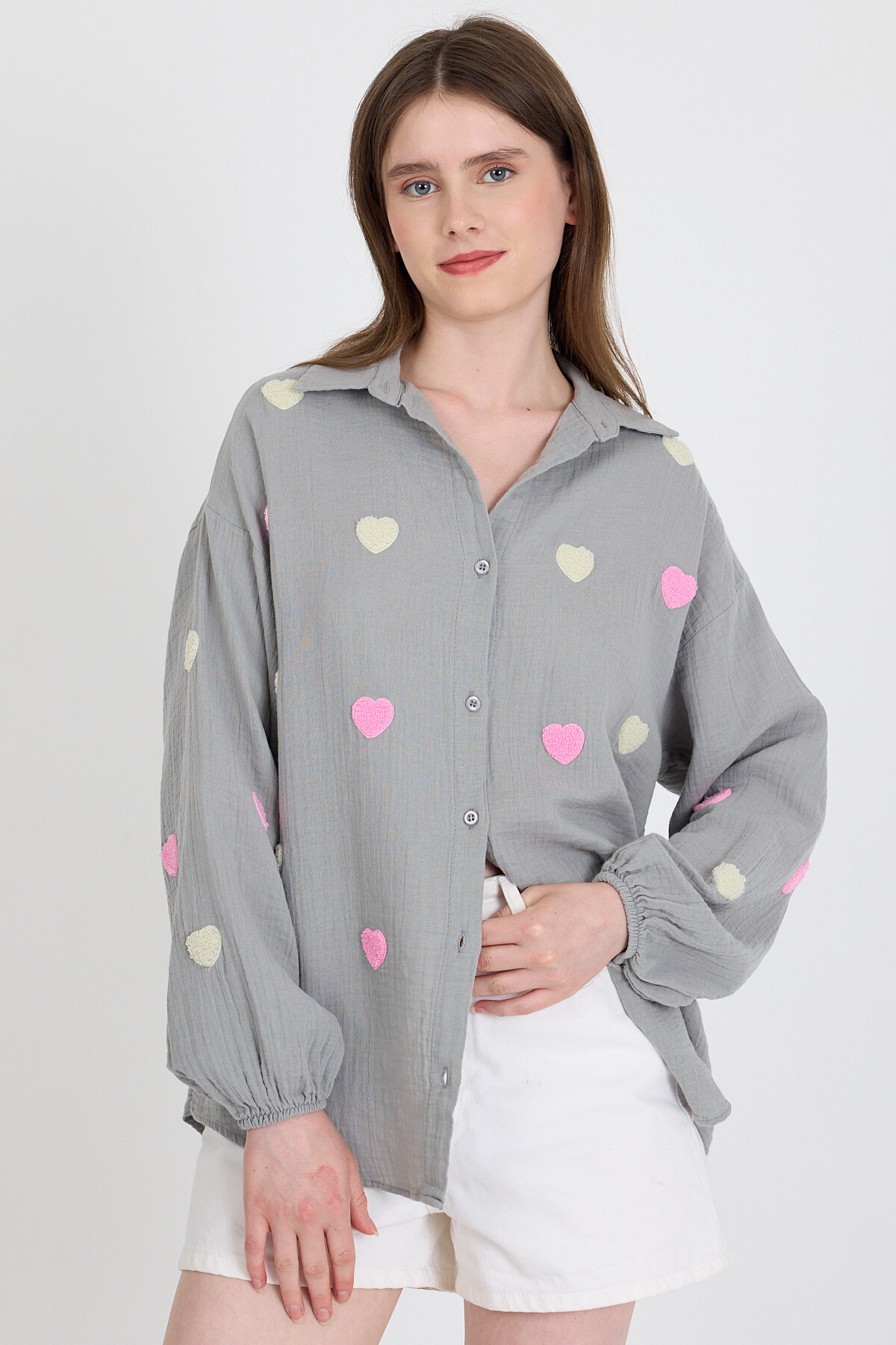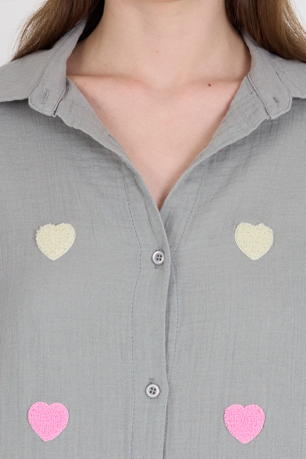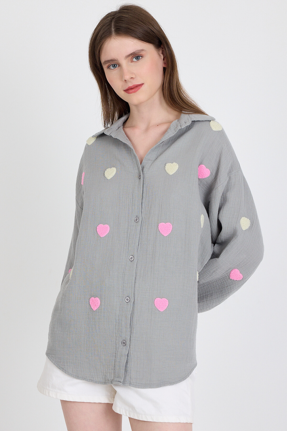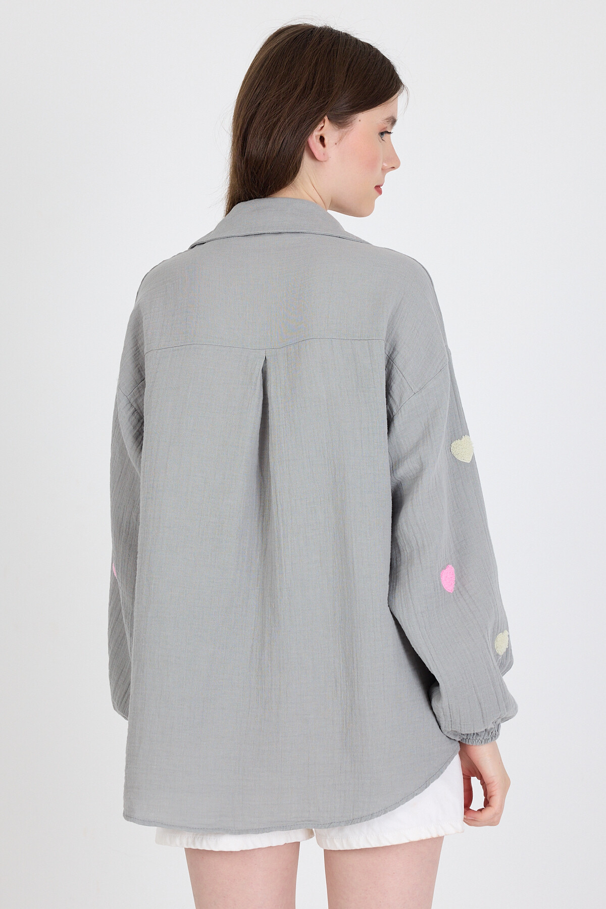 Gri %100 Pamuk Kalp Nakışlı Gömlek 4797A