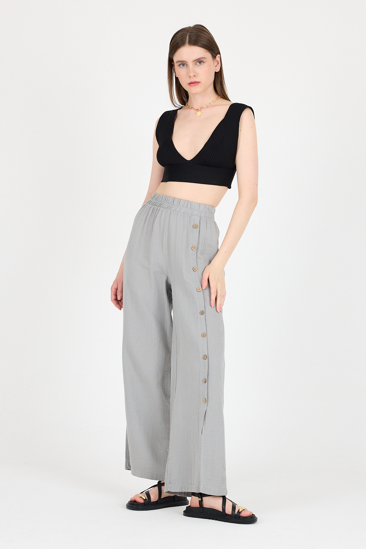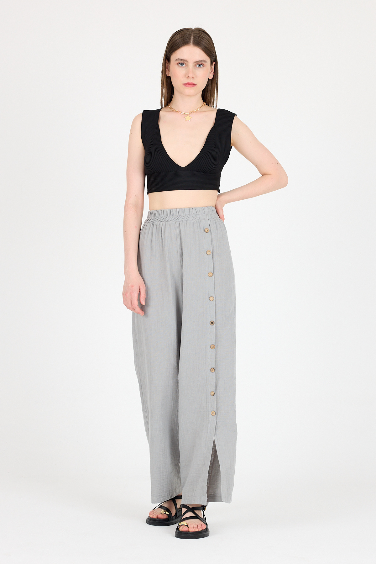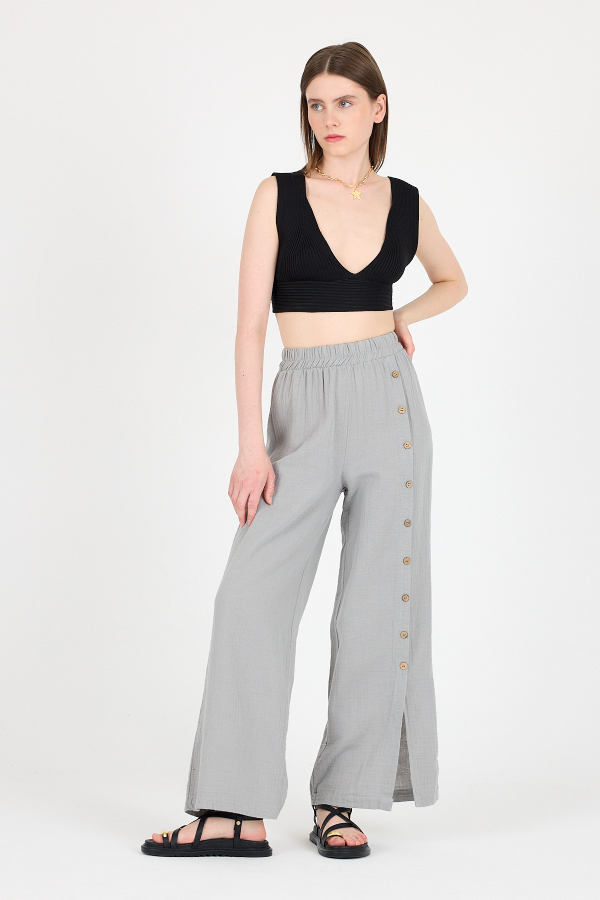 Gri %100 Pamuk Müslin Yanı Düğmeli Yırtmaçlı Geniş Paça Pantolon 4704A