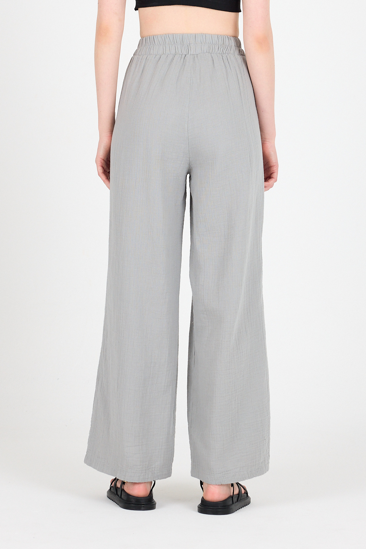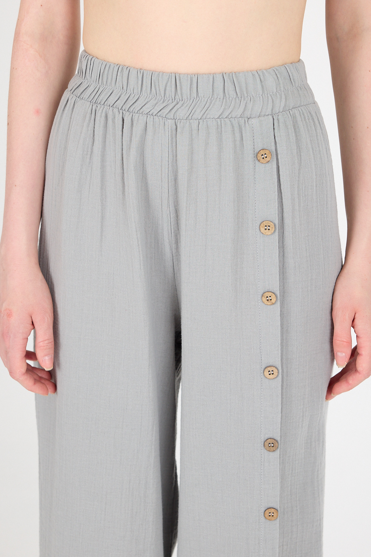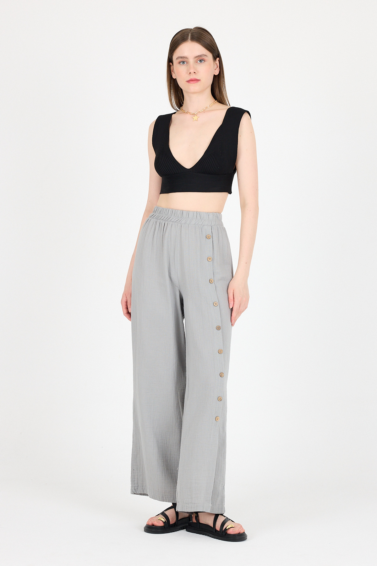 Gri %100 Pamuk Müslin Yanı Düğmeli Yırtmaçlı Geniş Paça Pantolon 4704A