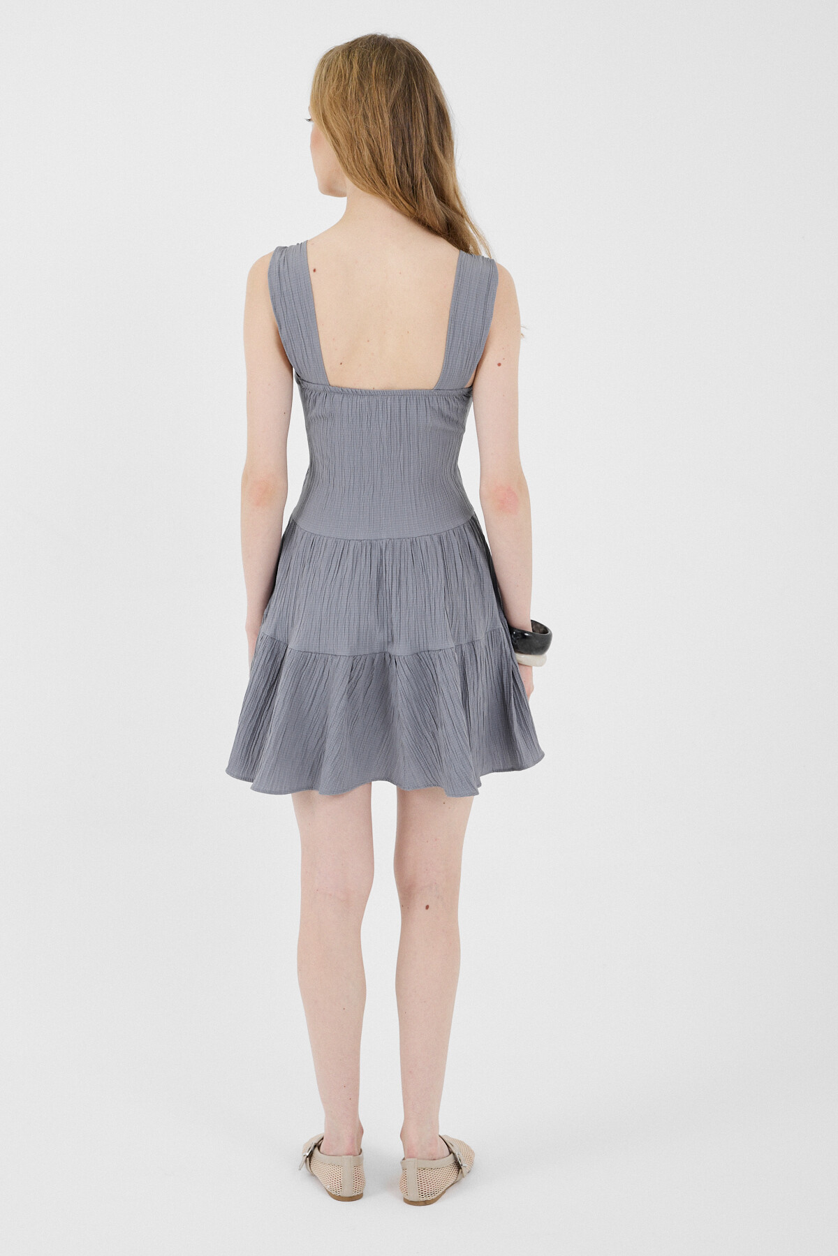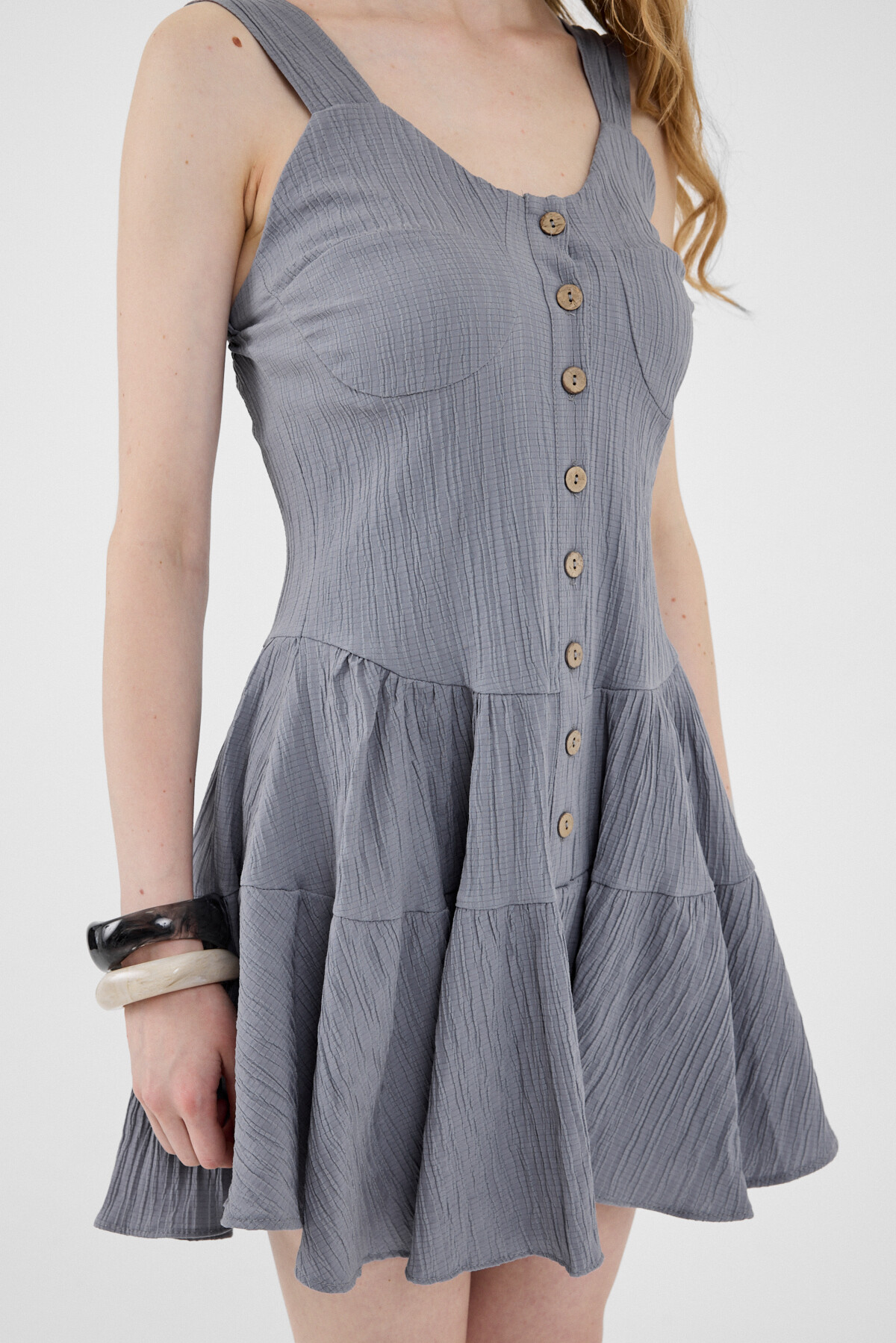 Gri Düğmeli Askılı Kat Etekli Mini Elbise 8042A