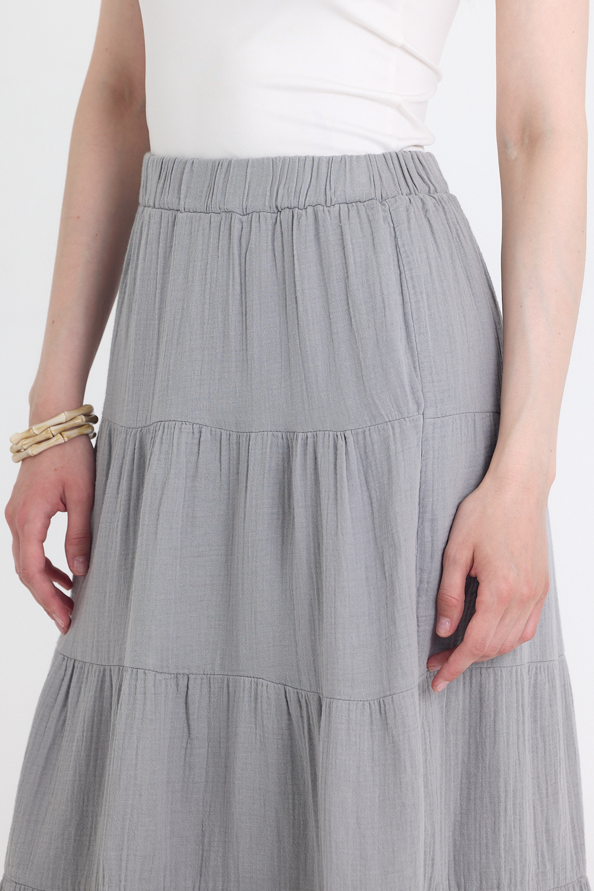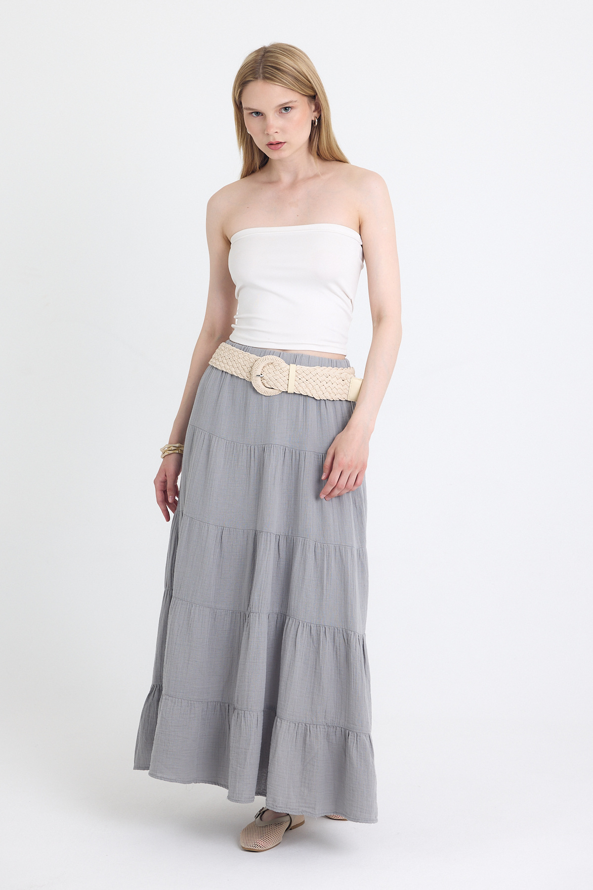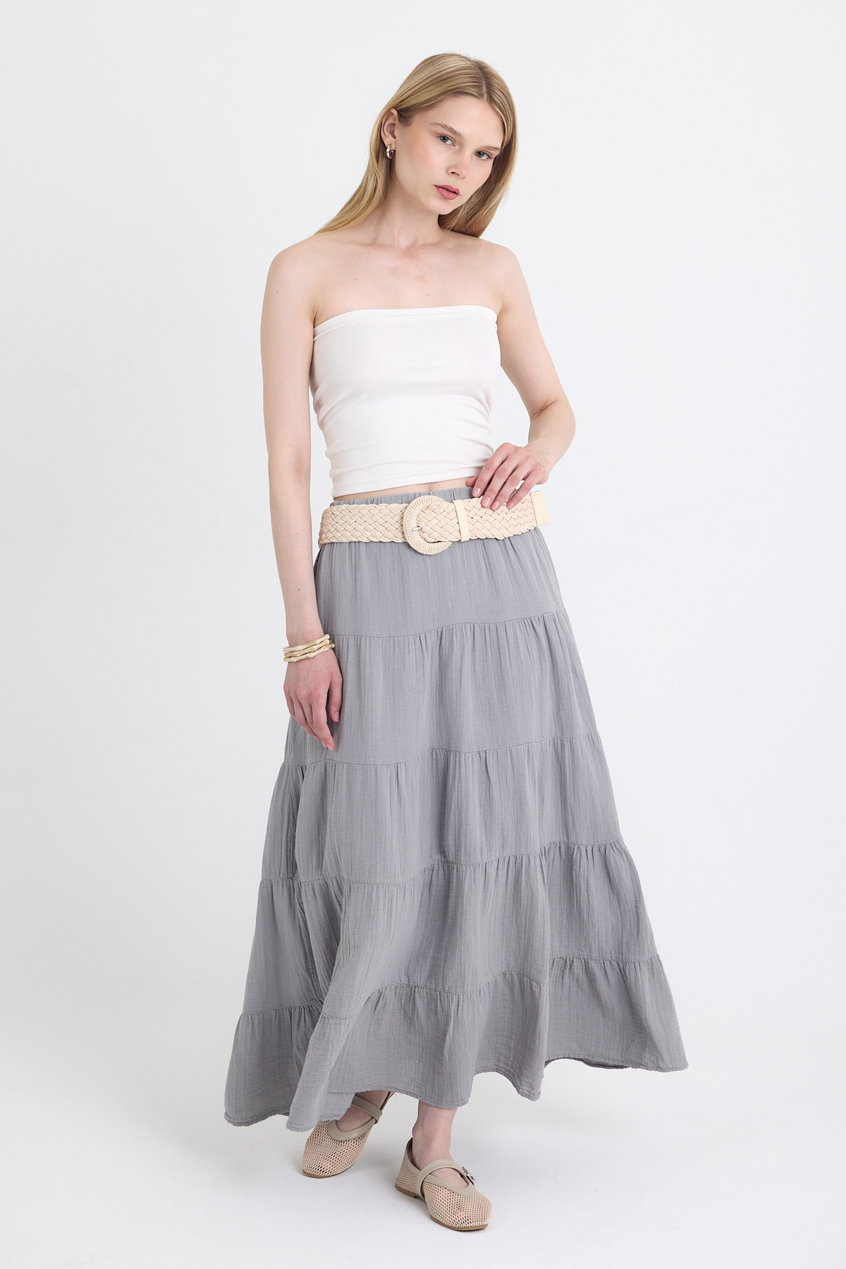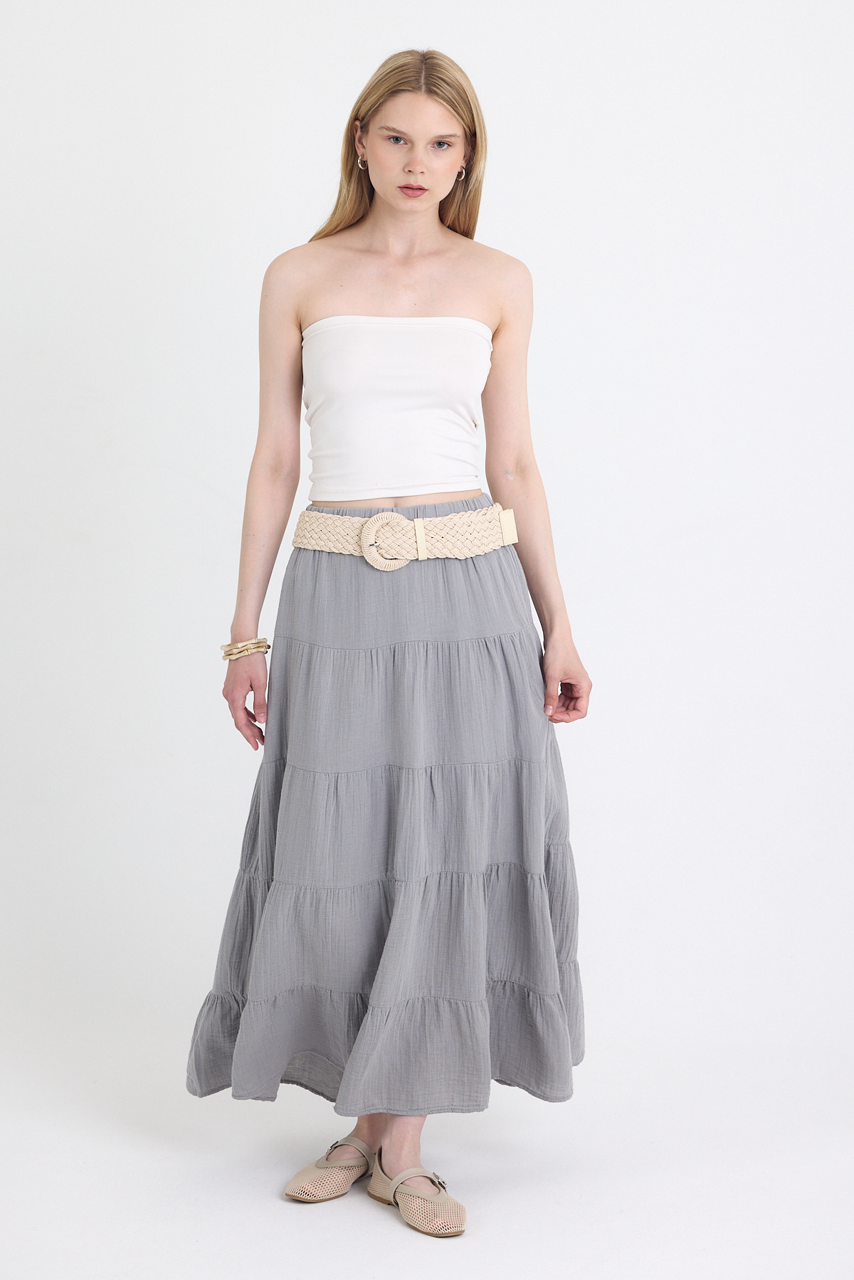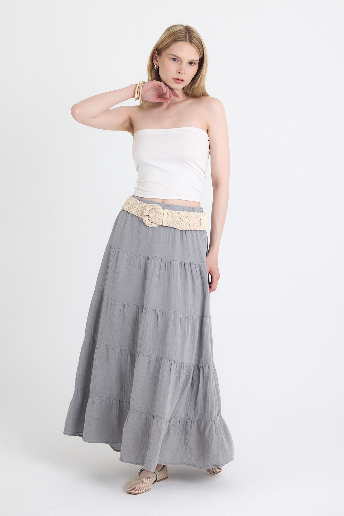 Gri Keten Görünümlü %100 Pamuk Kat Kat Uzun Etek 4801A