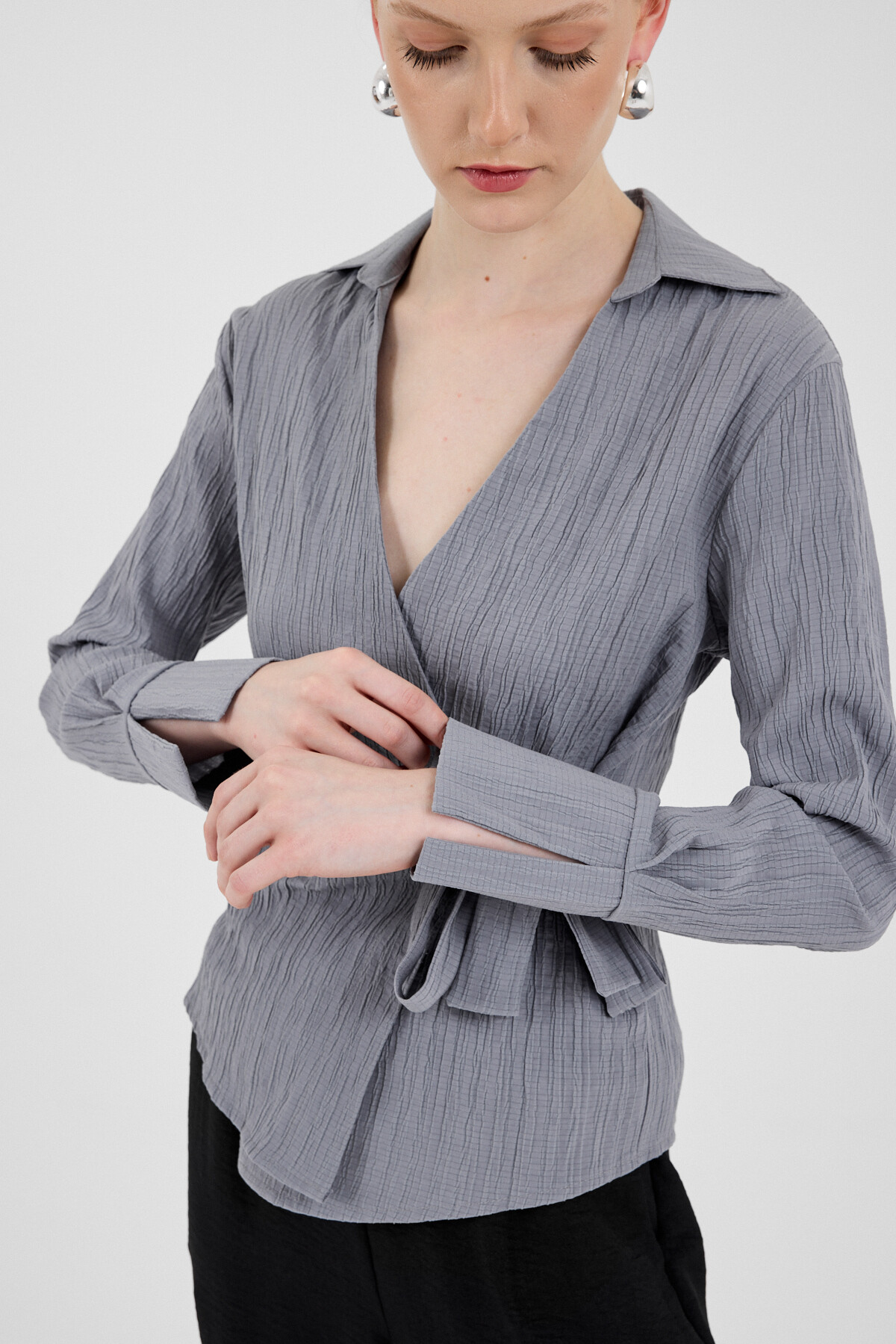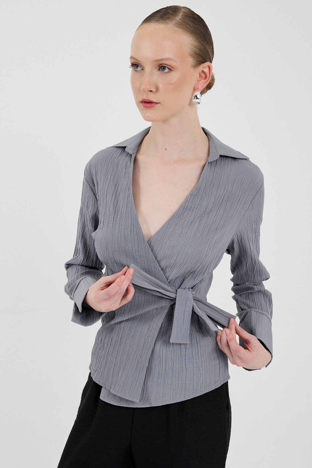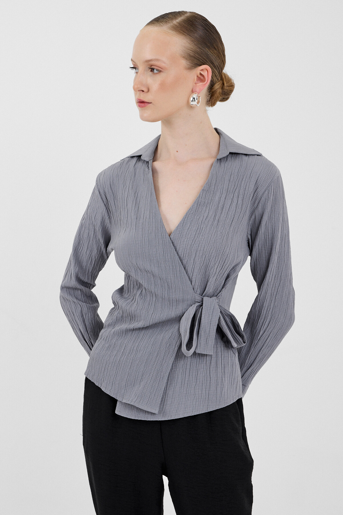 Gri Ön Bağlama Detaylı Uzun Kol Bluz 8019A