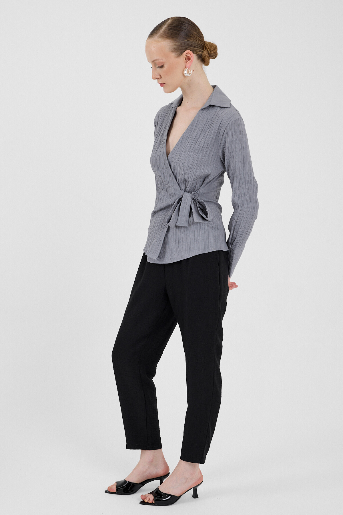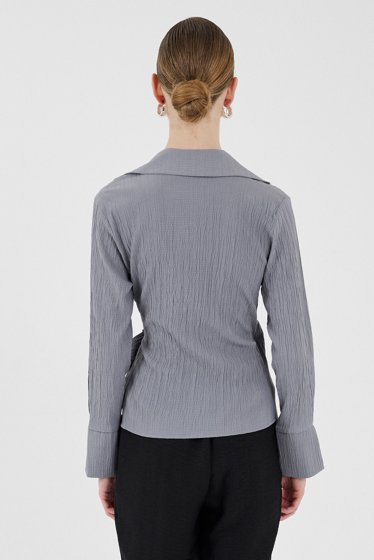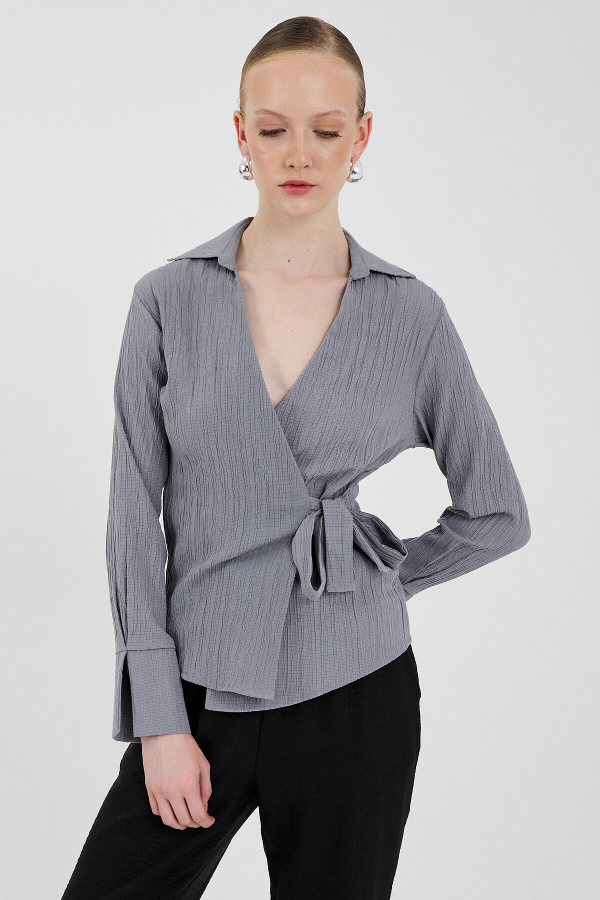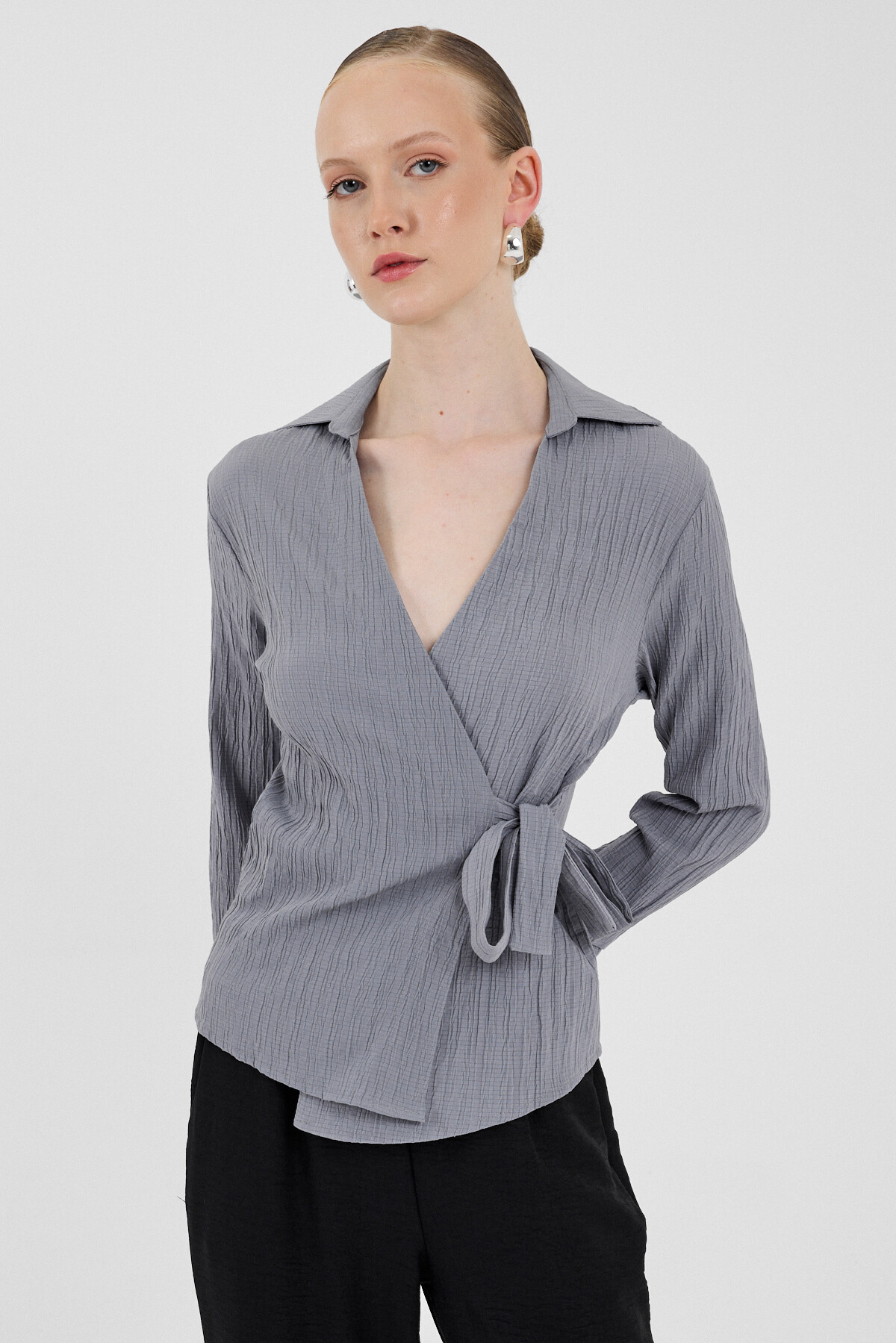 Gri Ön Bağlama Detaylı Uzun Kol Bluz 8019A