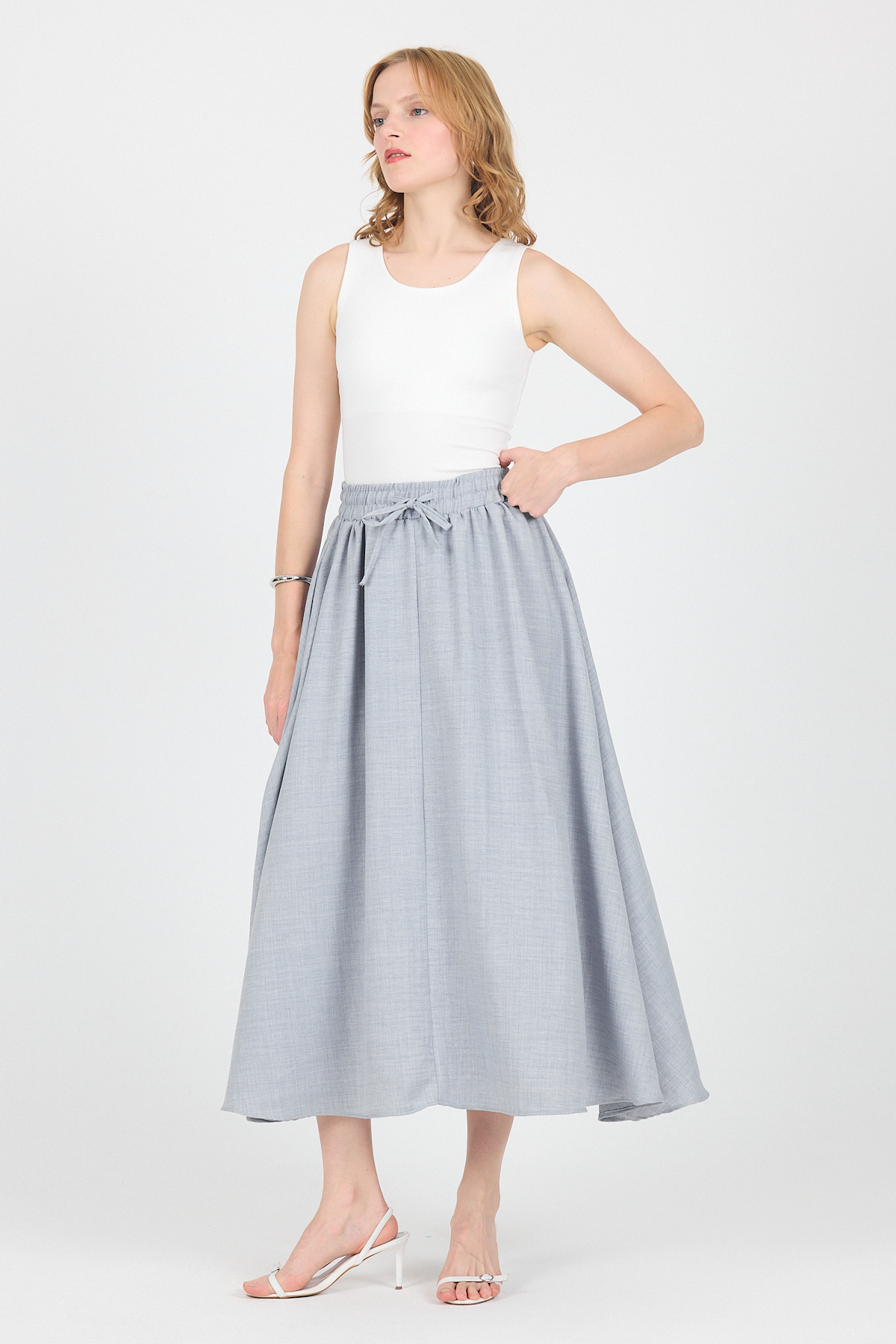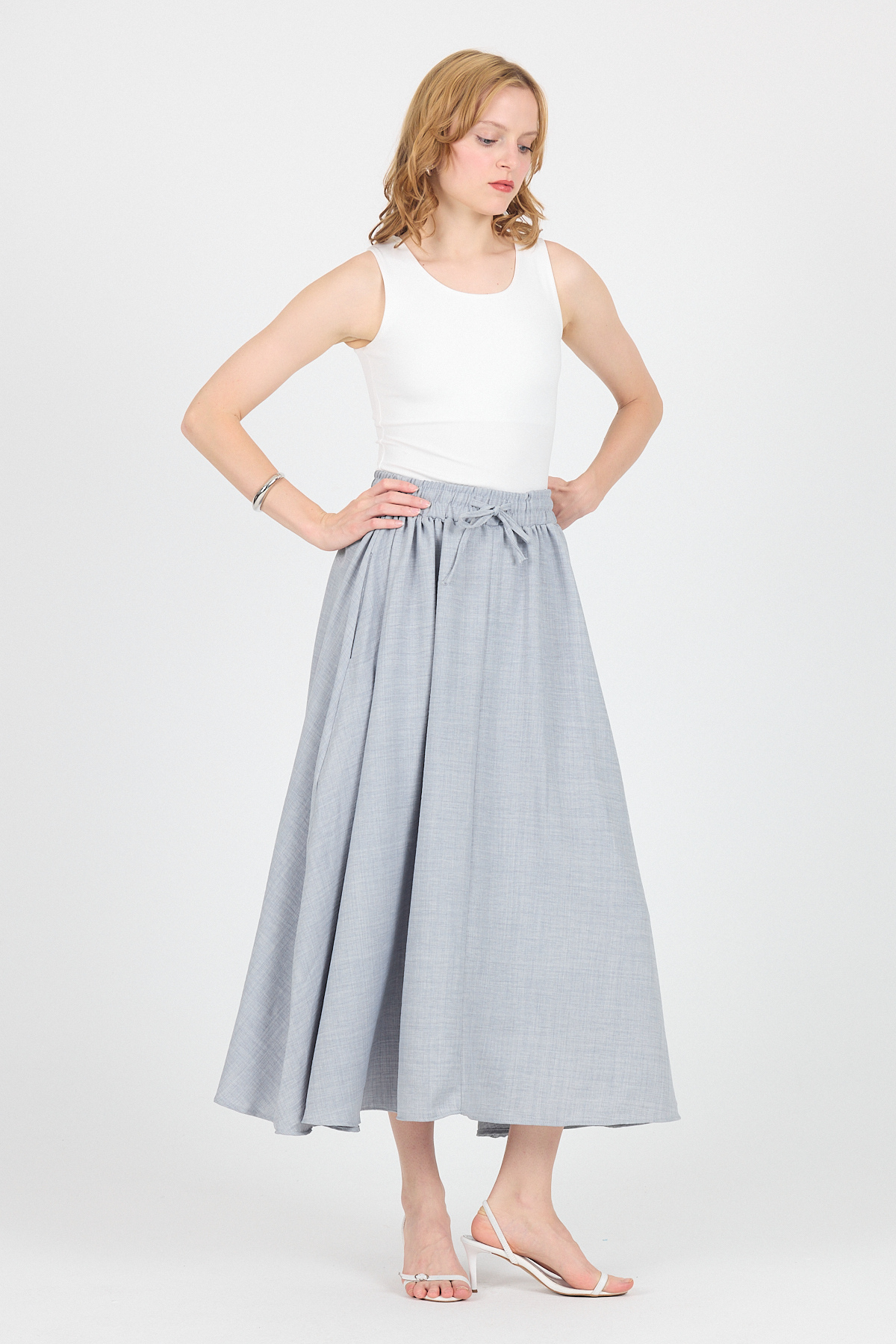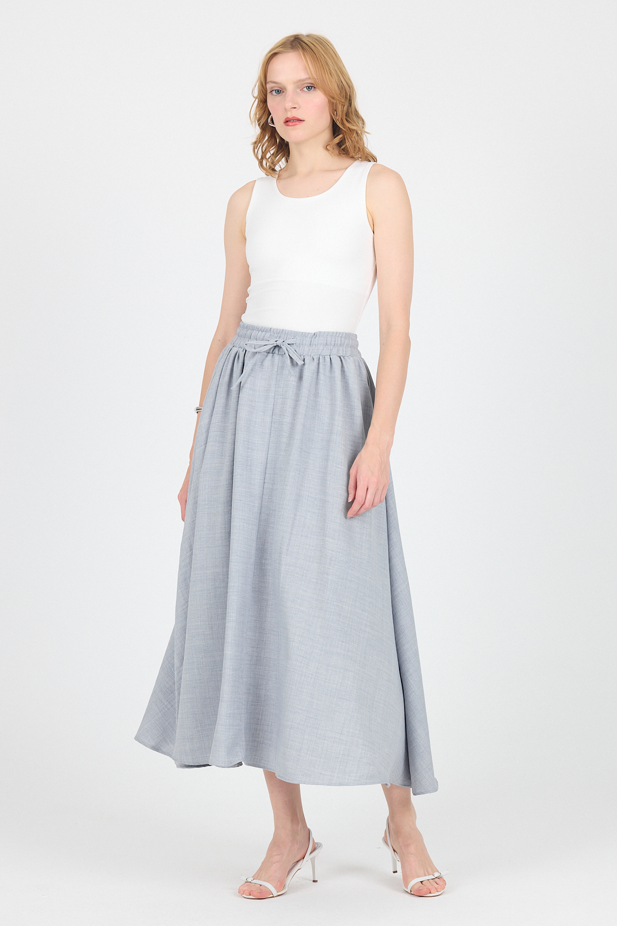 Gri Pamuklu Beli Lastikli Midi Etek 8024A
