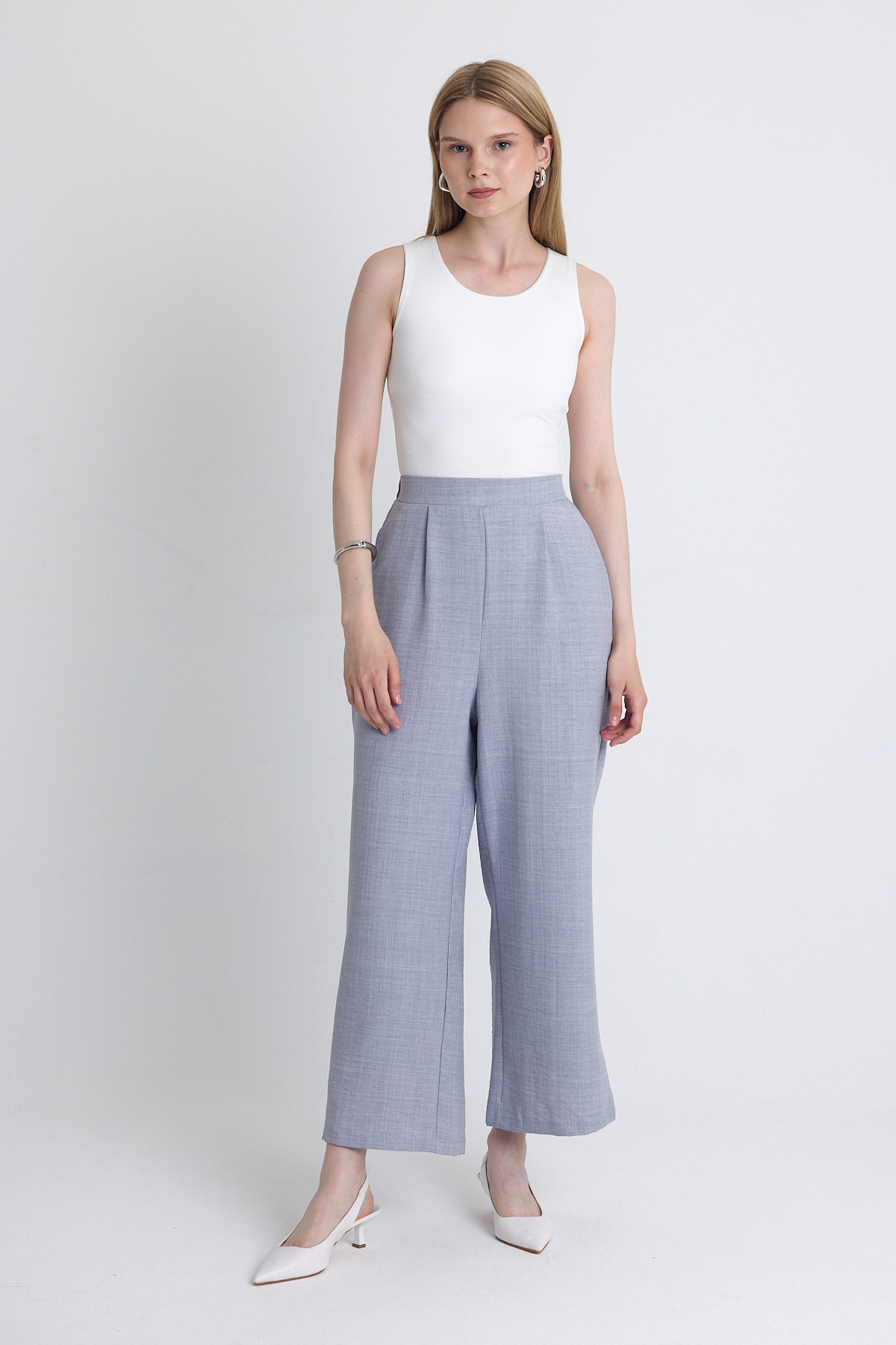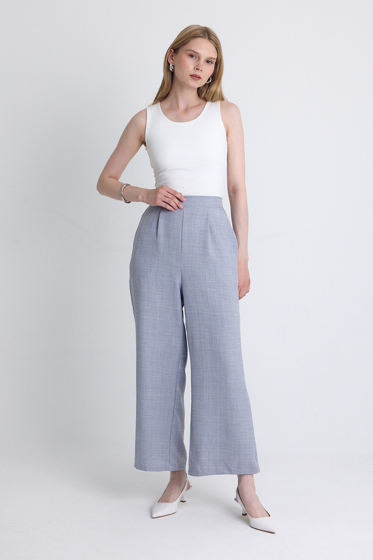 Gri Yüksek Bel Ön Pile Detaylı Pamuklu Bol Paça Pantolon 8014A