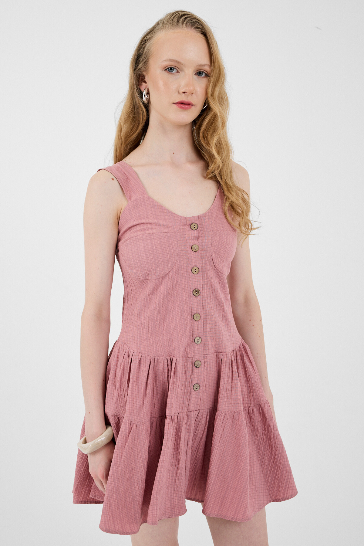 Gül Düğmeli Askılı Kat Etekli Mini Elbise 8042A