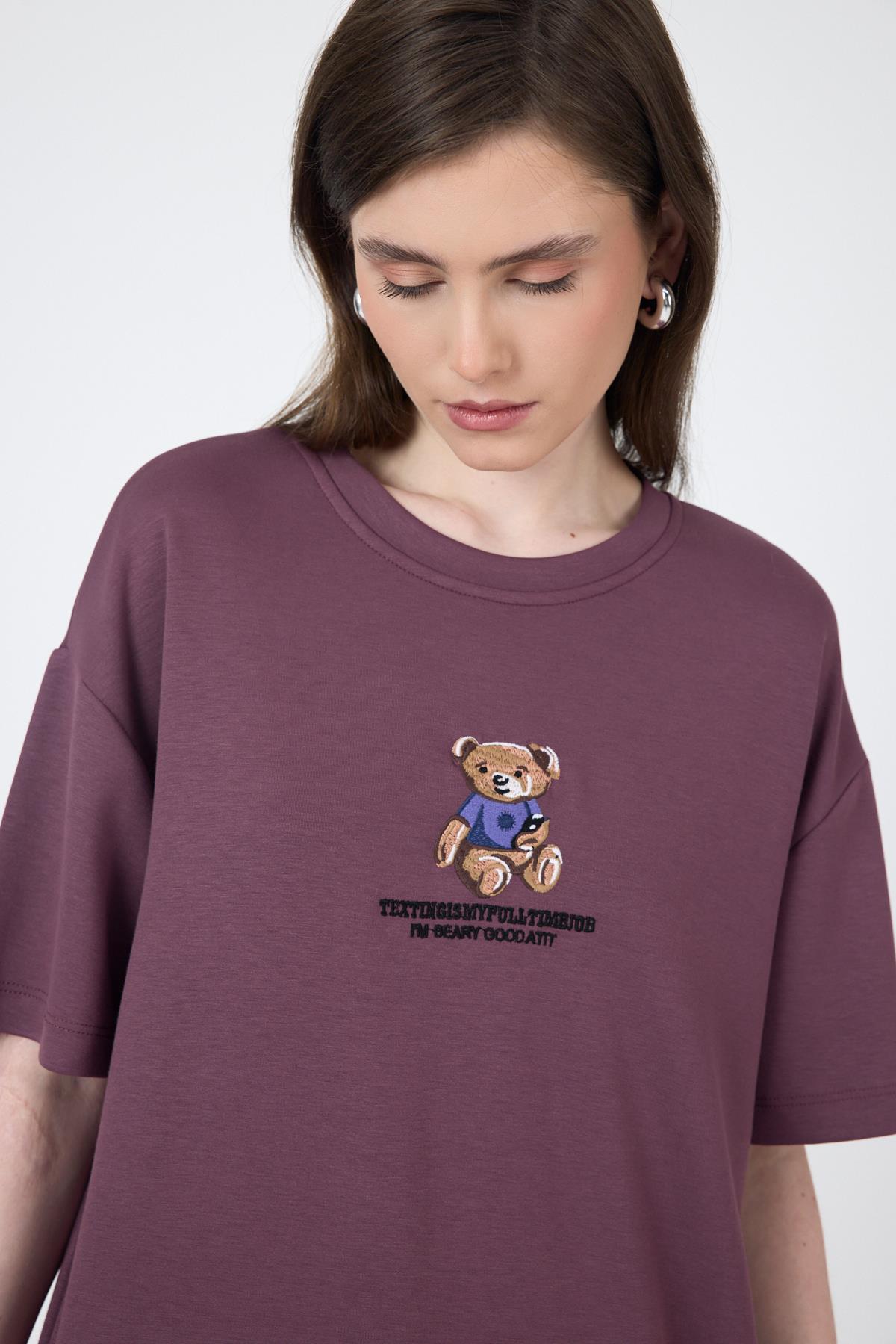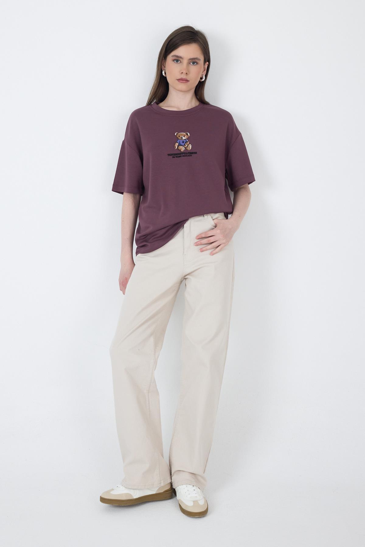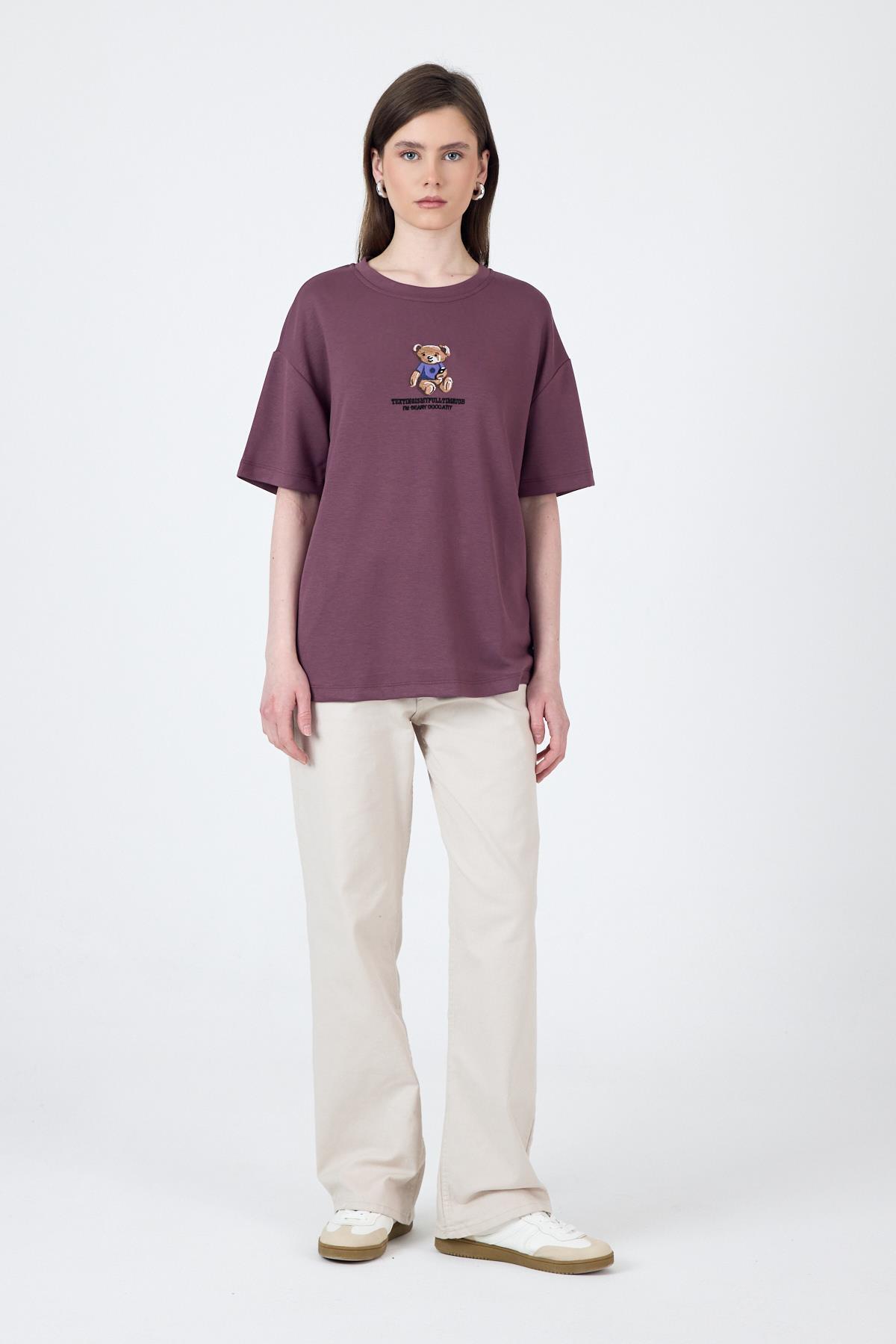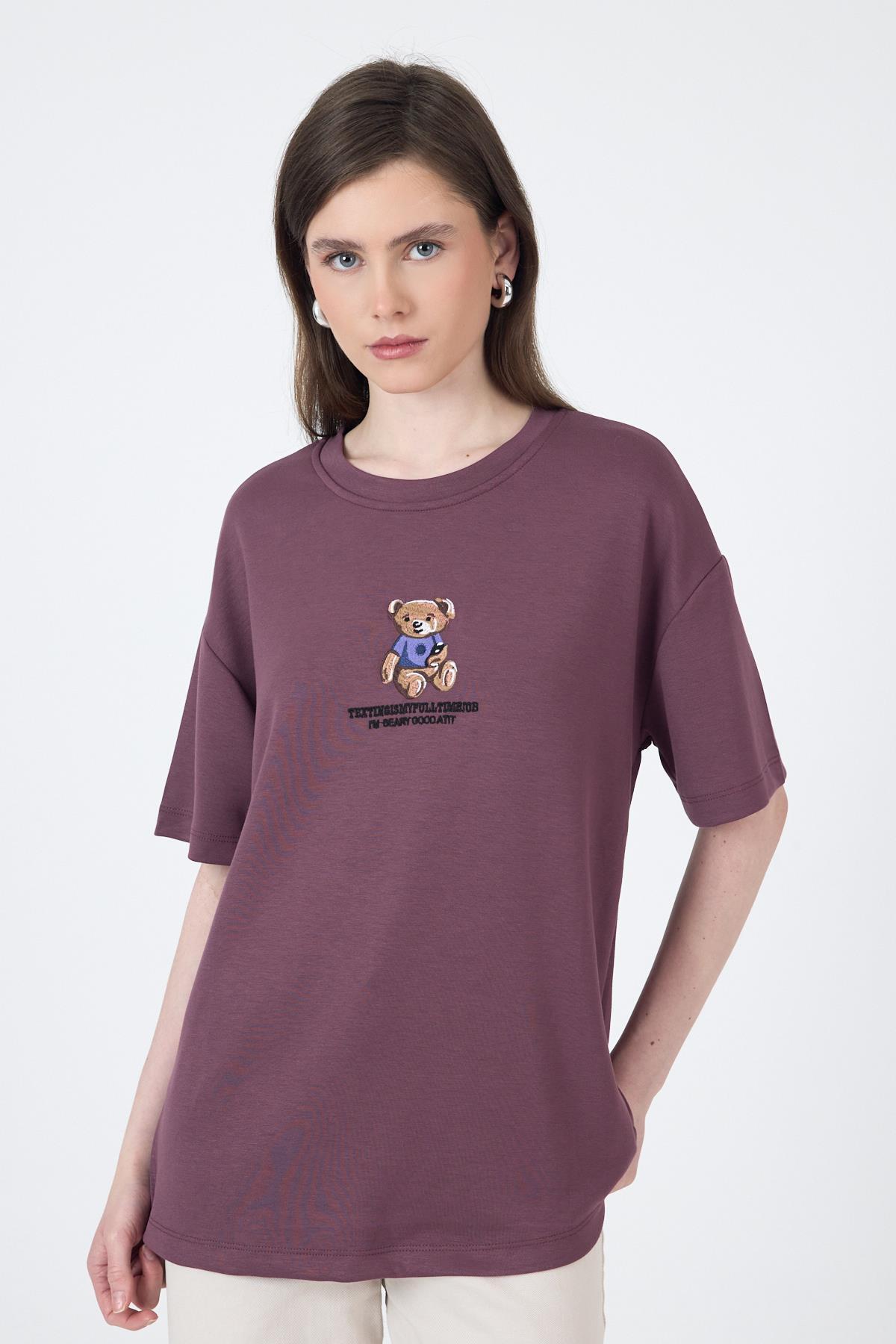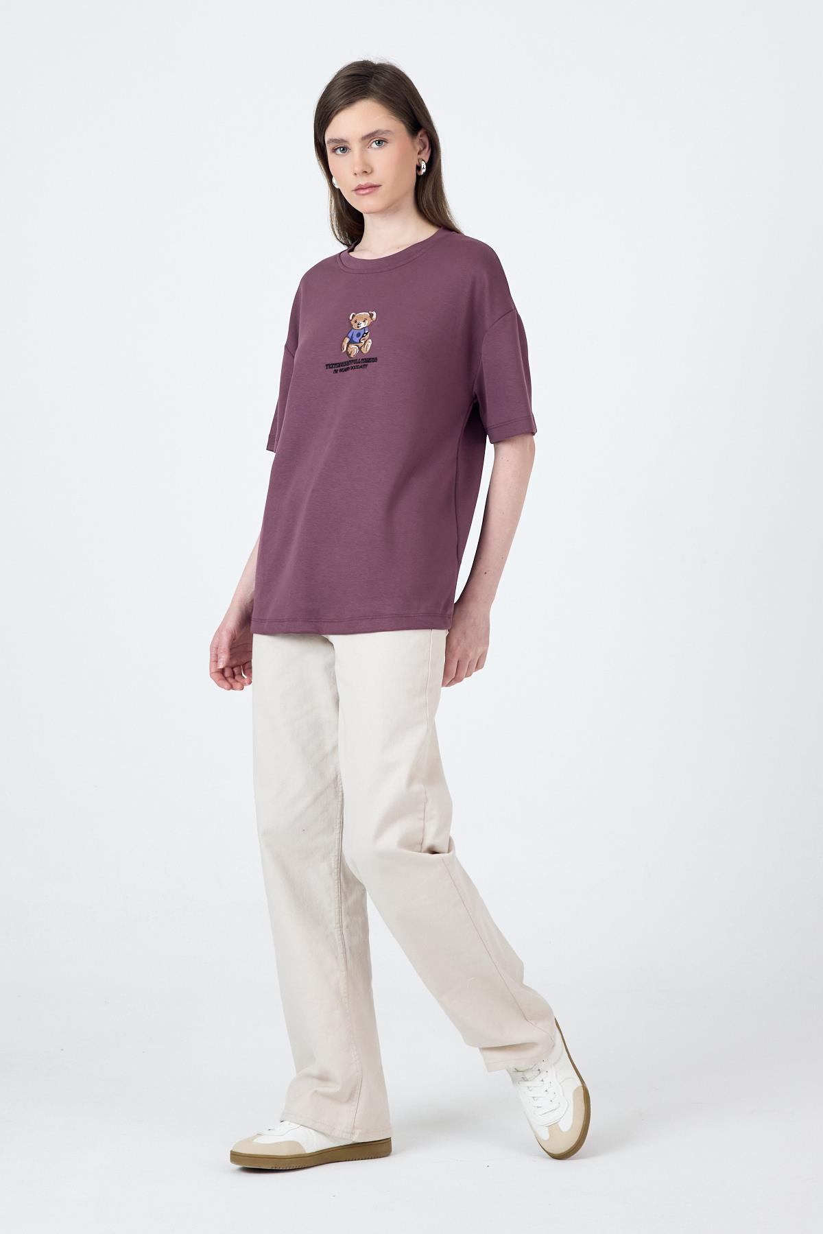 Gül Kurusu Ayıcık Baskılı Bisiklet Yaka Oversize Tişört 5530