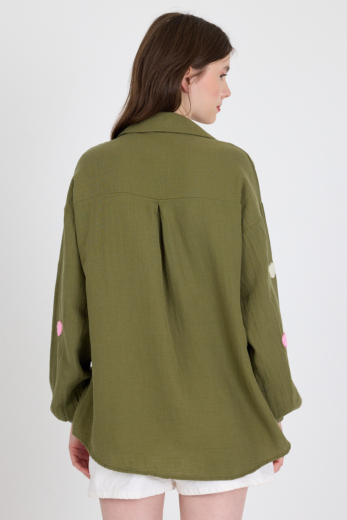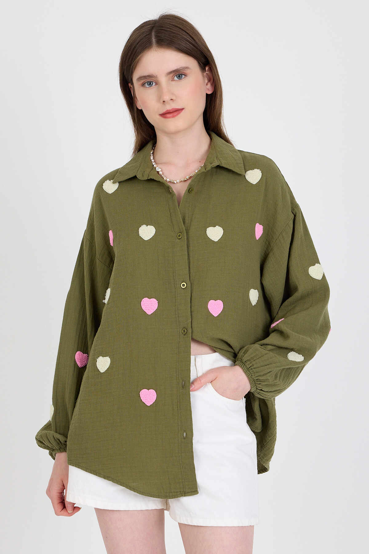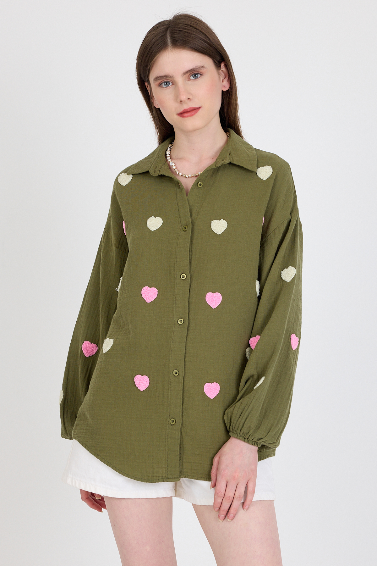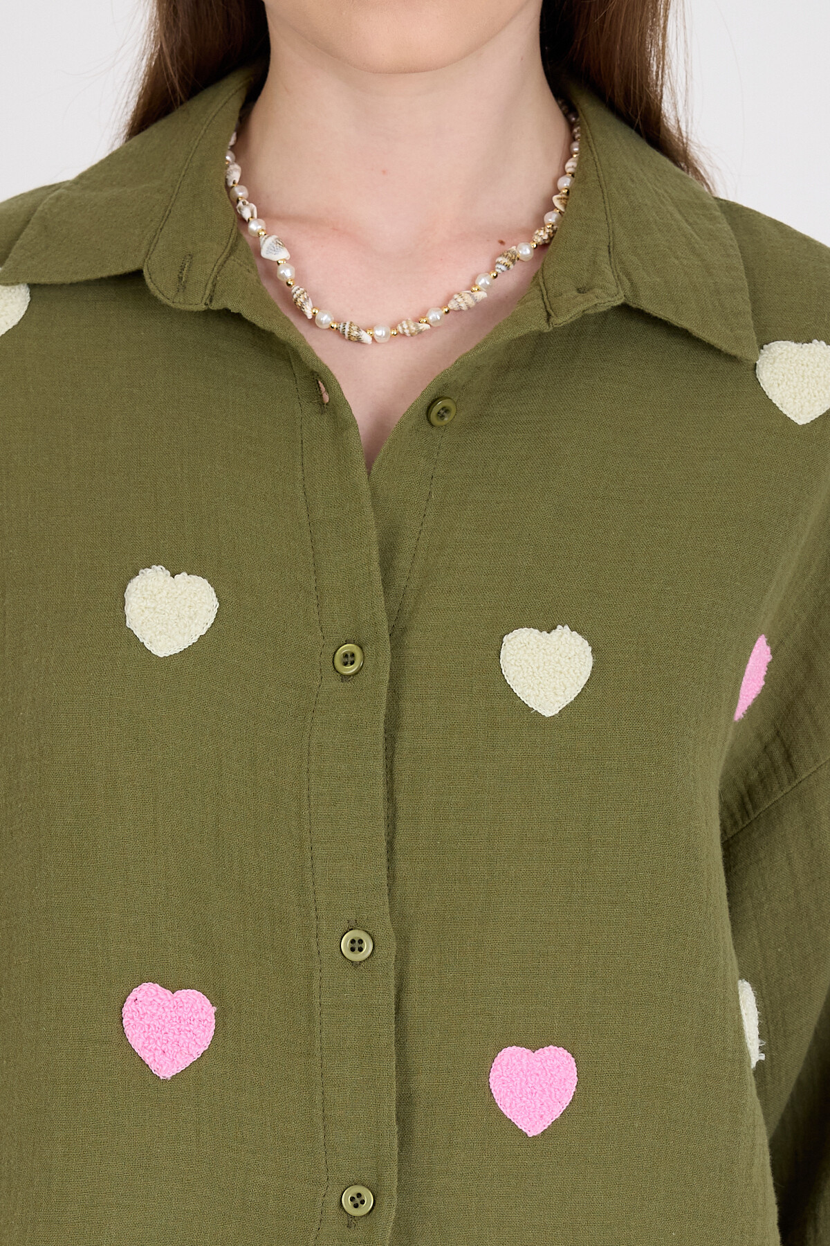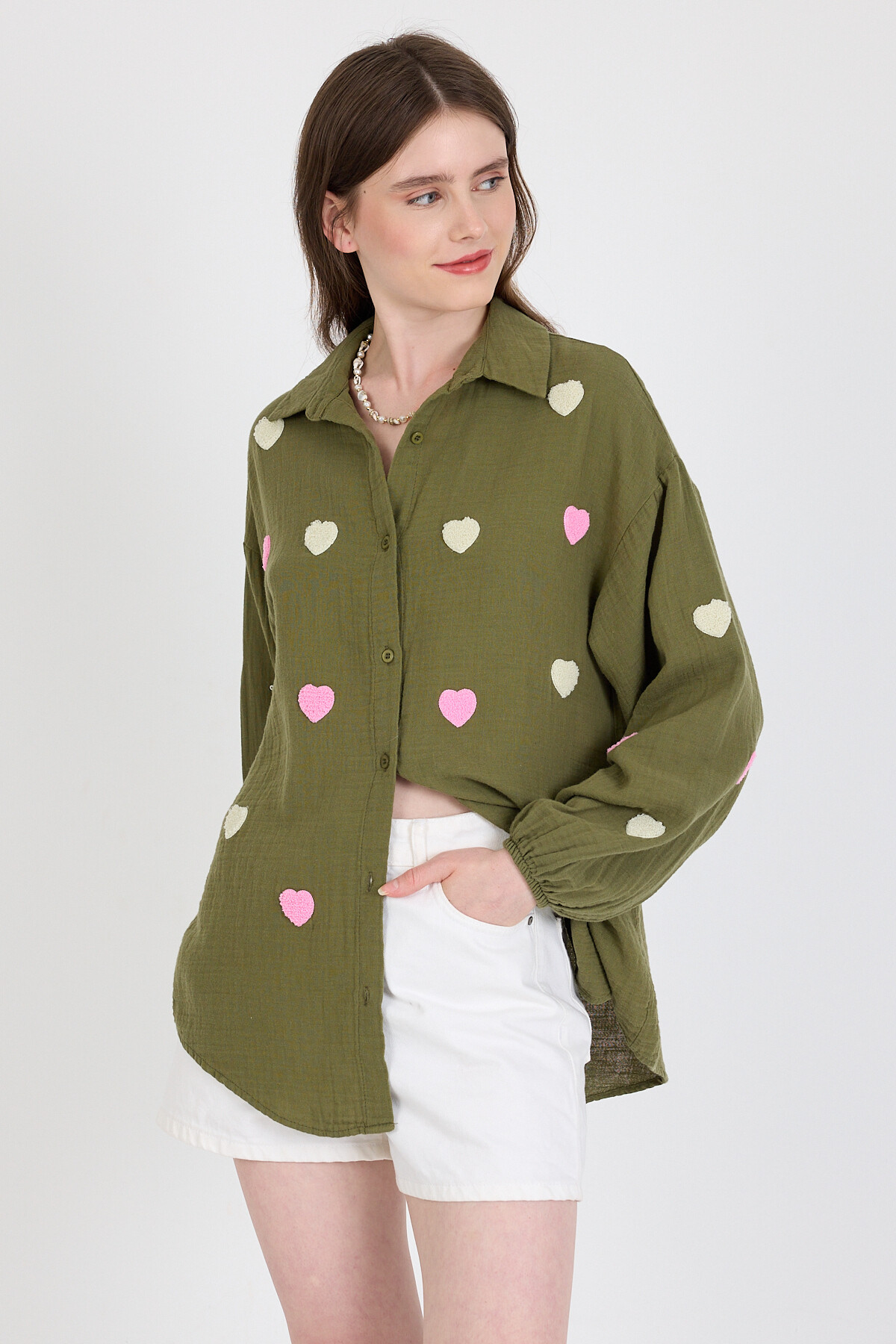 Haki %100 Pamuk Kalp Nakışlı Gömlek 4797A