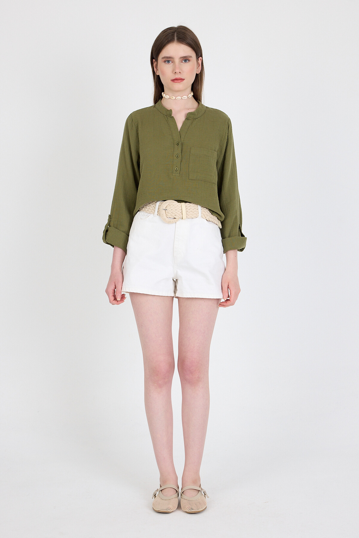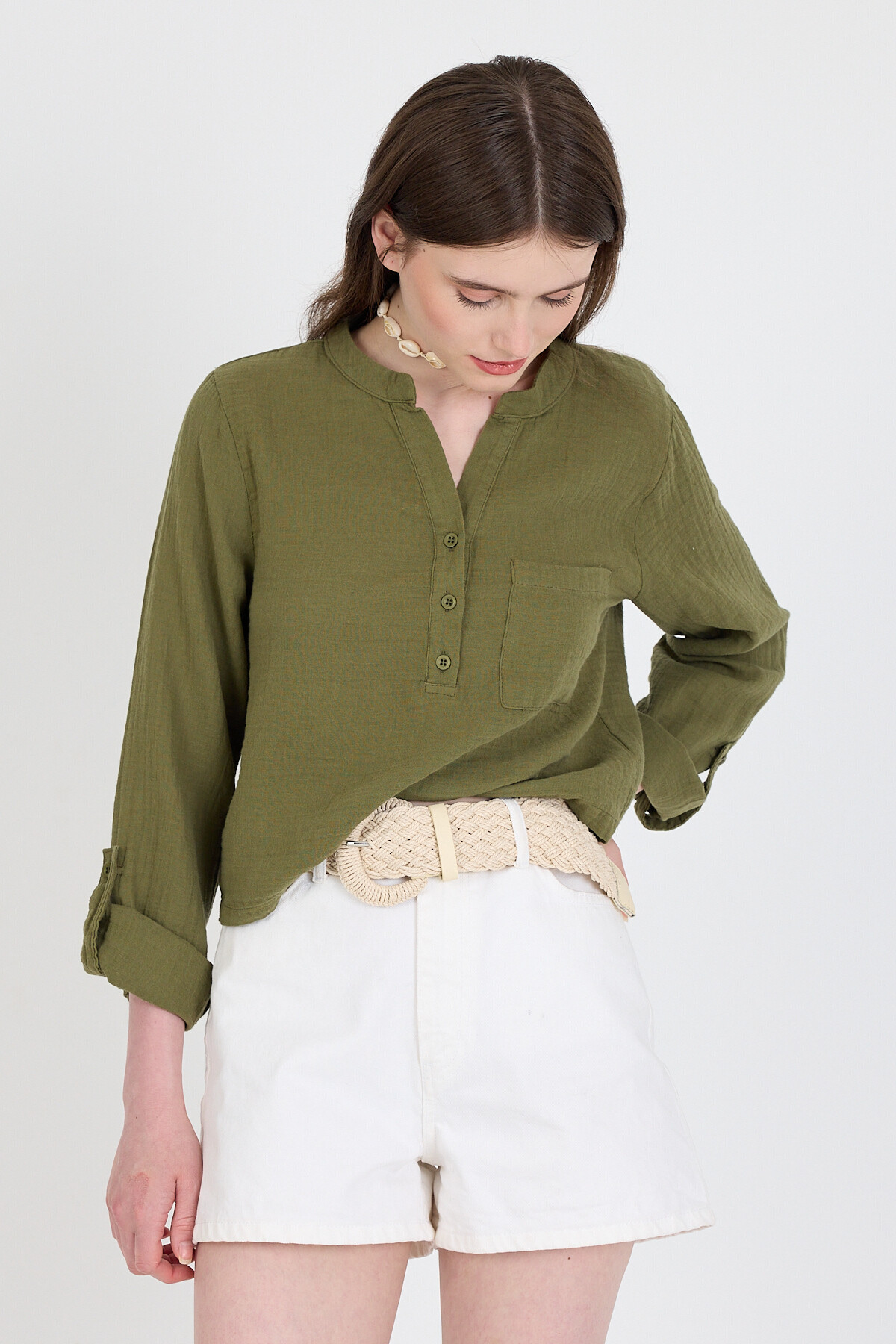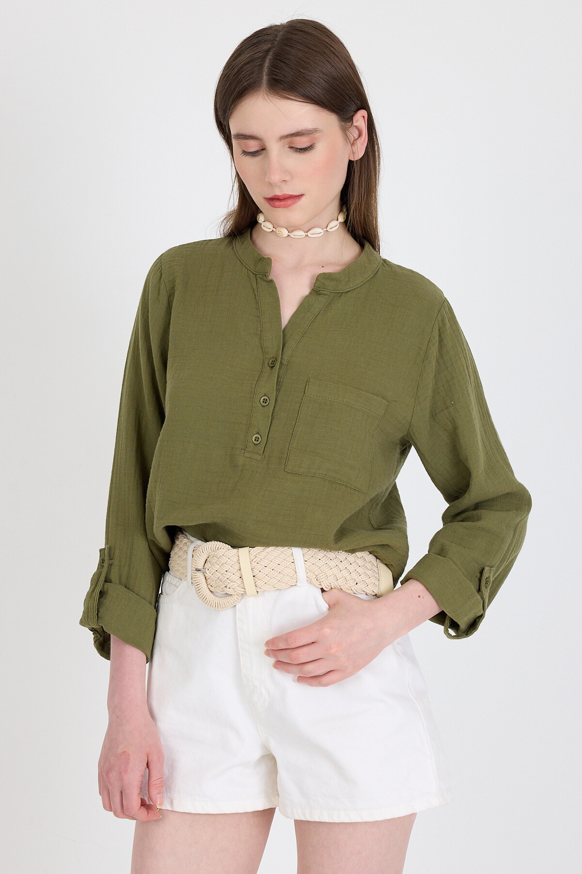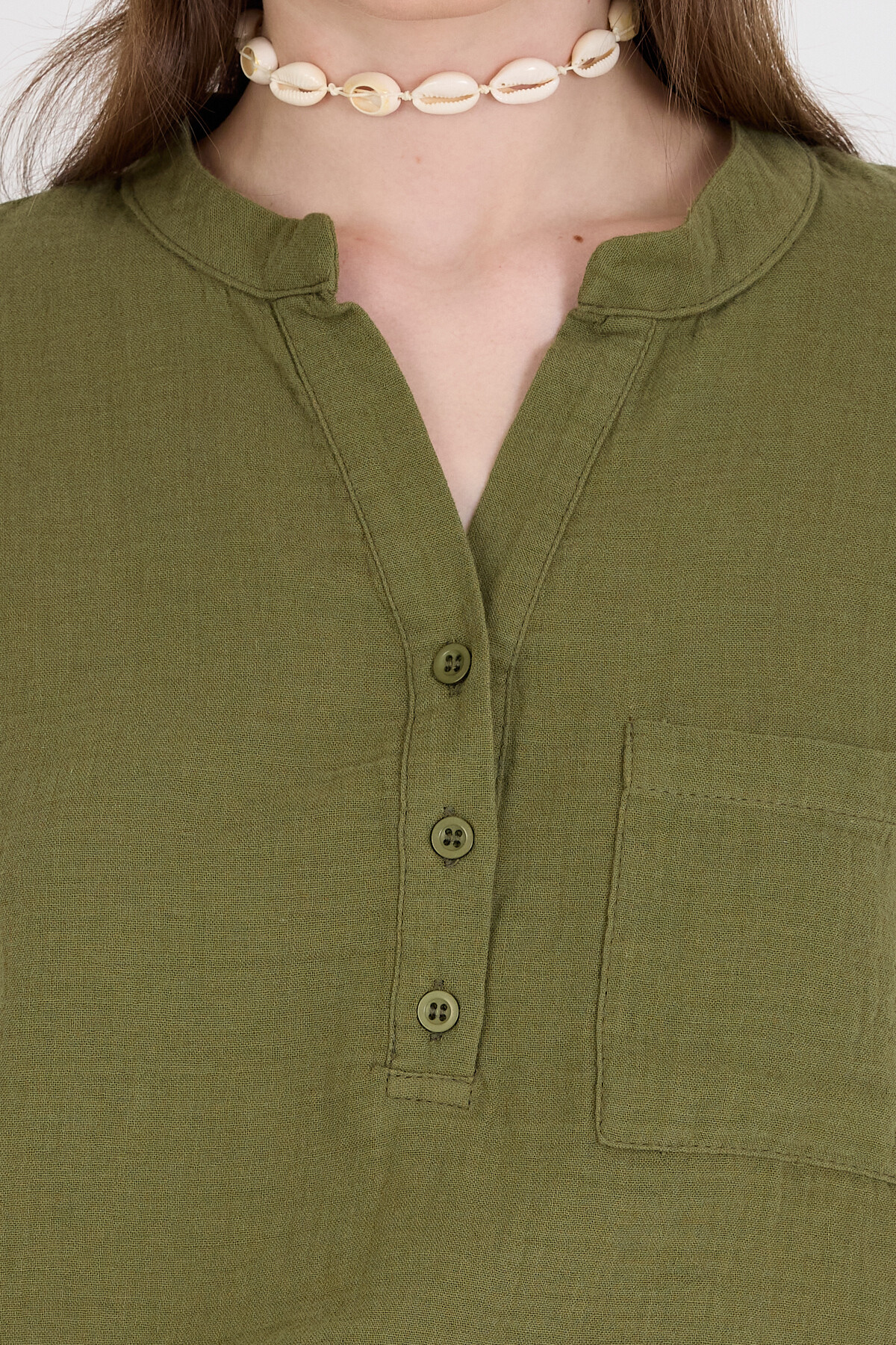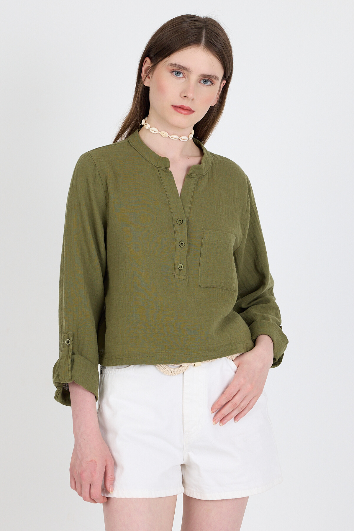 Haki %100 Pamuk Keten Görünümlü Hakim Yaka Crop Gömlek 4702A