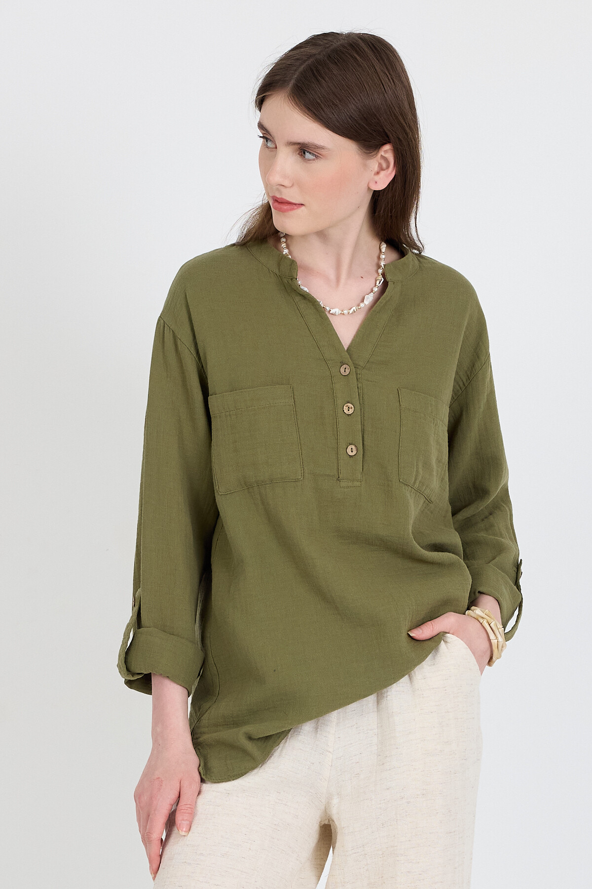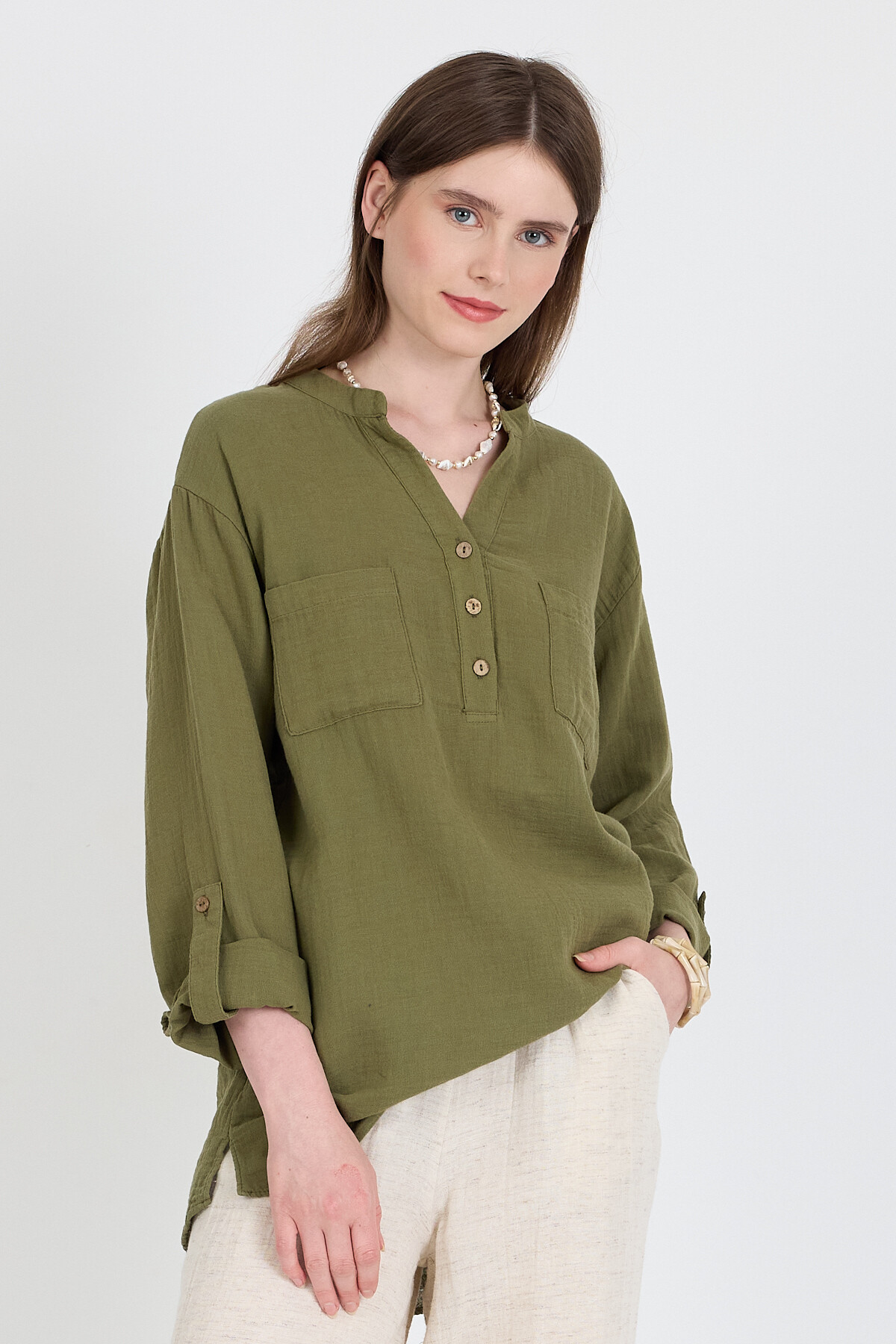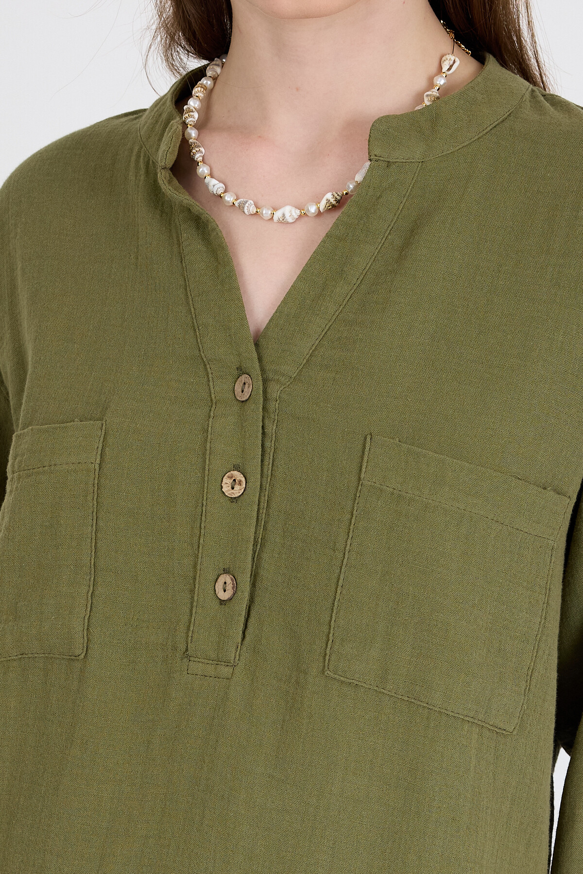 Haki %100 Pamuk Keten Görünümlü Hakim Yaka Tunik Gömlek 4698A