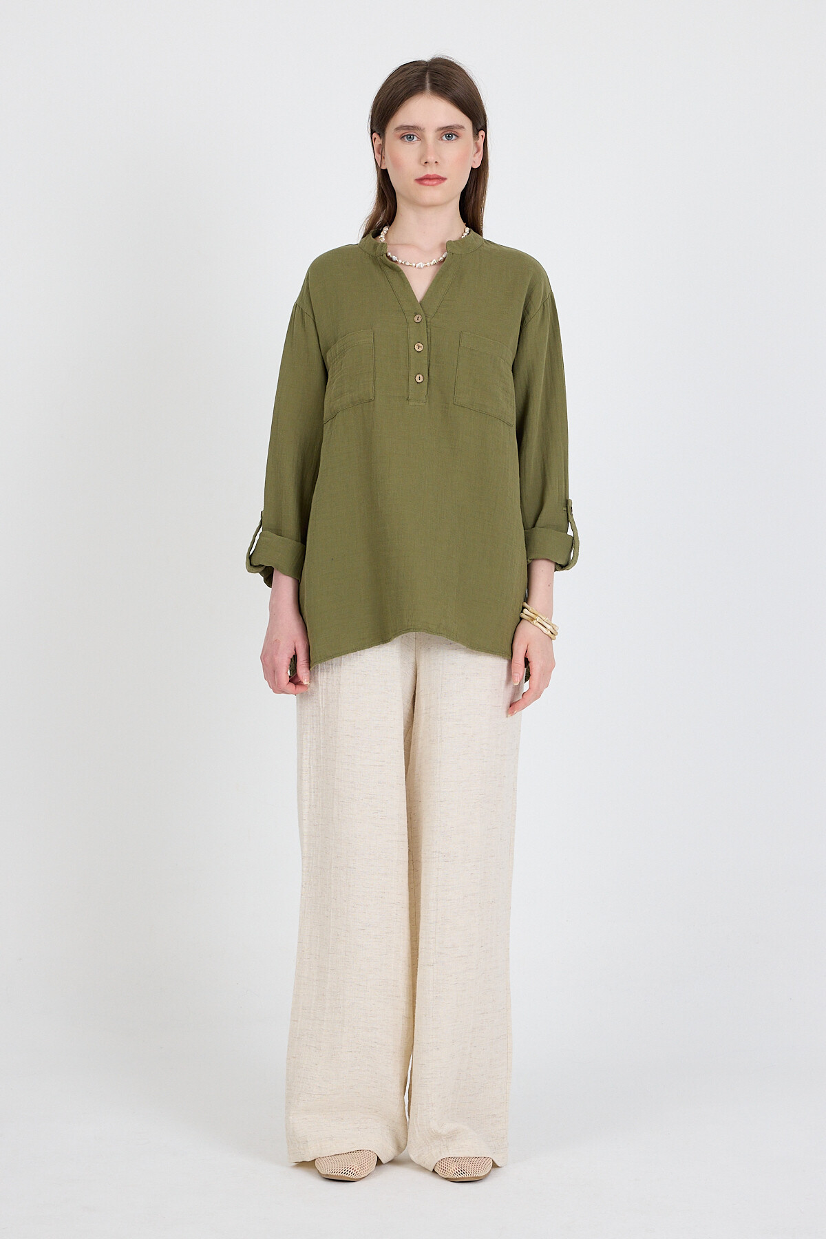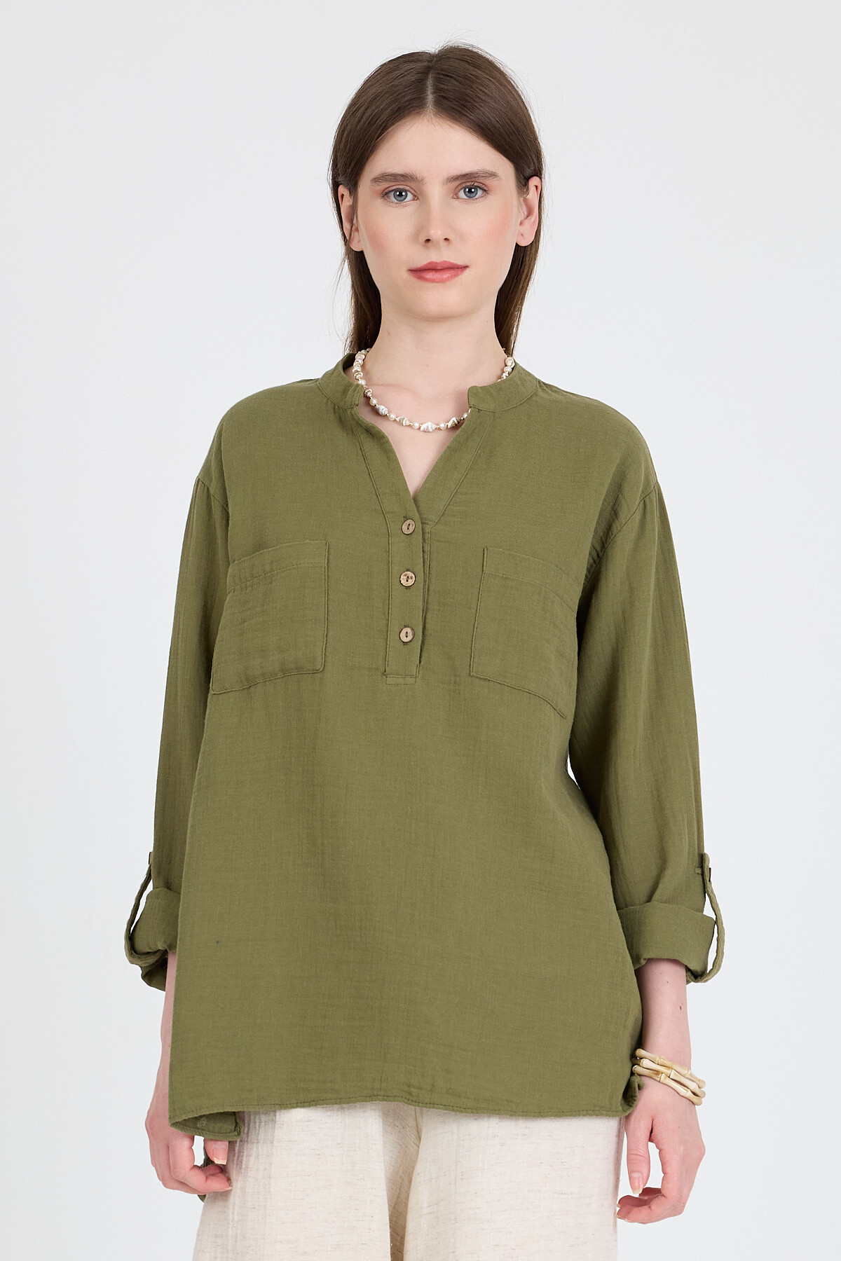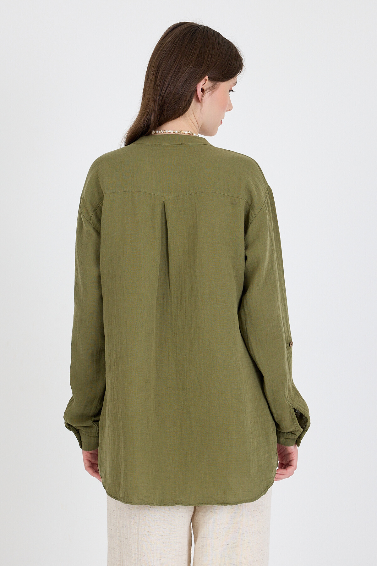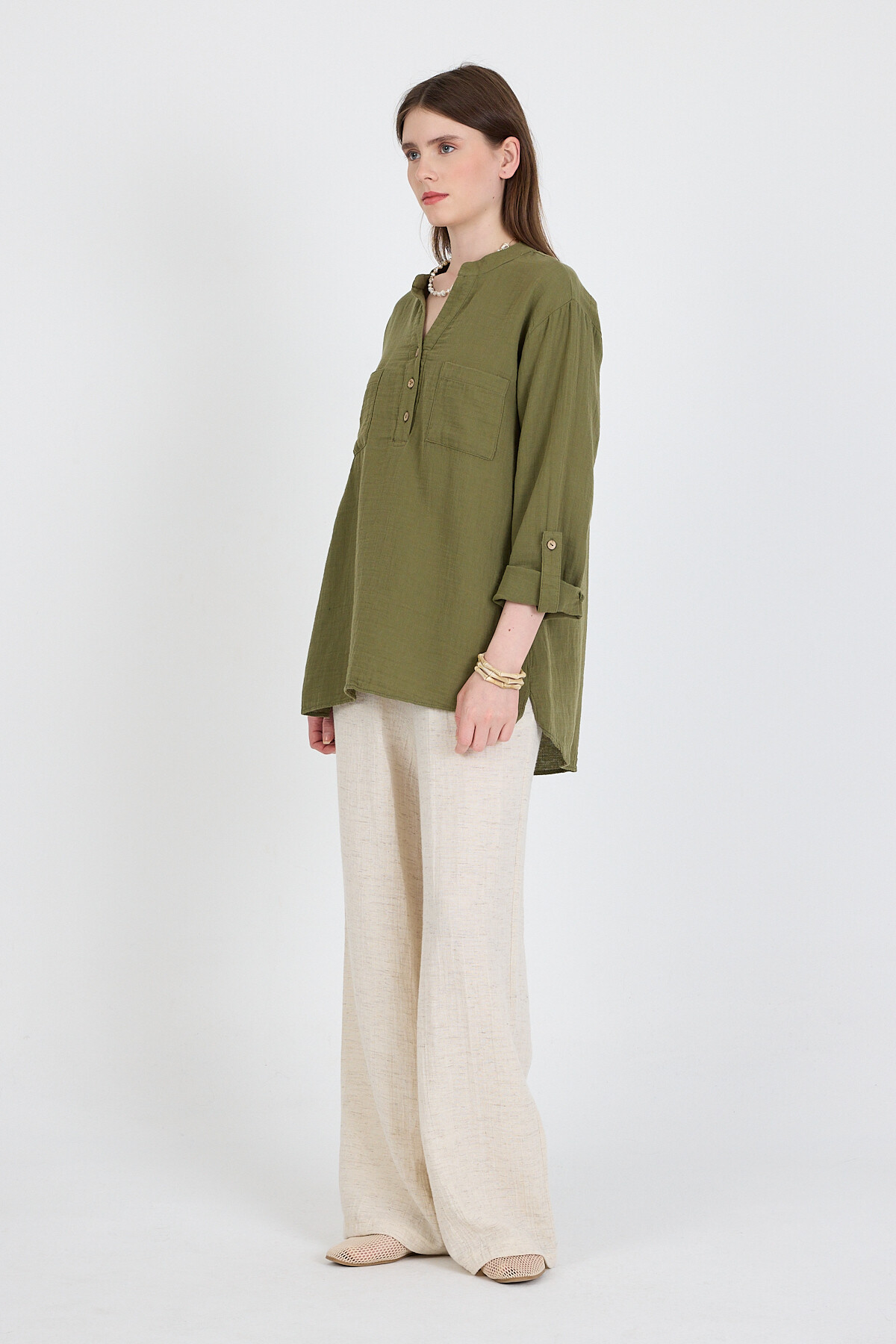 Haki %100 Pamuk Keten Görünümlü Hakim Yaka Tunik Gömlek 4698A
