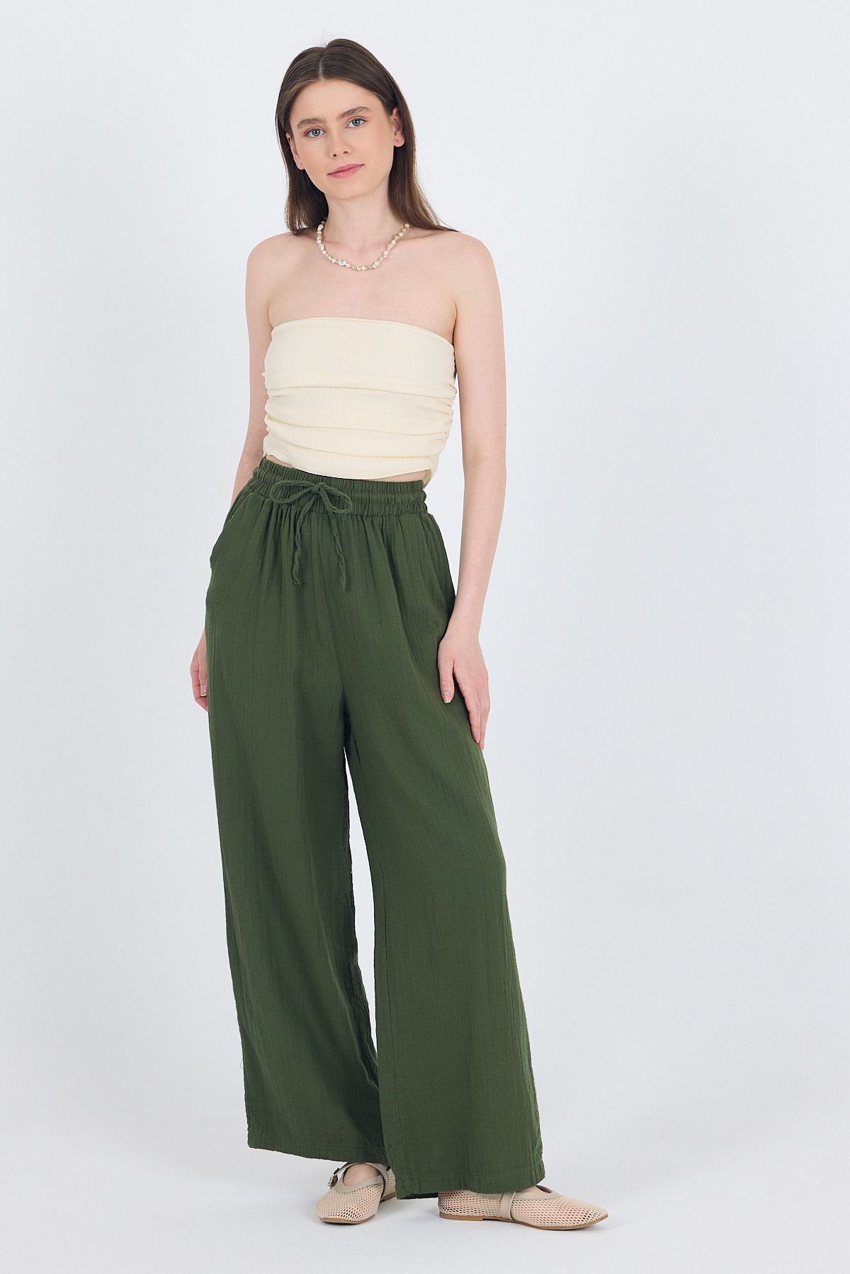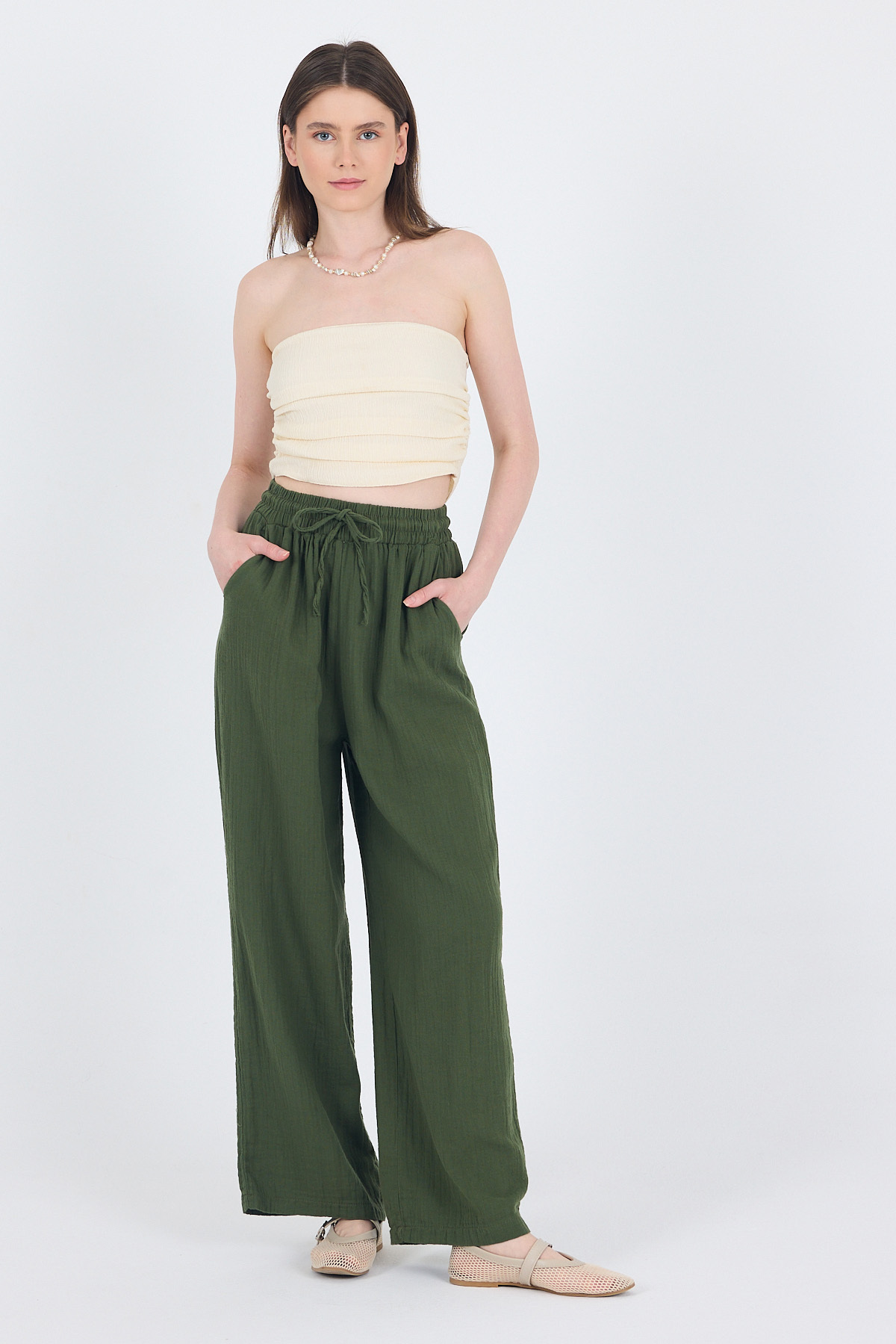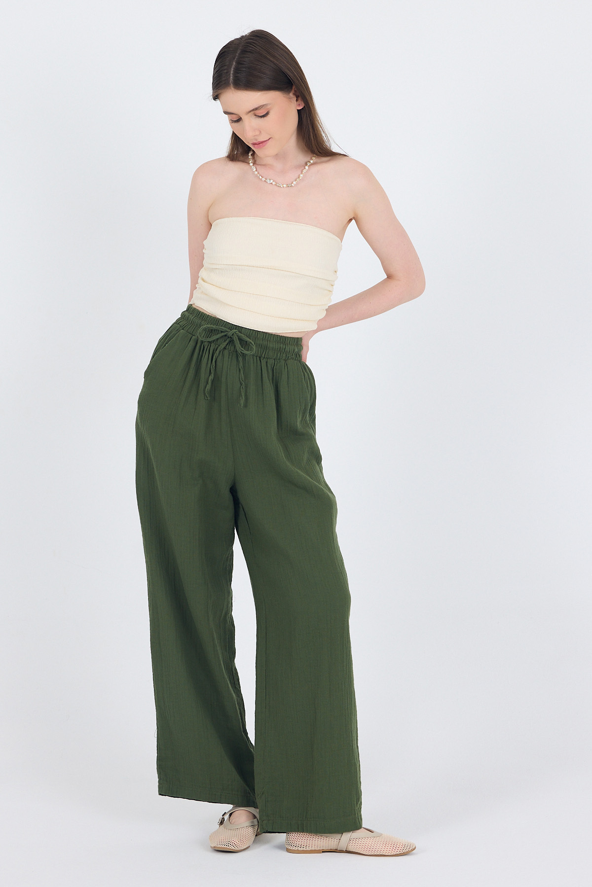 Haki %100 Pamuk Müslin Palazzo/Bol Paça Pantolon 8056A