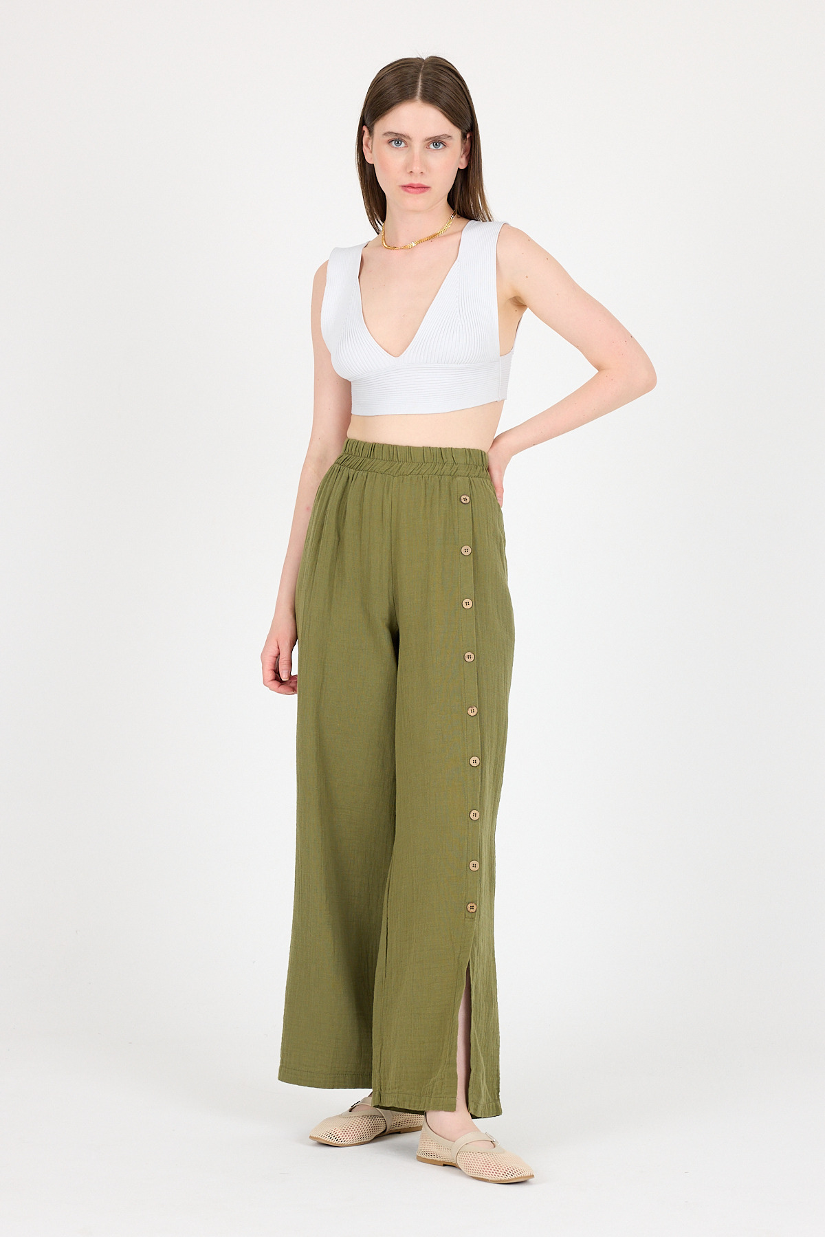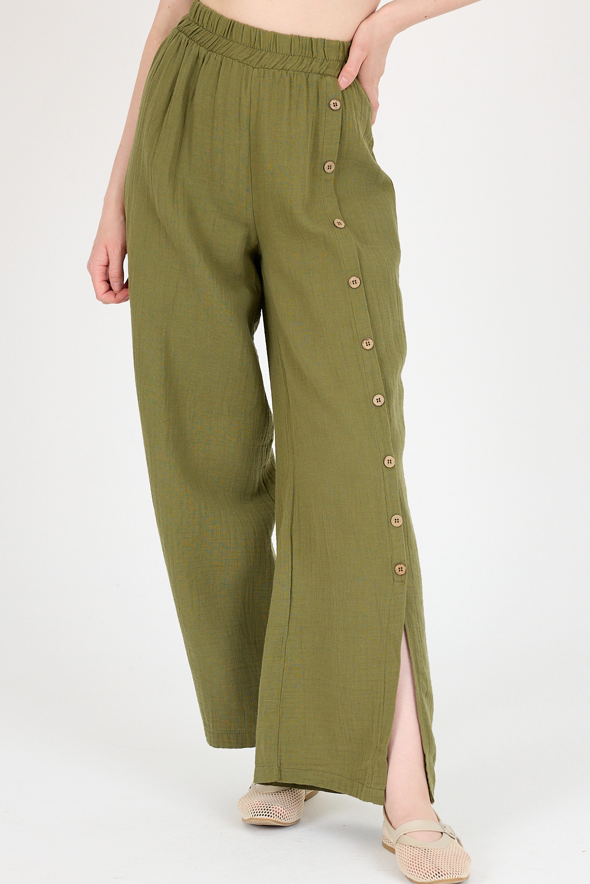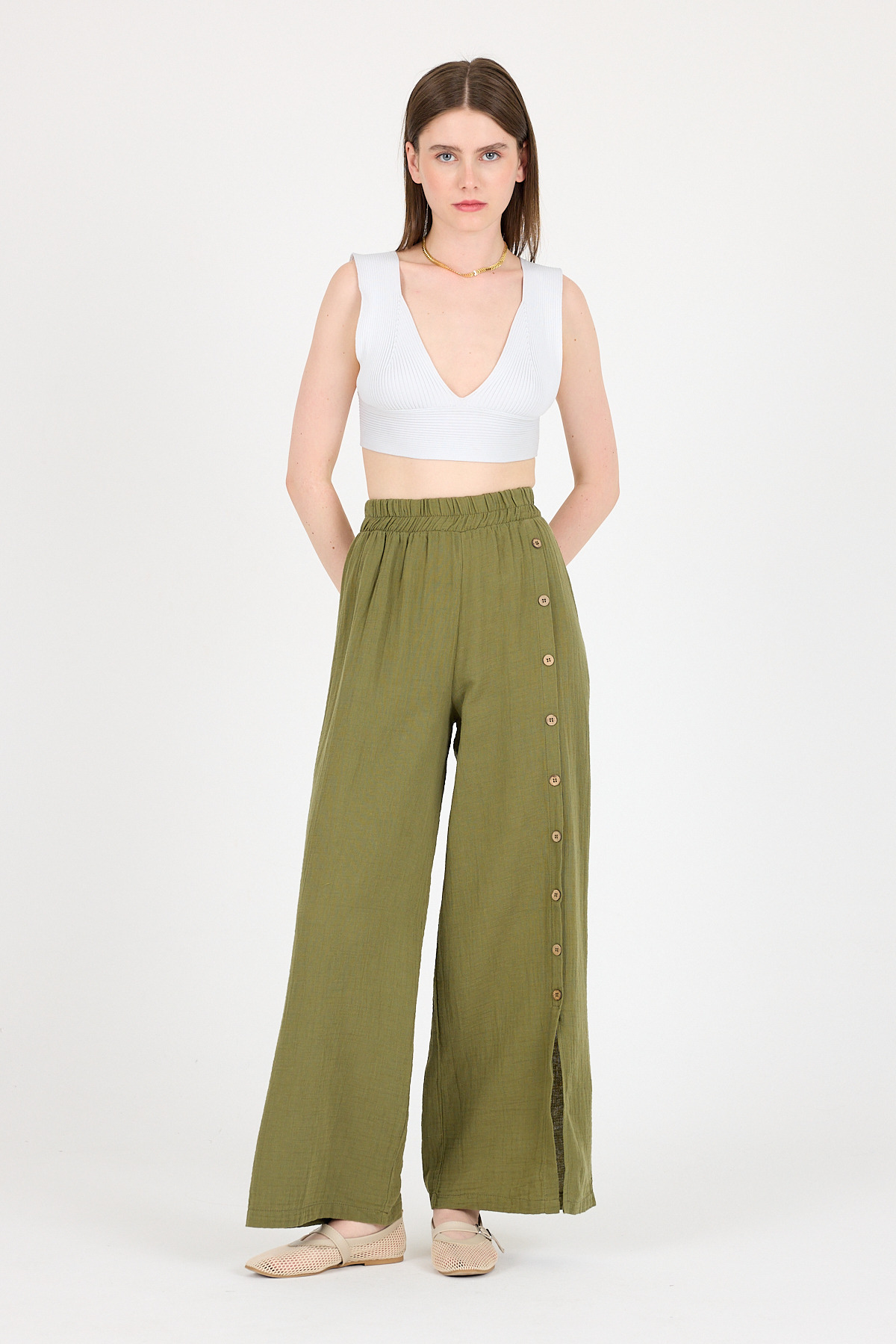 Haki %100 Pamuk Müslin Yanı Düğmeli Yırtmaçlı Geniş Paça Pantolon 4704A