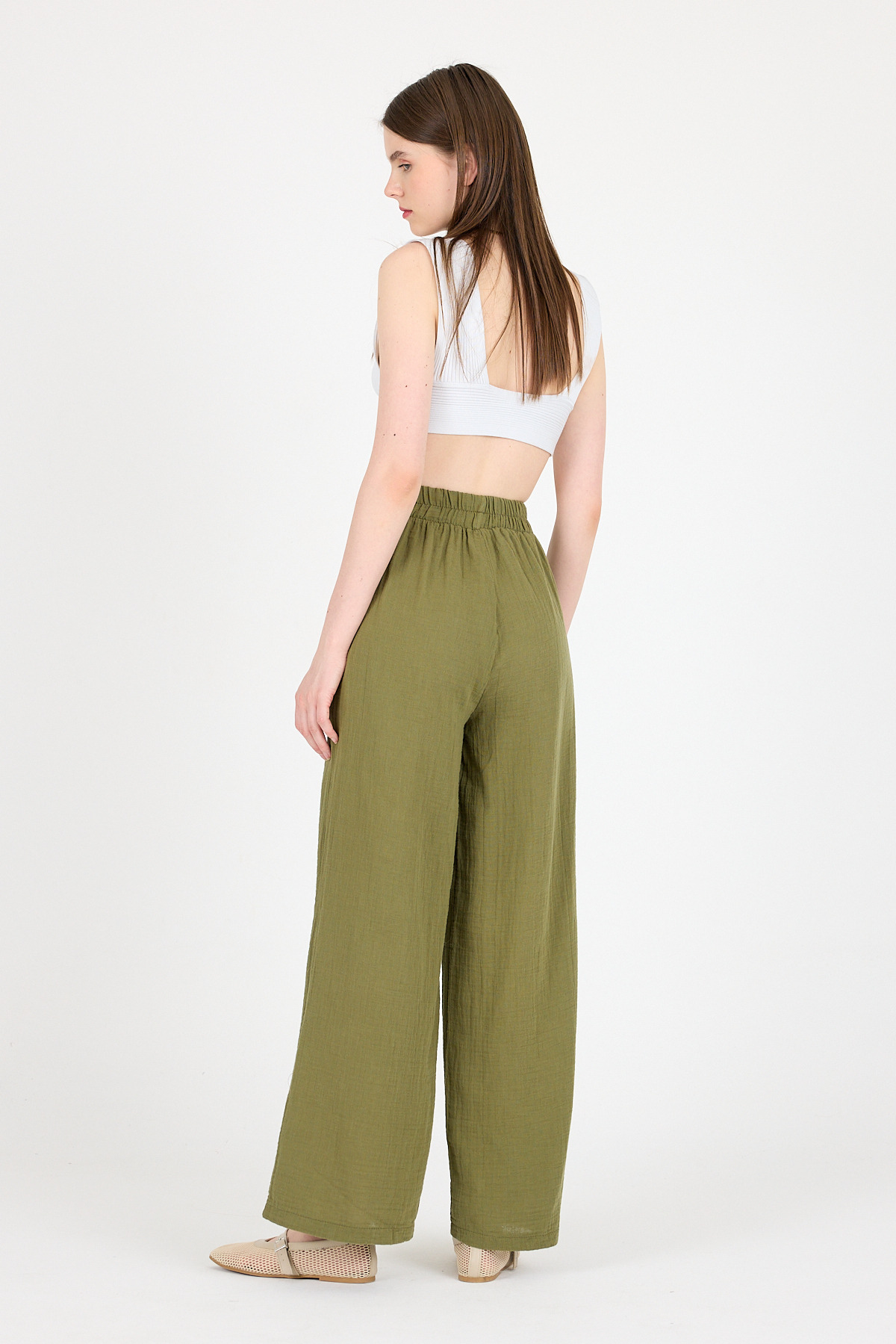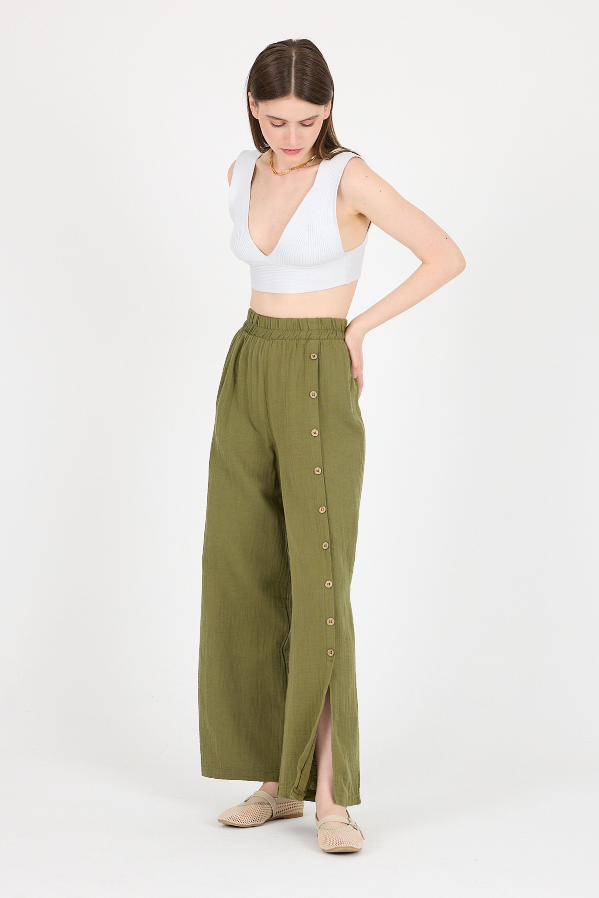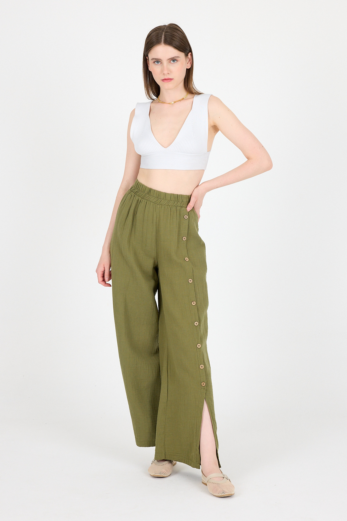 Haki %100 Pamuk Müslin Yanı Düğmeli Yırtmaçlı Geniş Paça Pantolon 4704A