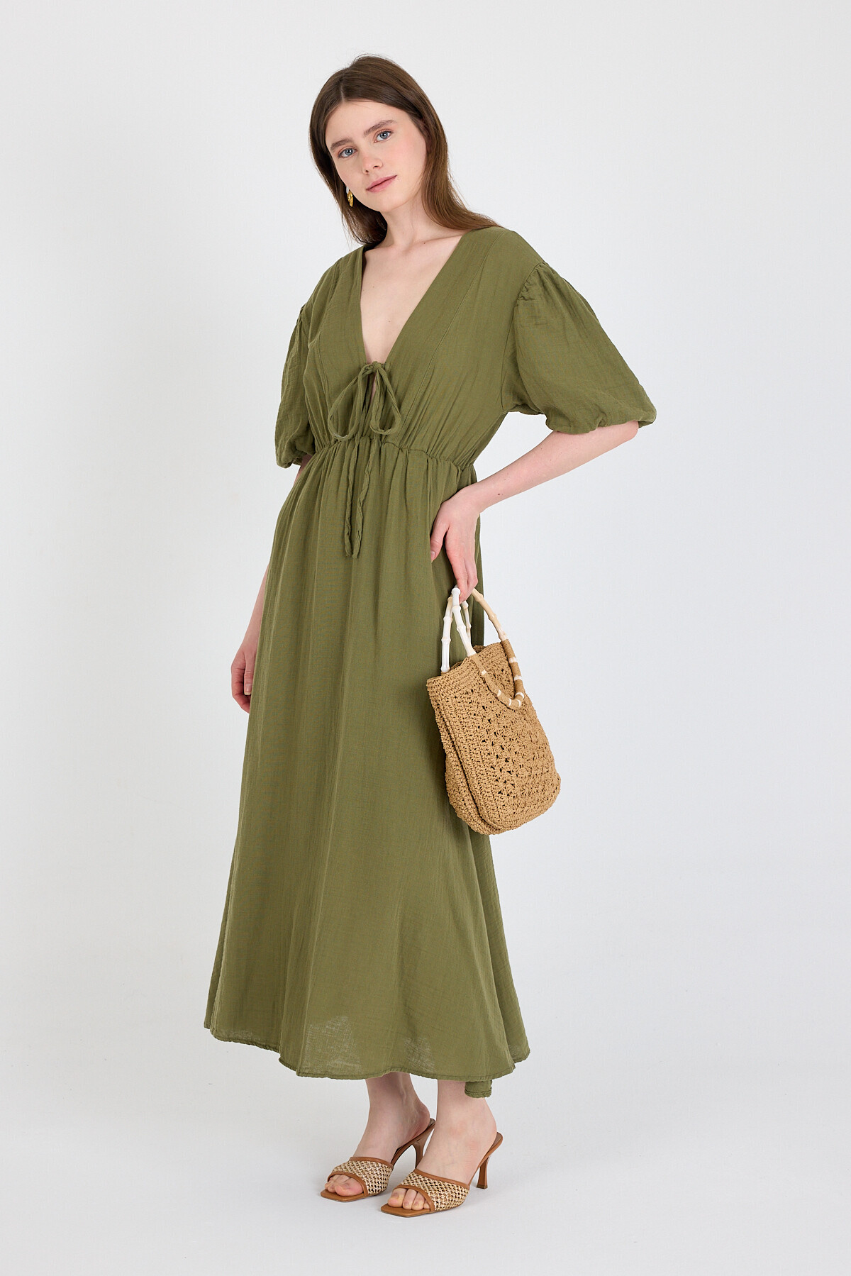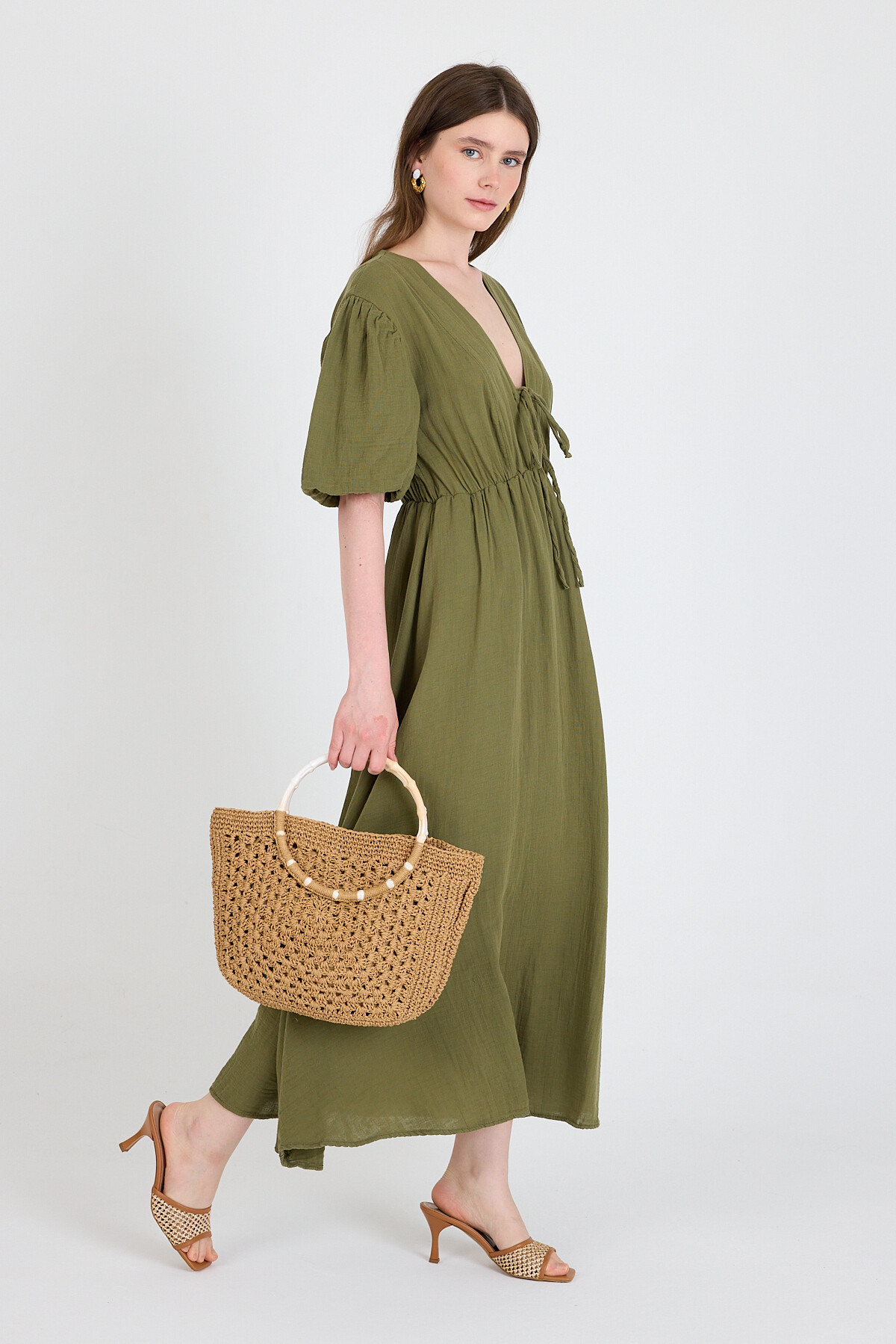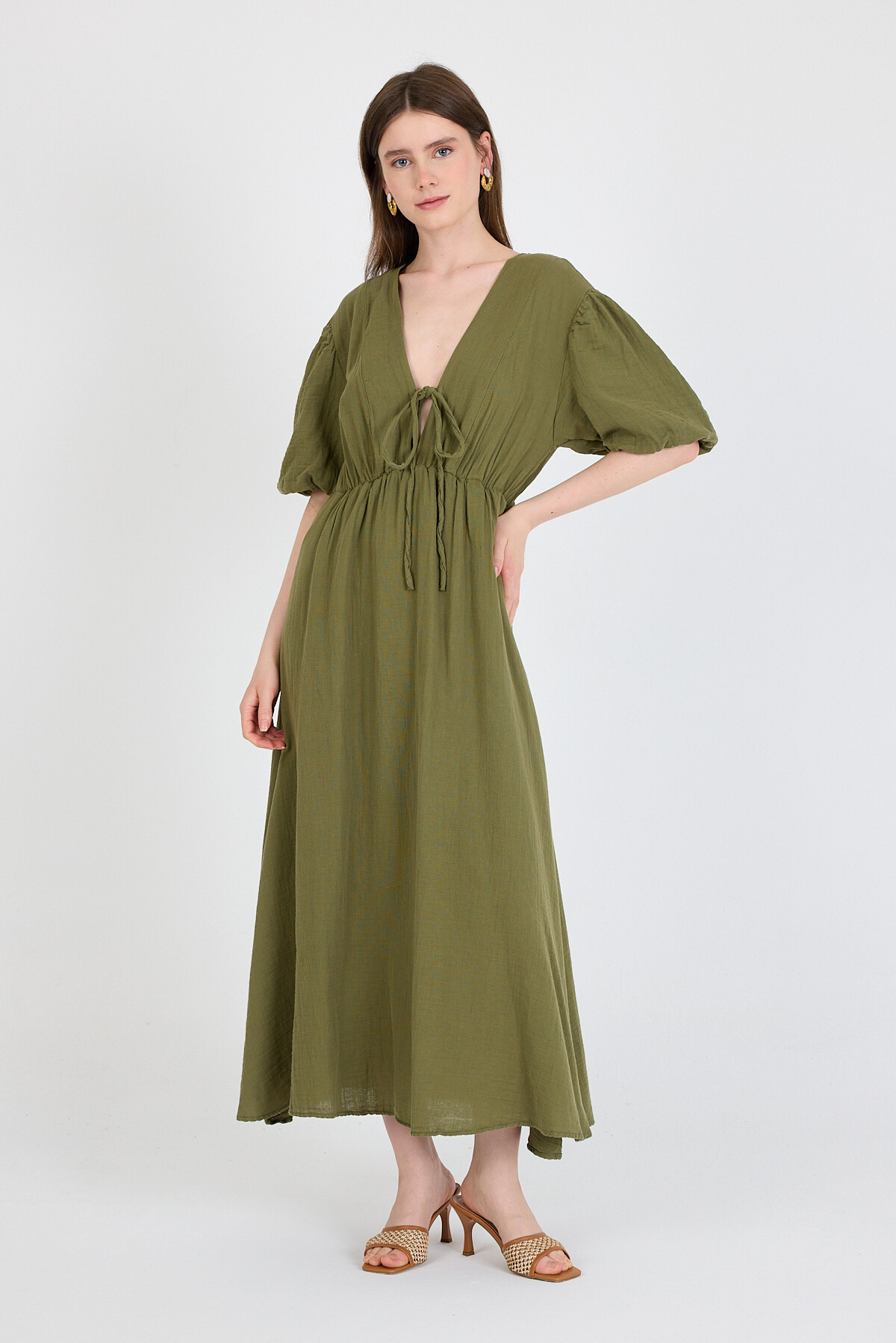 Haki %100 Pamuk Ön Bağlama Detaylı Midi Elbise 4785A