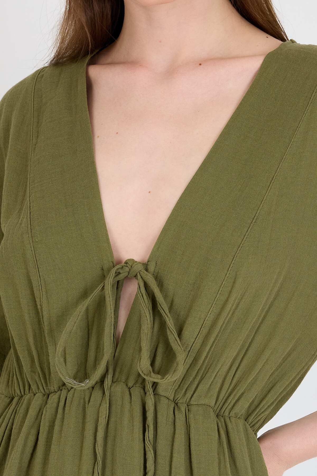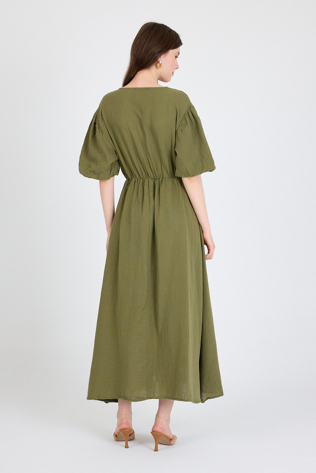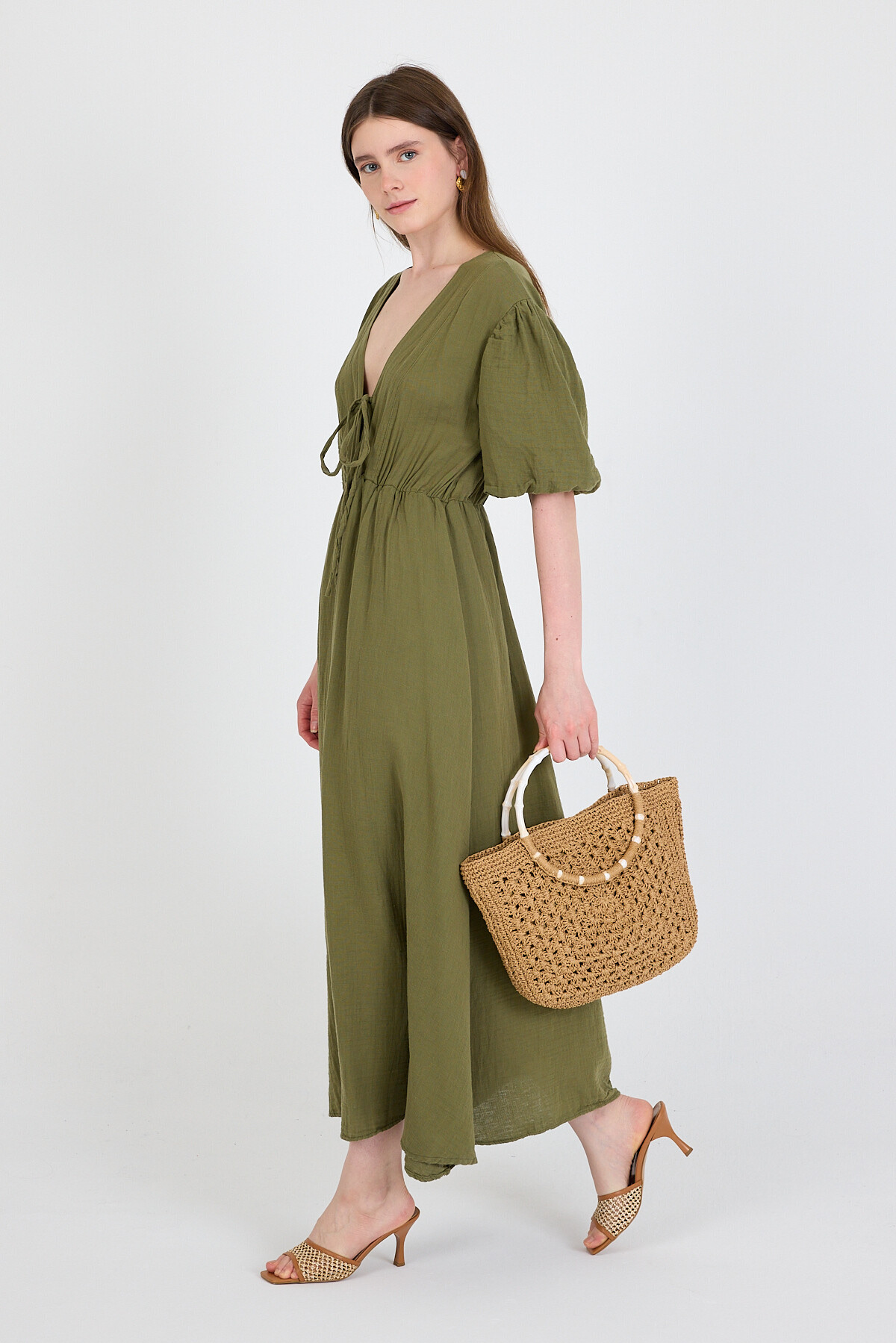 Haki %100 Pamuk Ön Bağlama Detaylı Midi Elbise 4785A