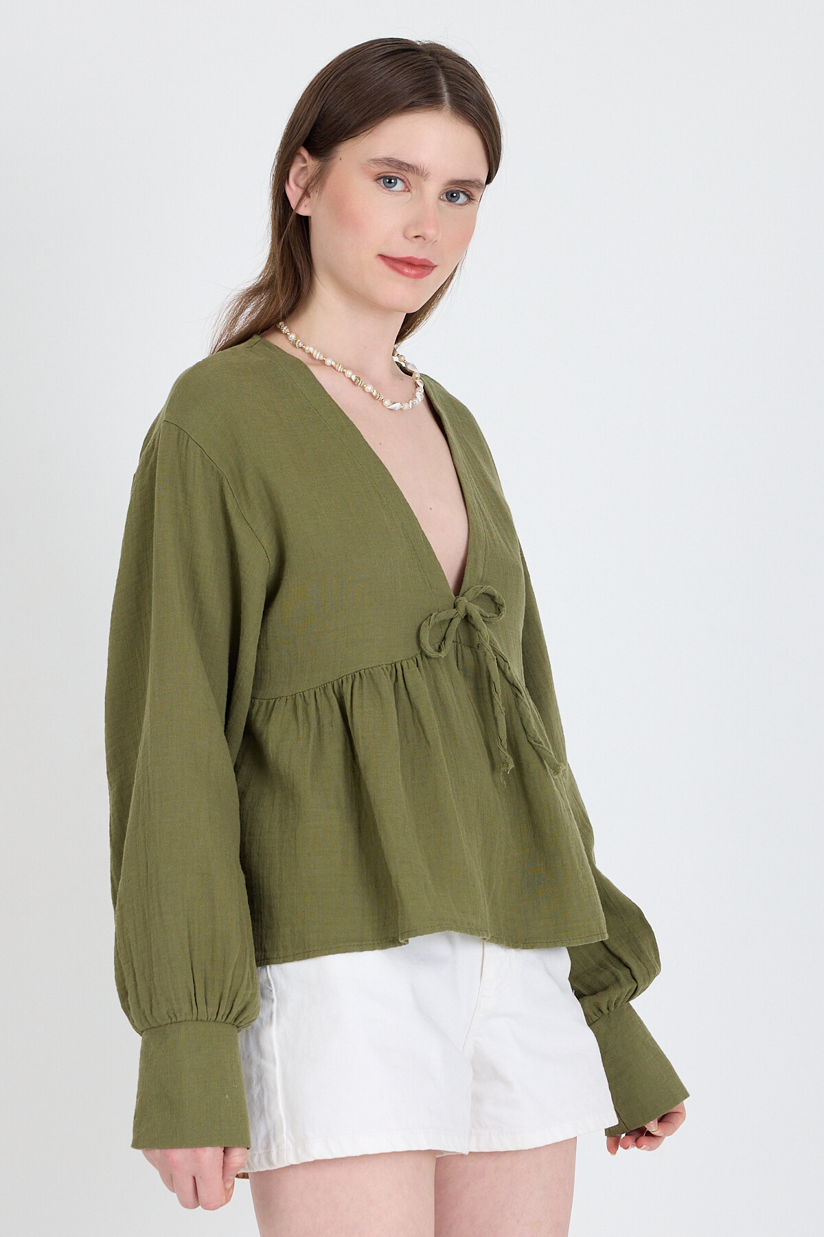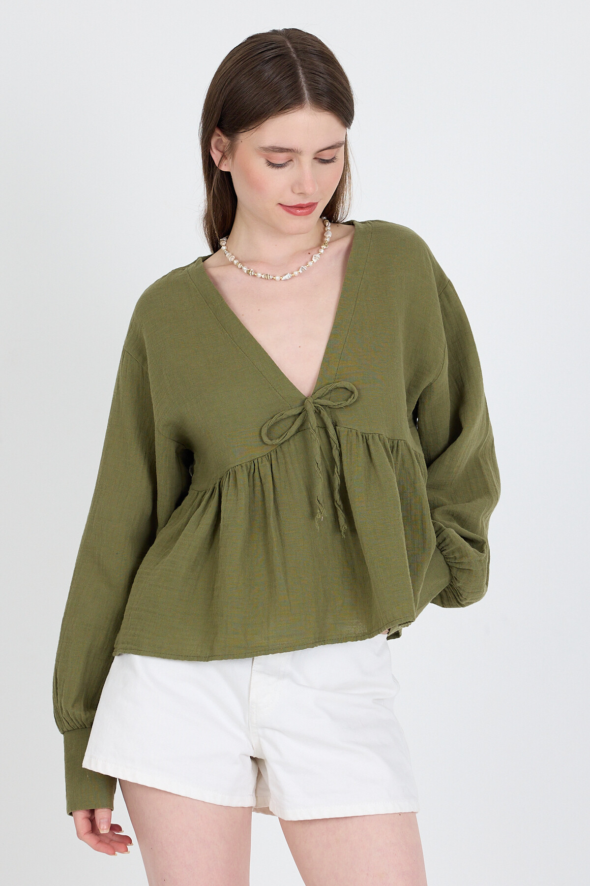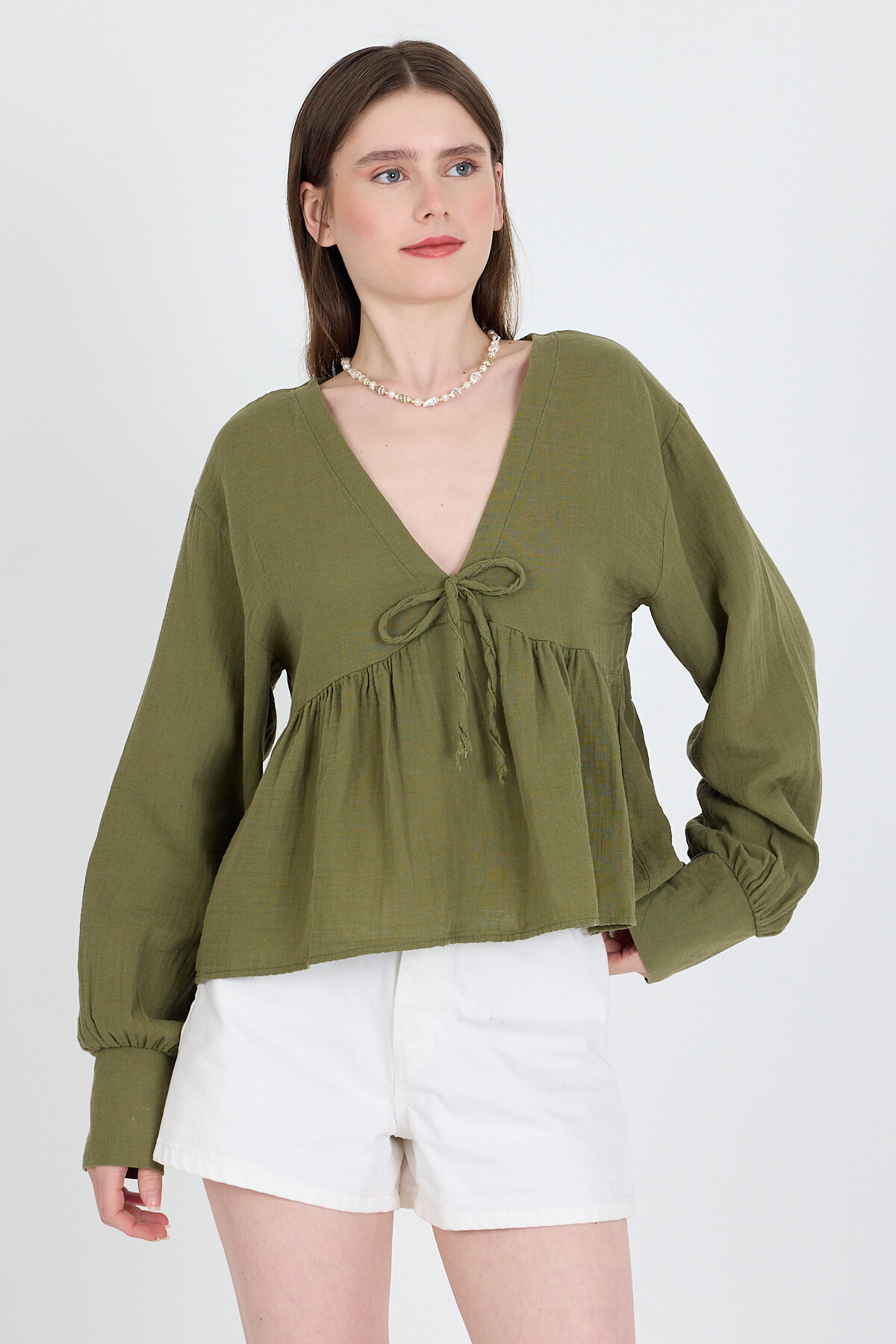 Haki %100 Pamuk V Yaka Ön Bağlama Detaylı Bluz 4784A