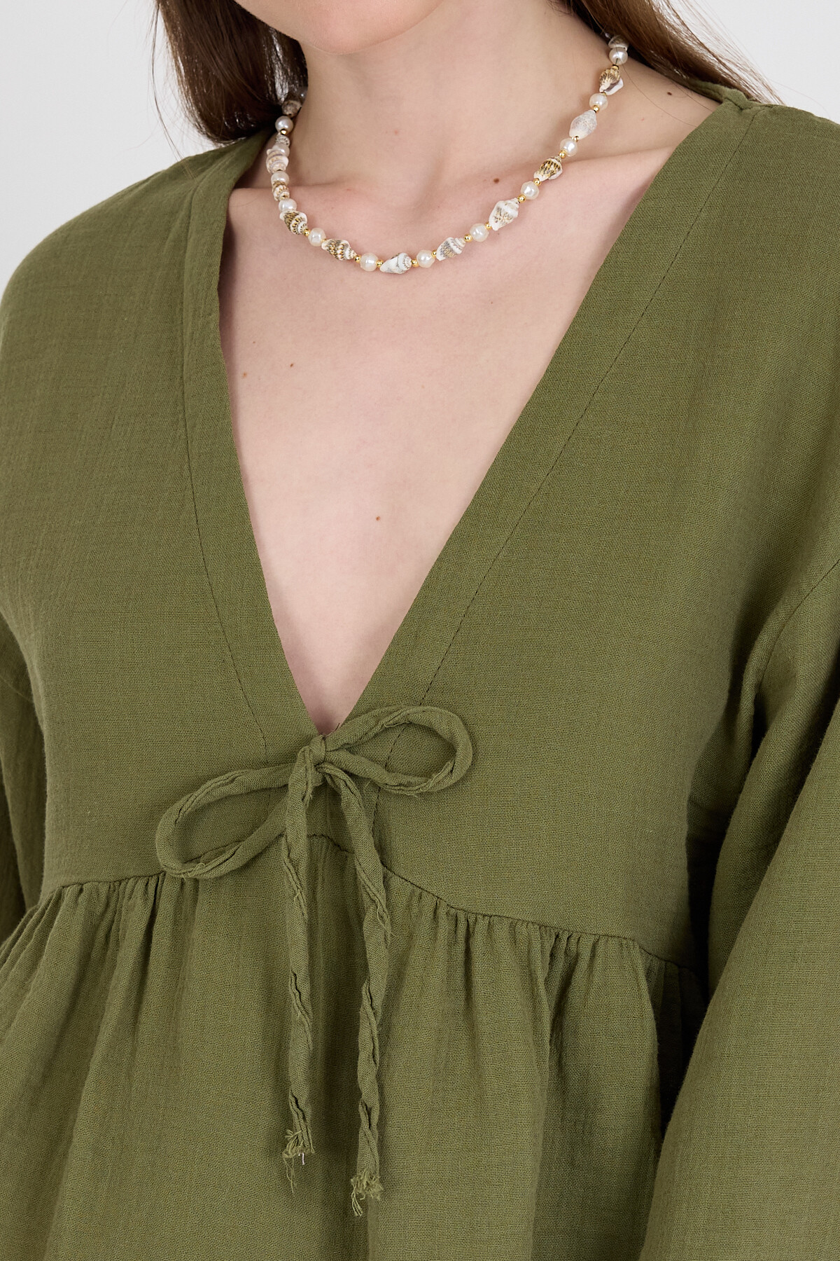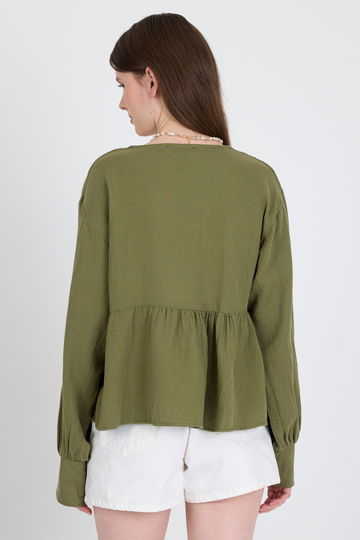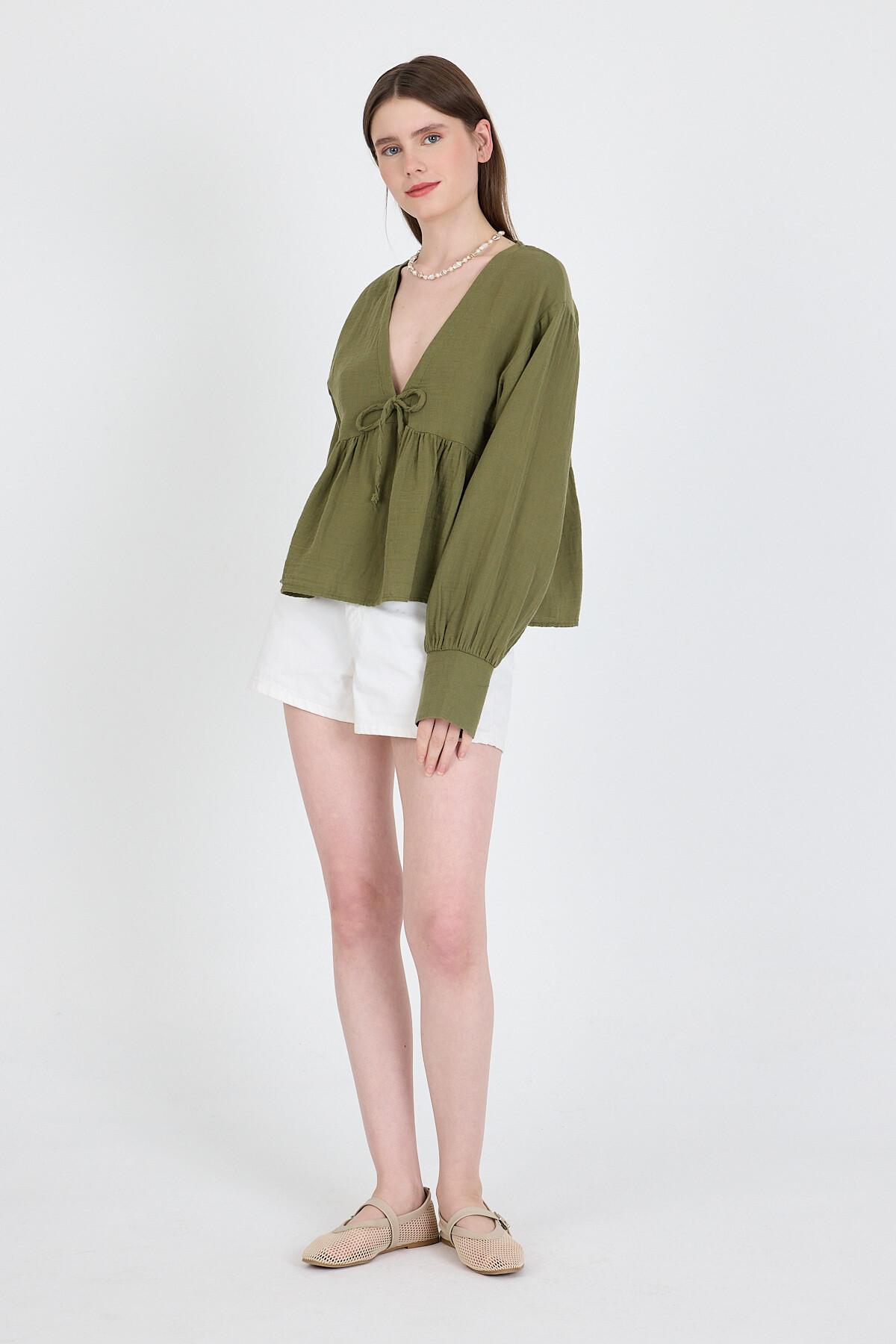 Haki %100 Pamuk V Yaka Ön Bağlama Detaylı Bluz 4784A