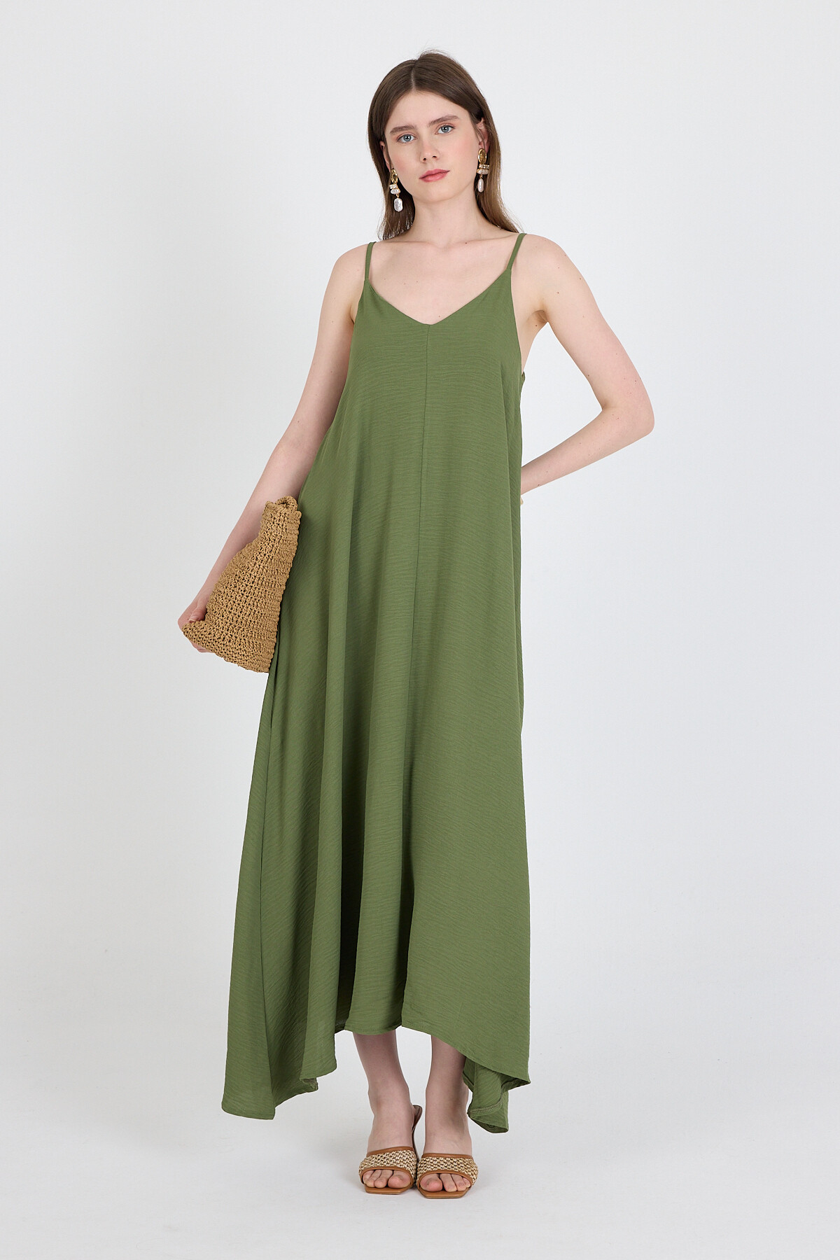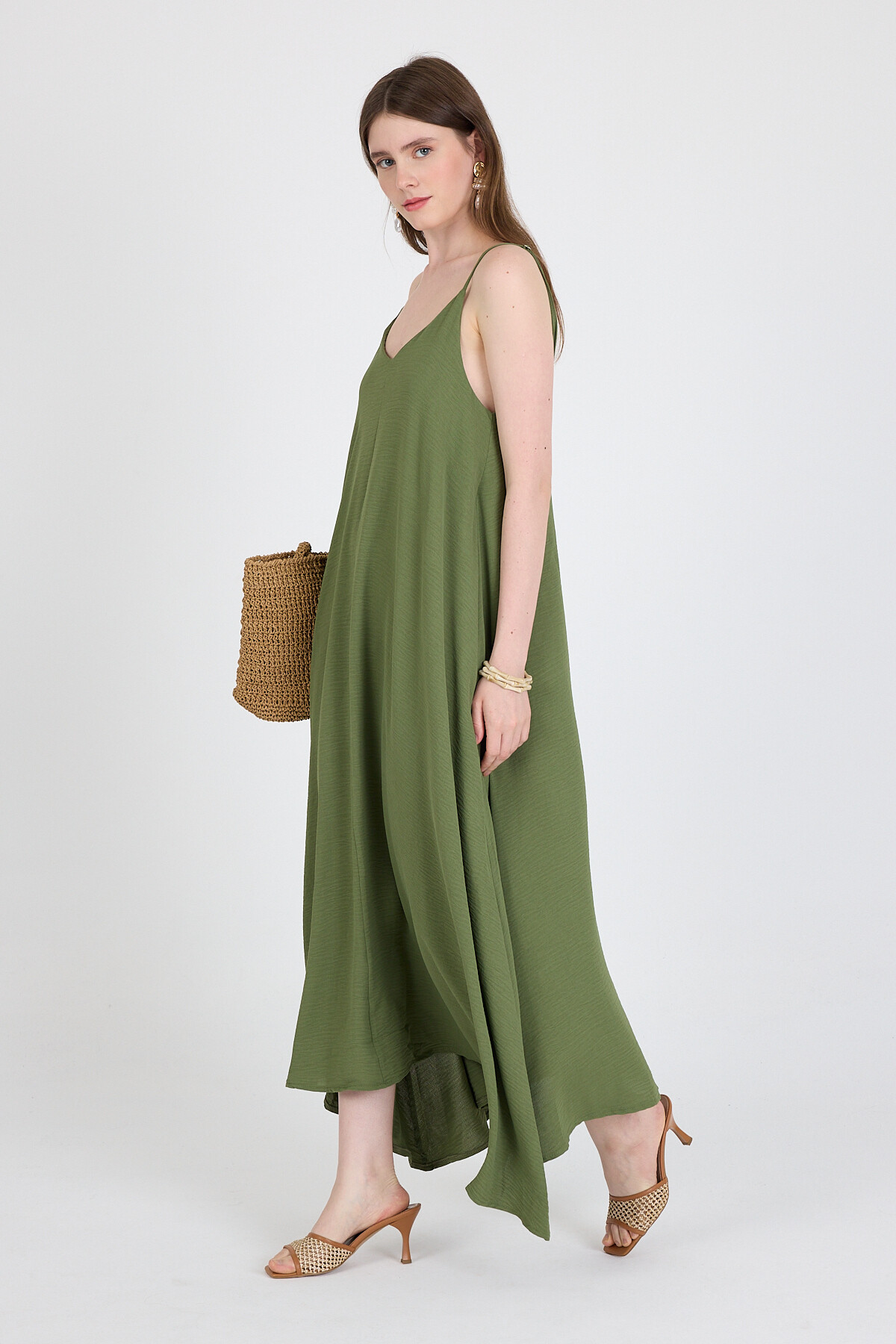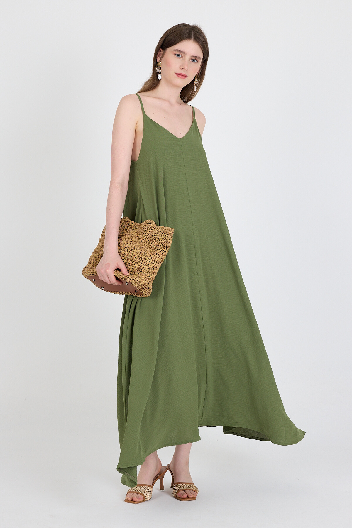 Haki Askılı V Yaka Bol Kesim Dokuma Elbise 20003
