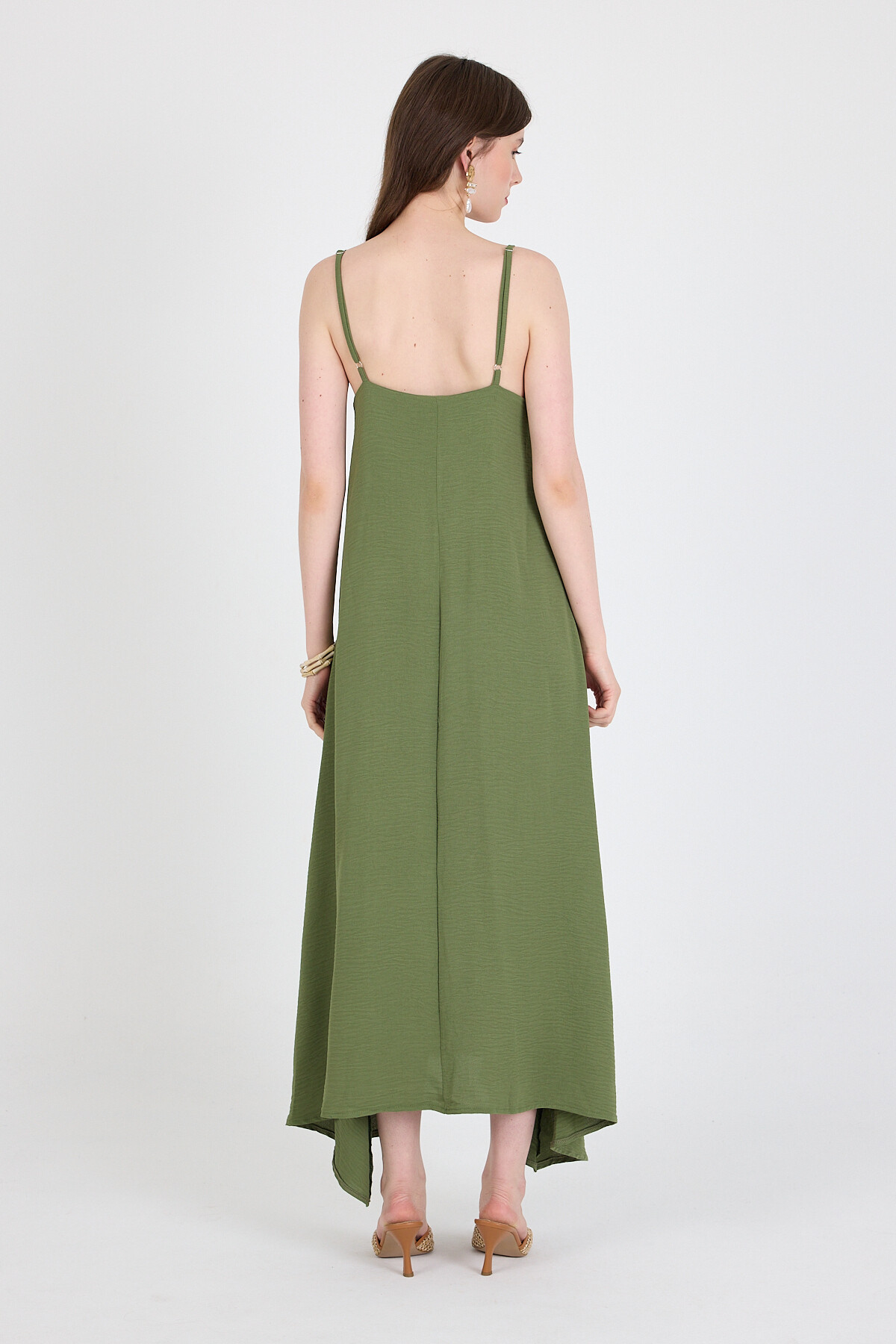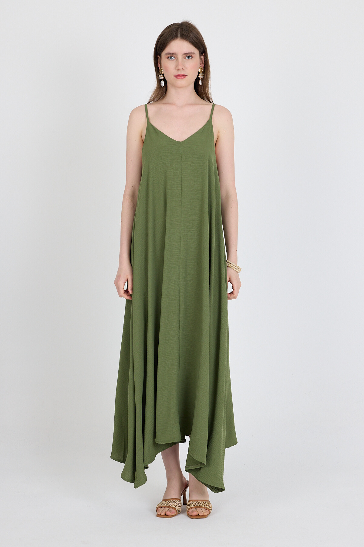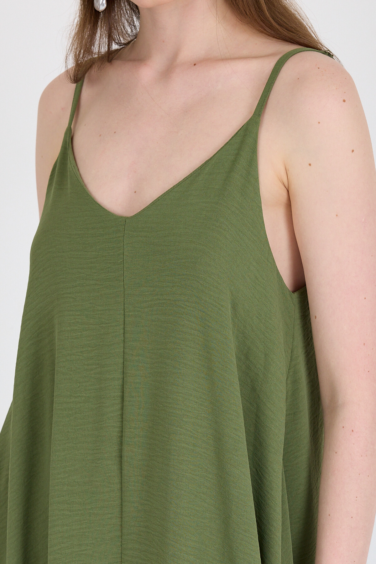 Haki Askılı V Yaka Bol Kesim Dokuma Elbise 20003