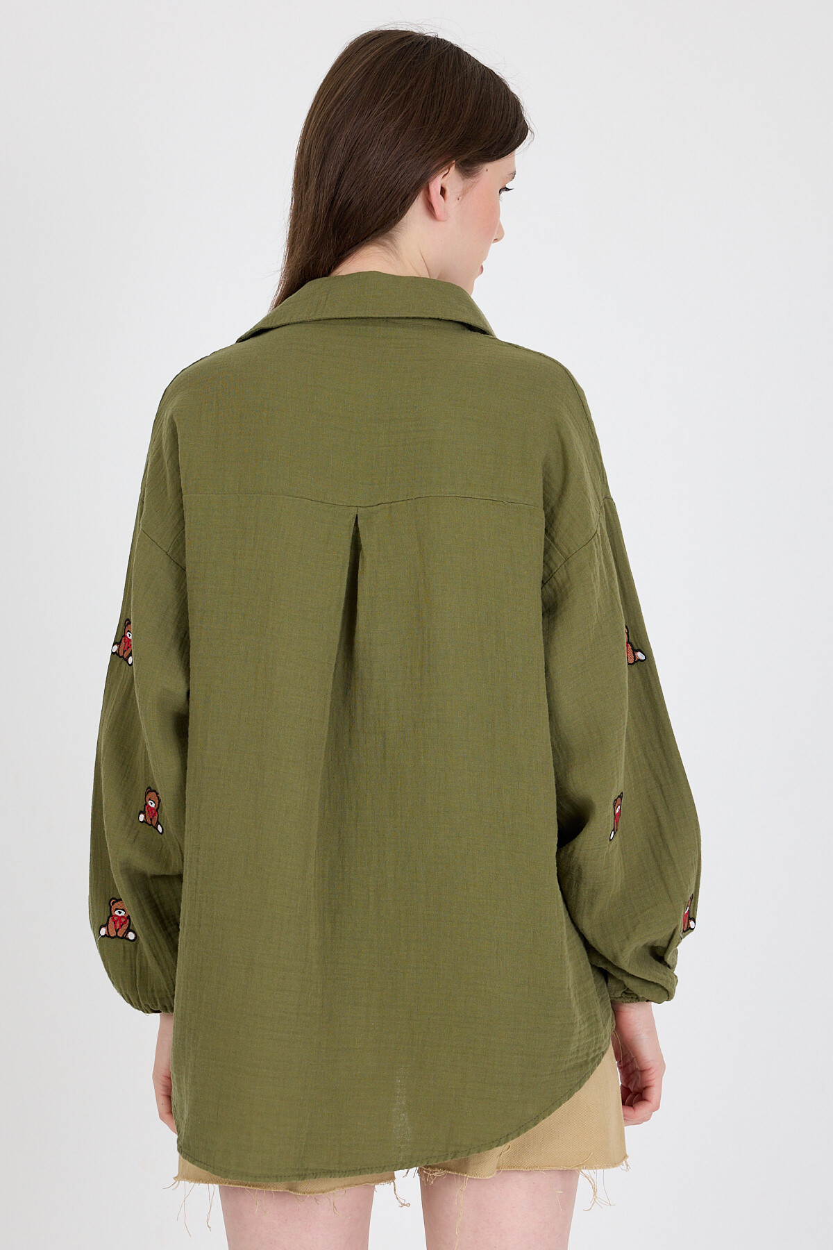 Haki Keten Görünümlü %100 Pamuk Ayıcık Nakışlı Gömlek 4798A