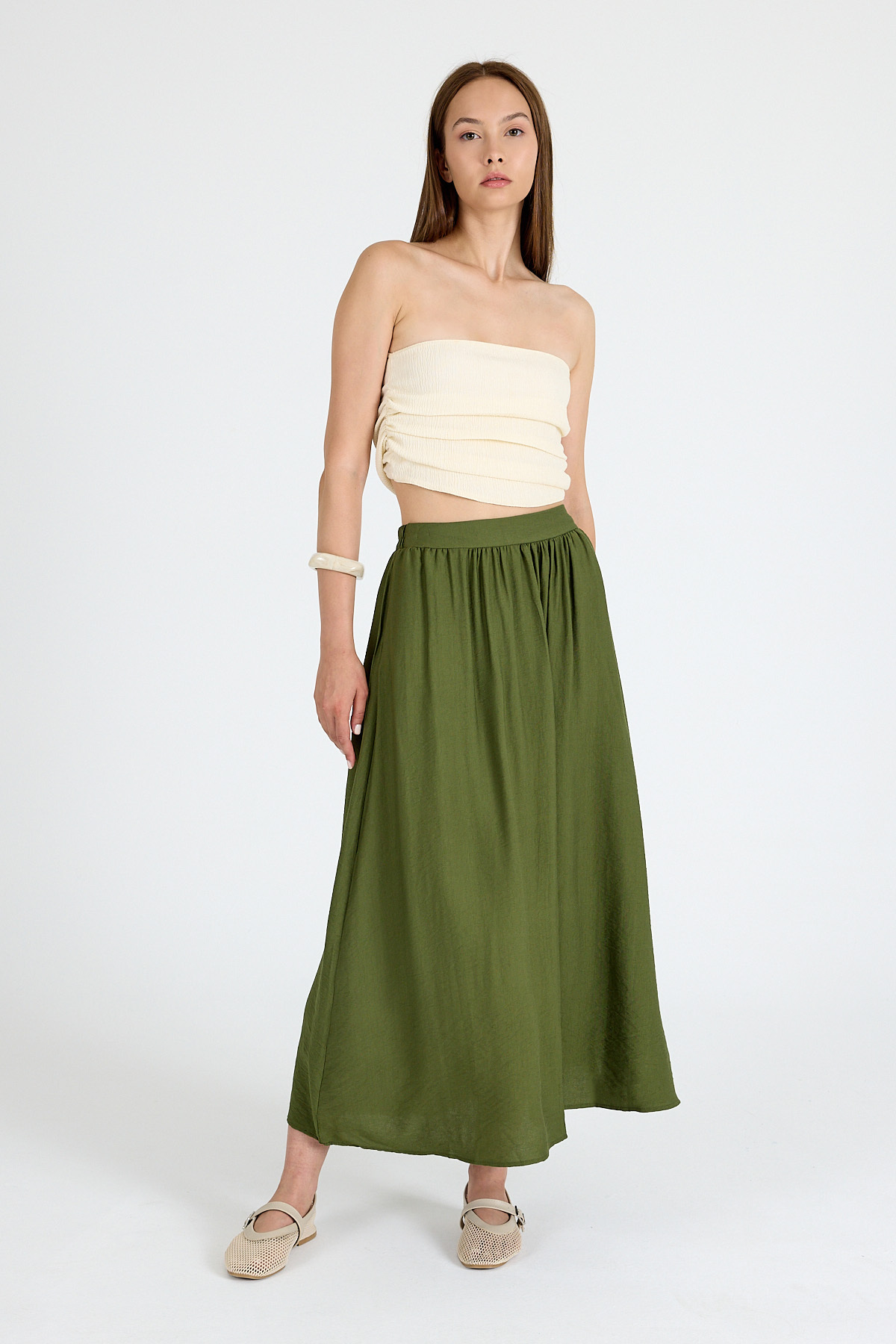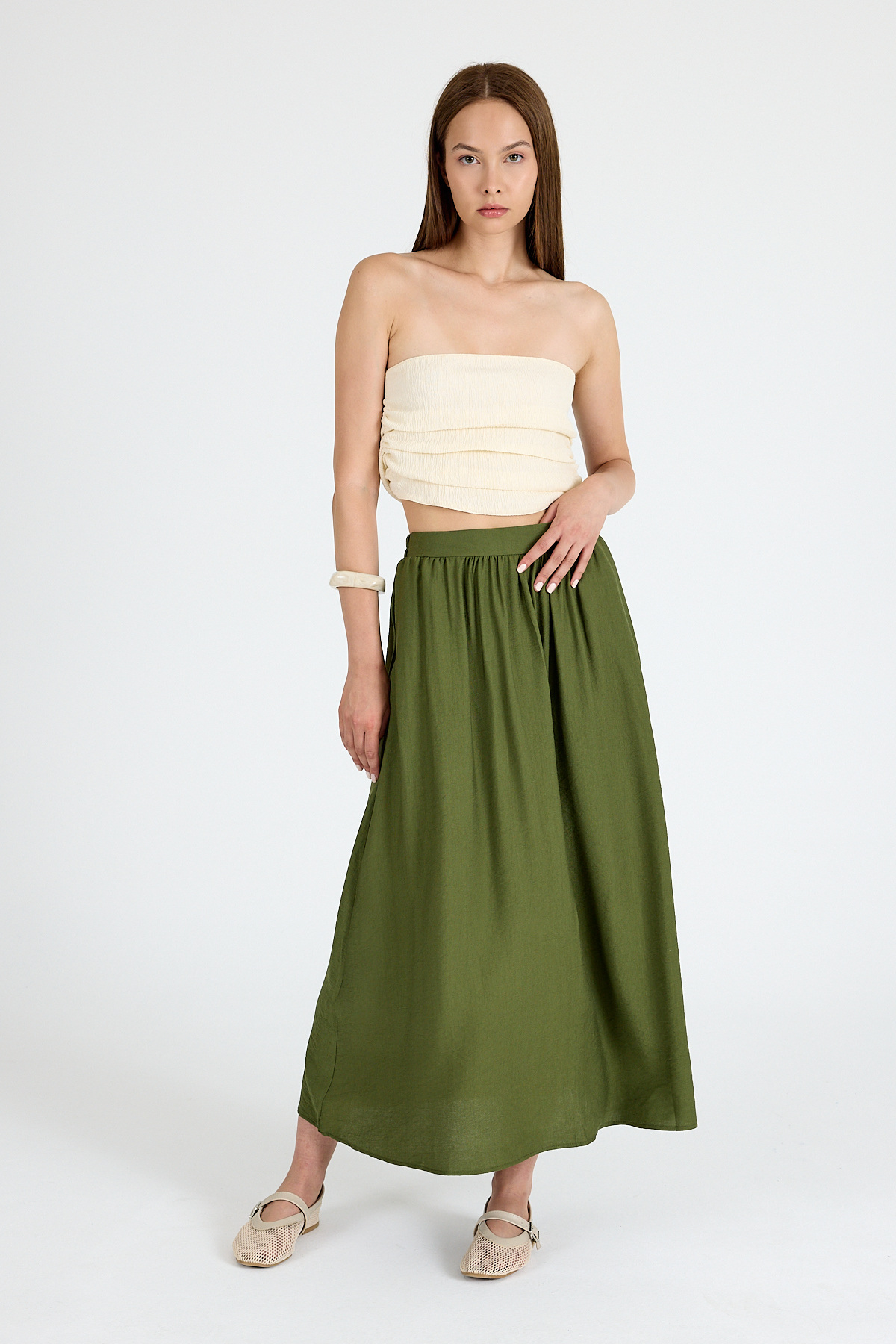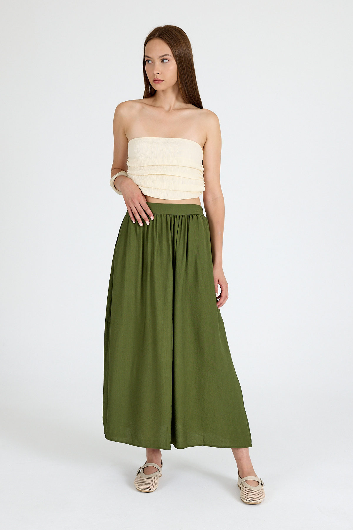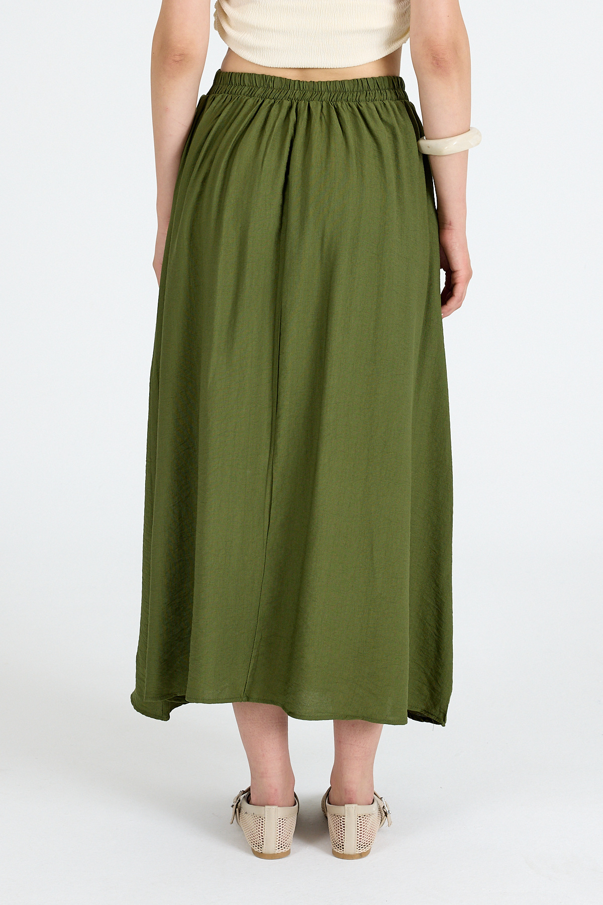 Haki Keten Görünümlü Cep Detaylı Midi Etek 2344