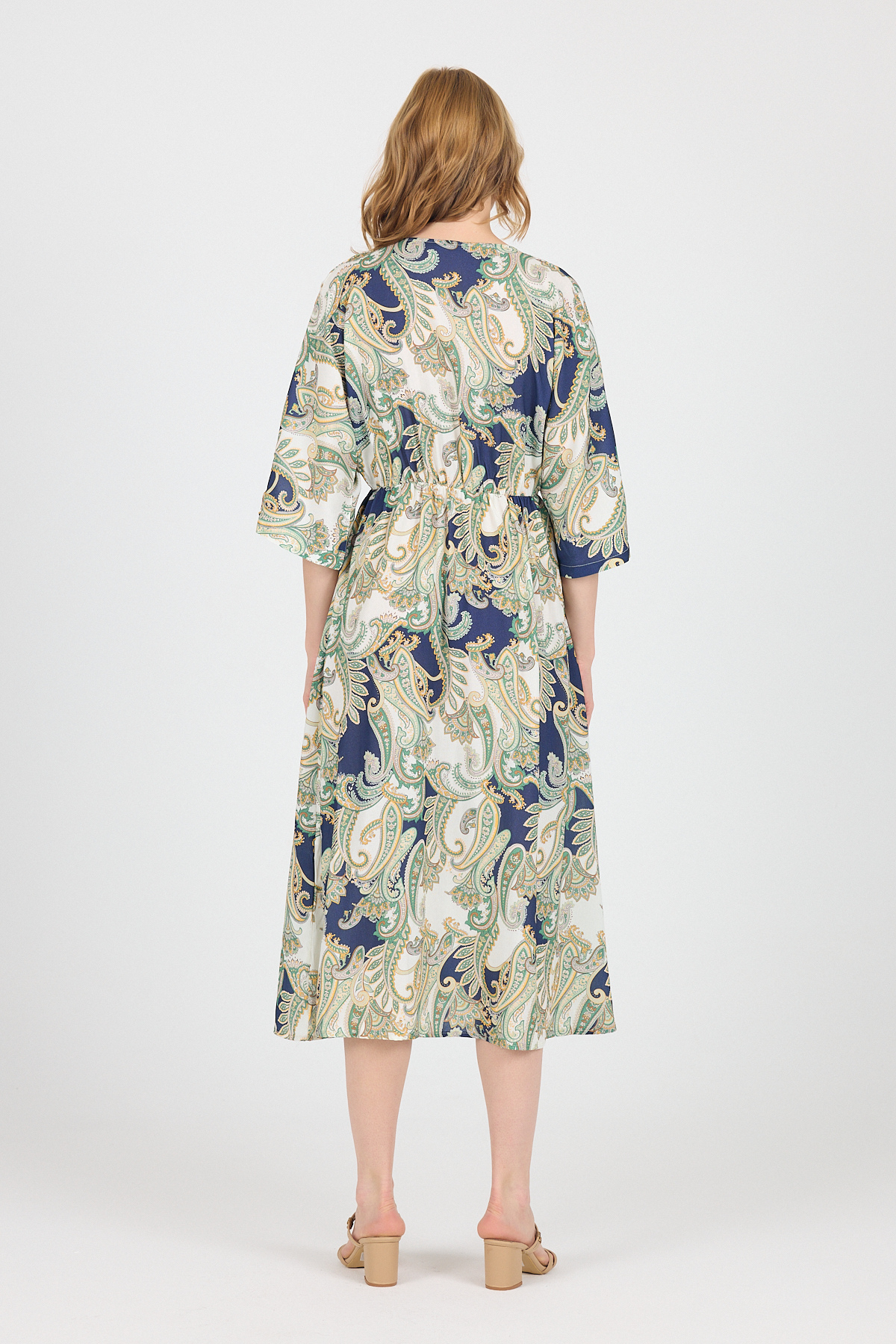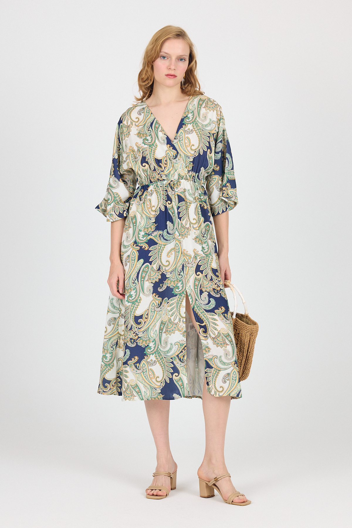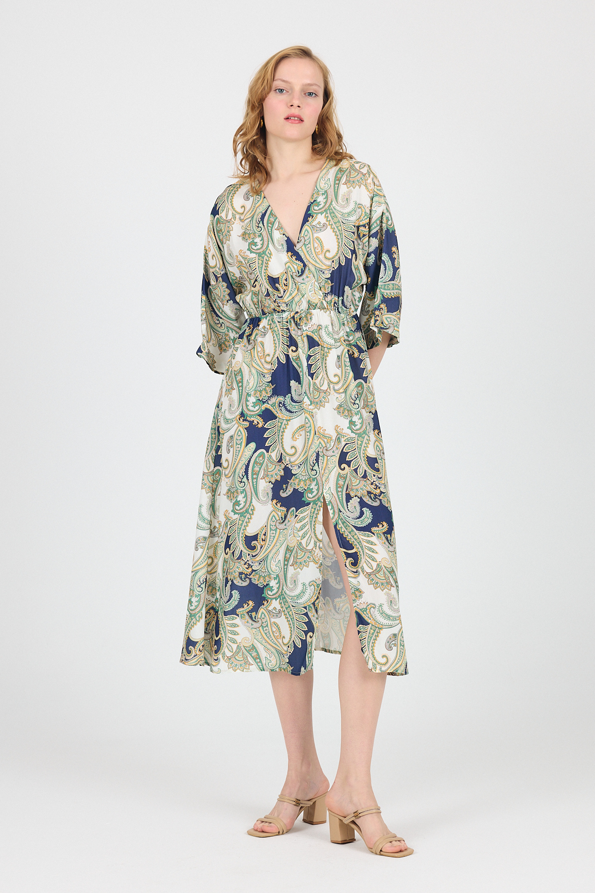 Haki Kruvaze Yaka Etnik Desenli Ön Yırtmaçlı Elbise 6651