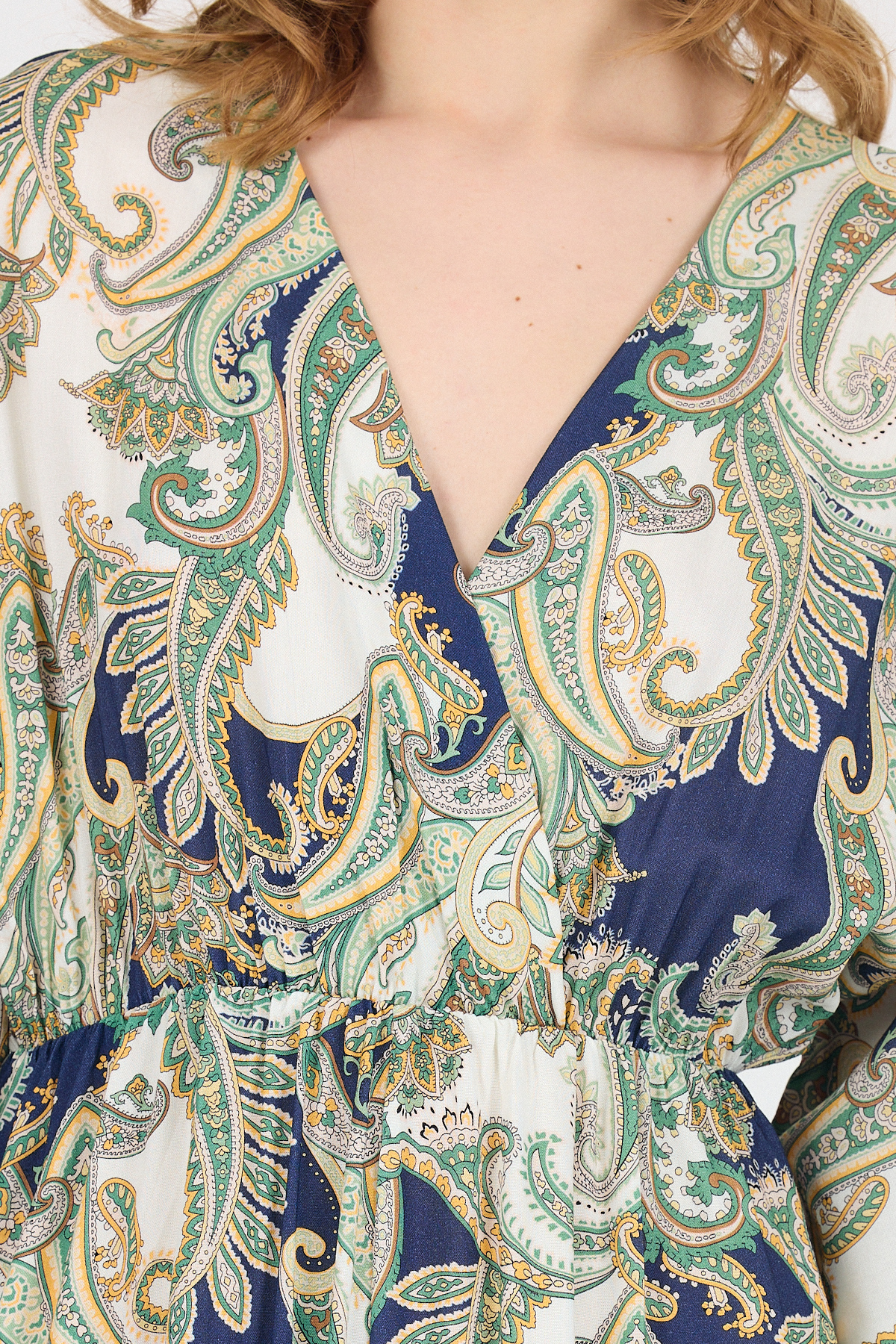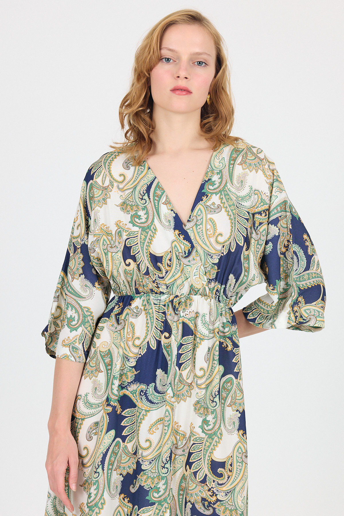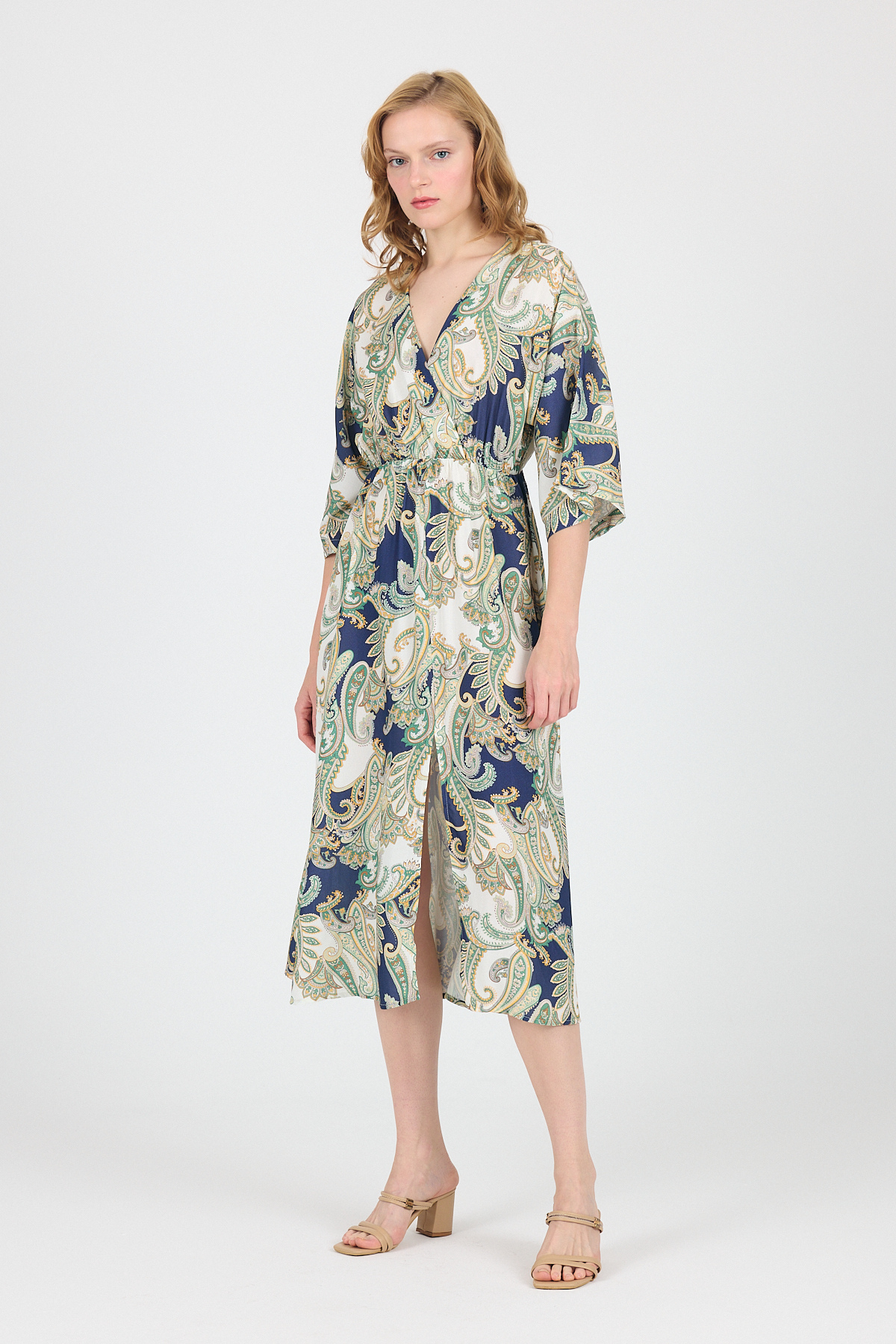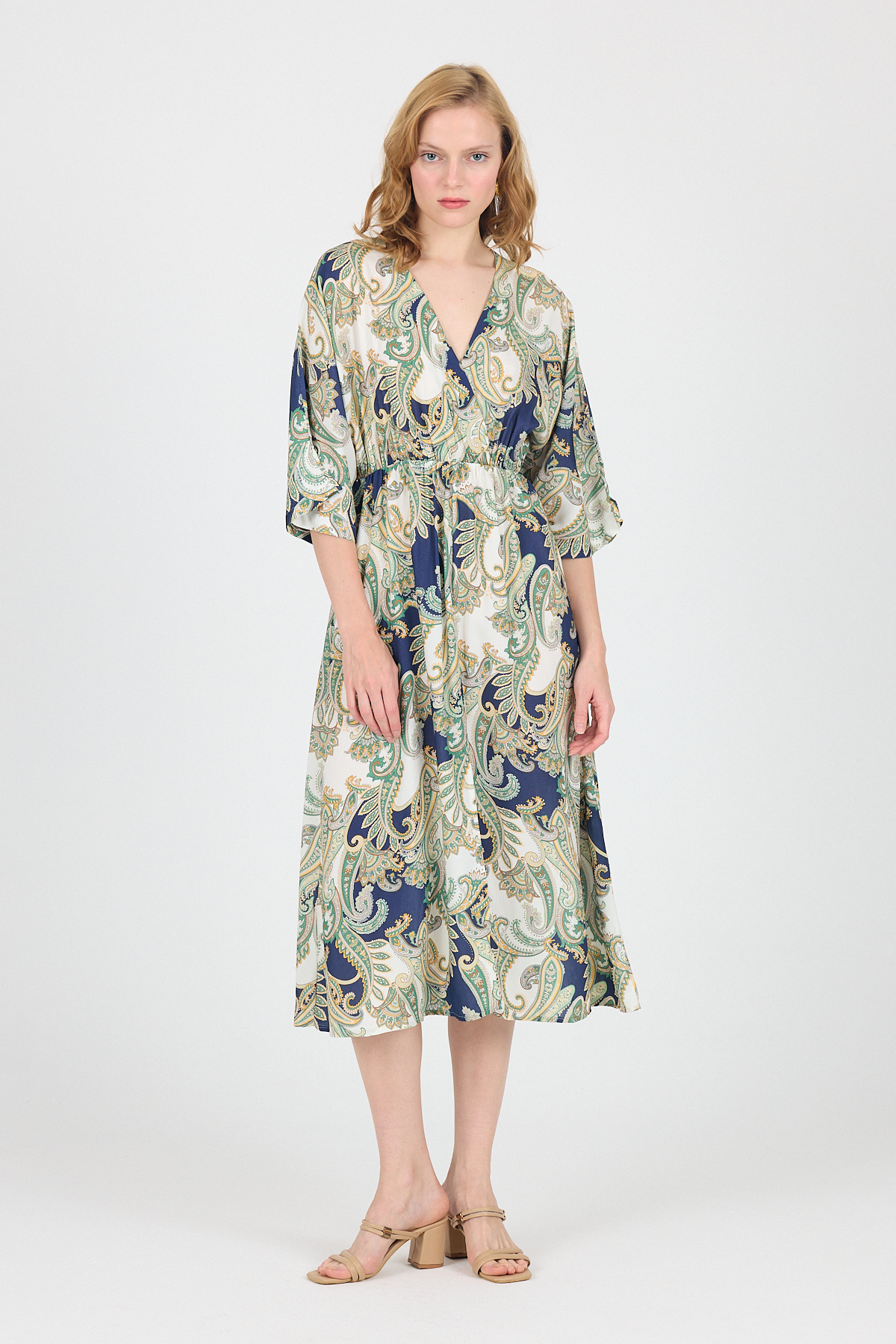 Haki Kruvaze Yaka Etnik Desenli Ön Yırtmaçlı Elbise 6651