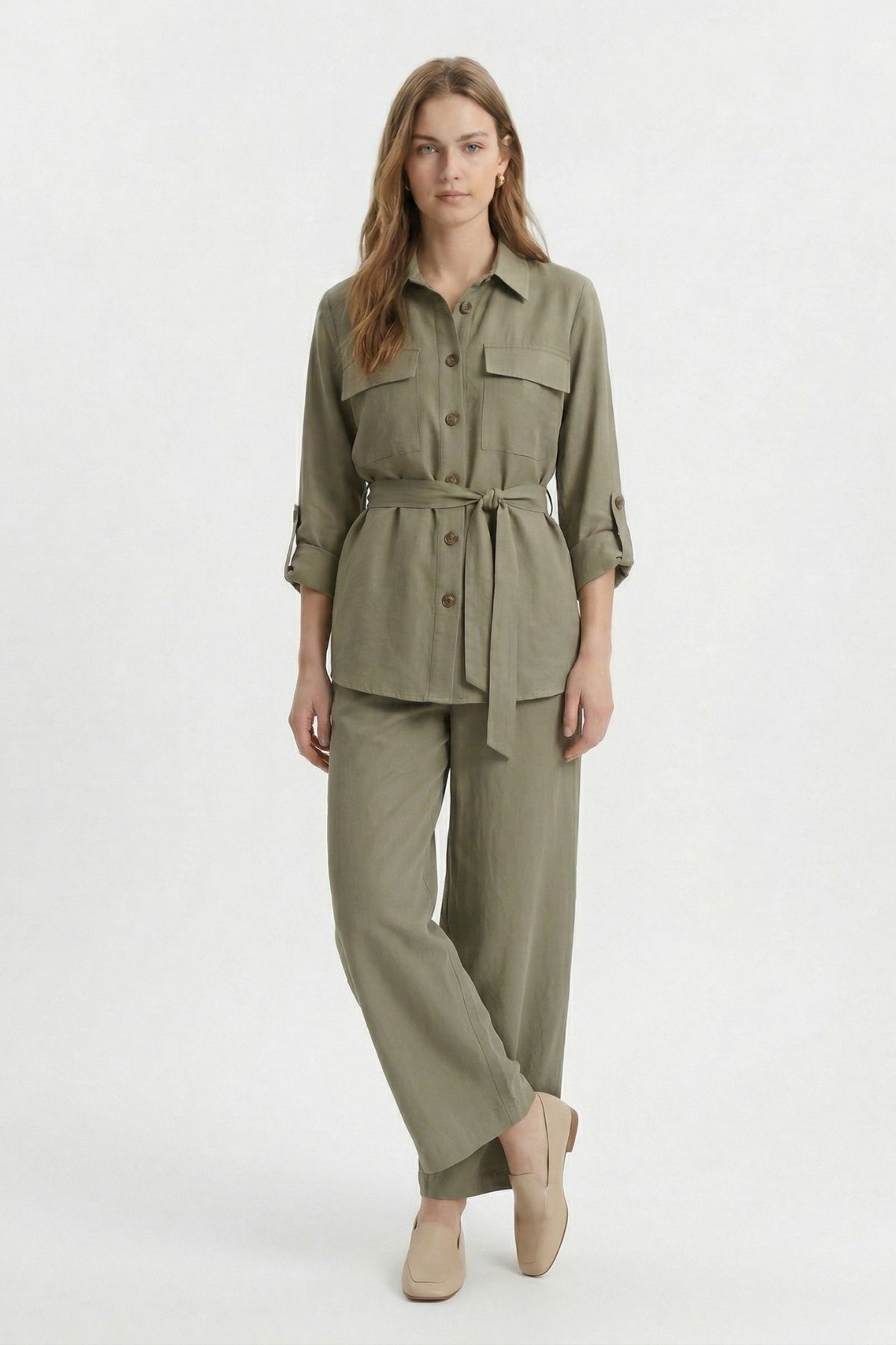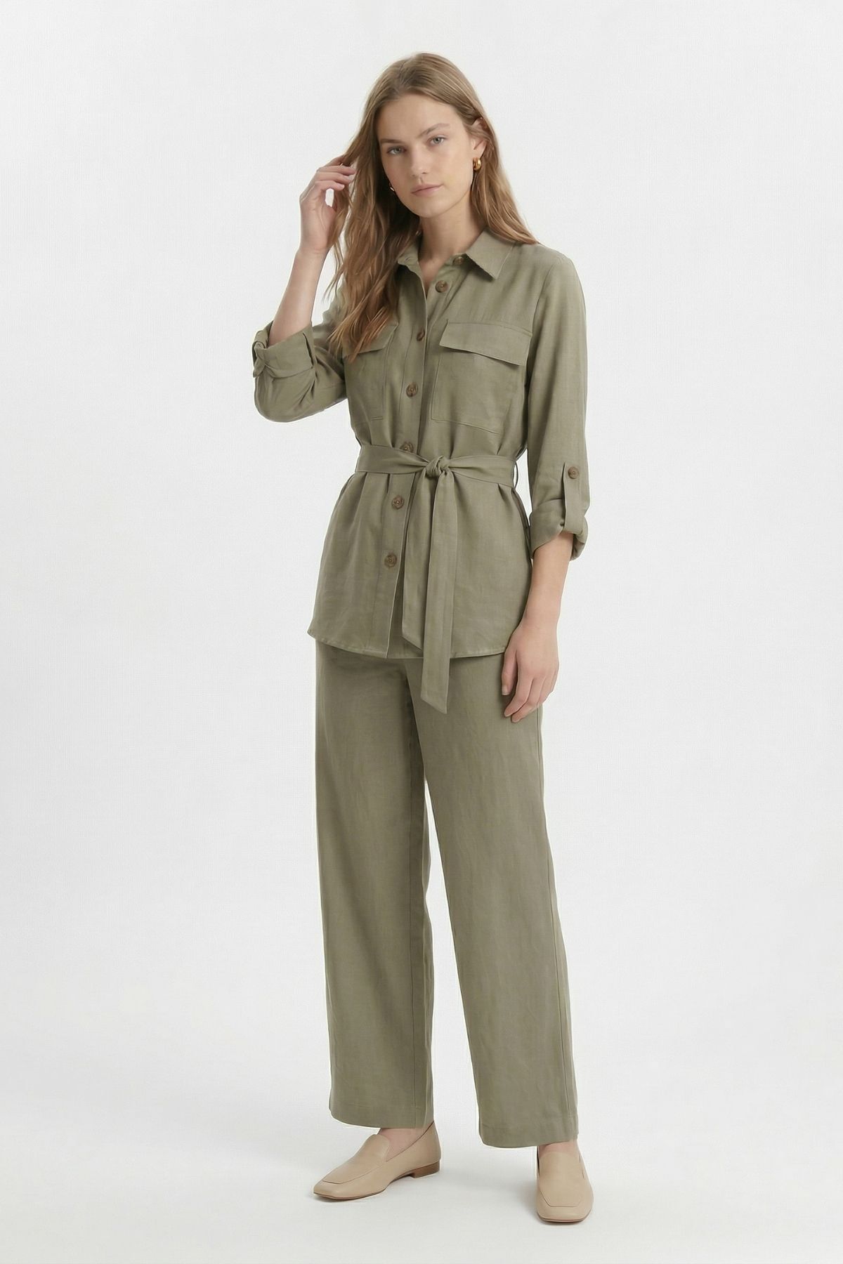 Haki Kuşaklı Cepli Ceket Pantolon Takım 8874
