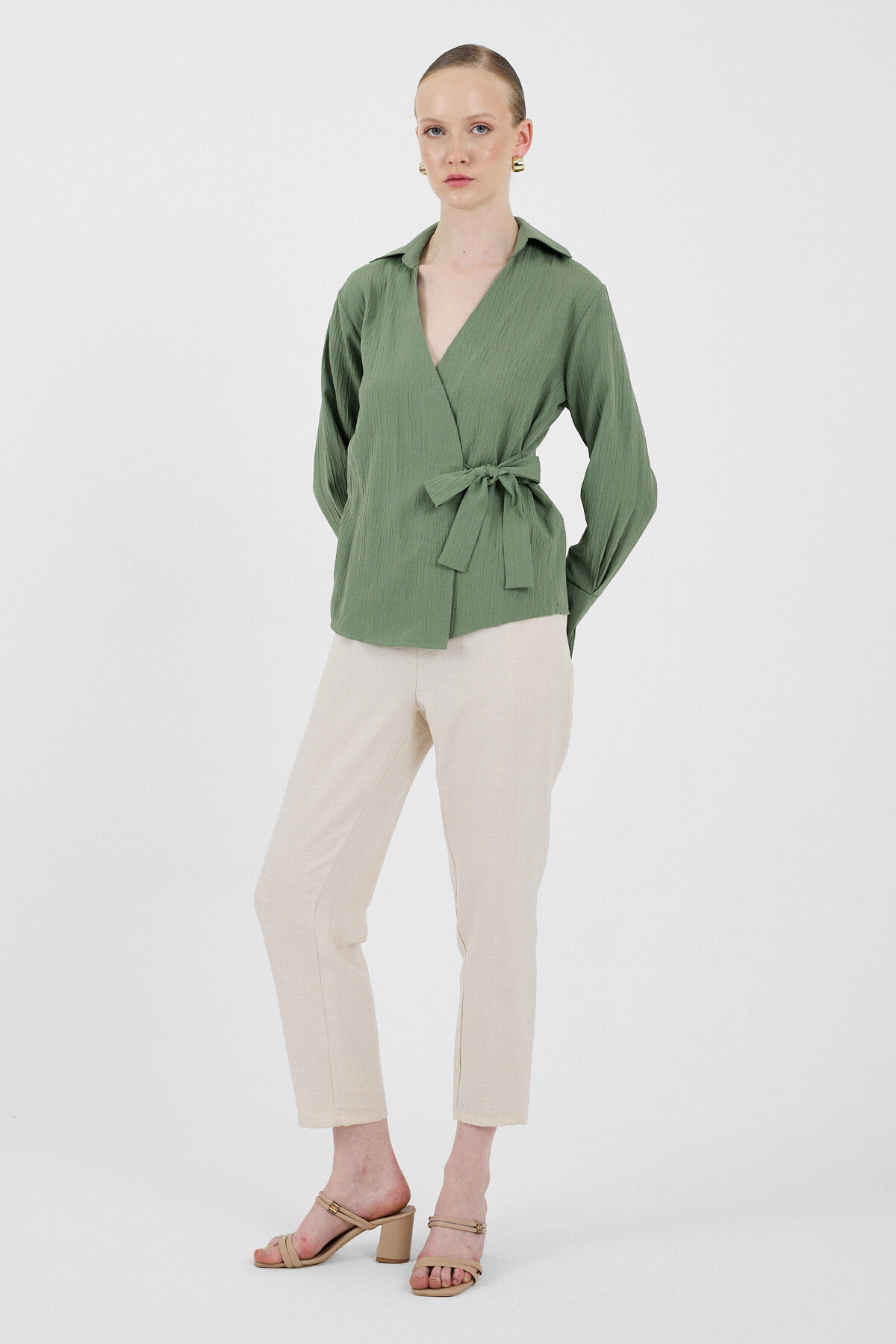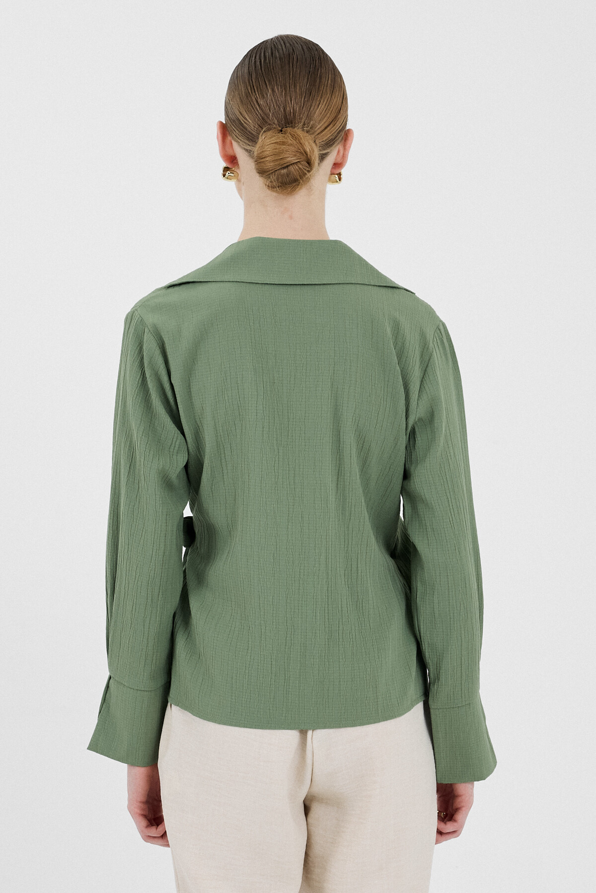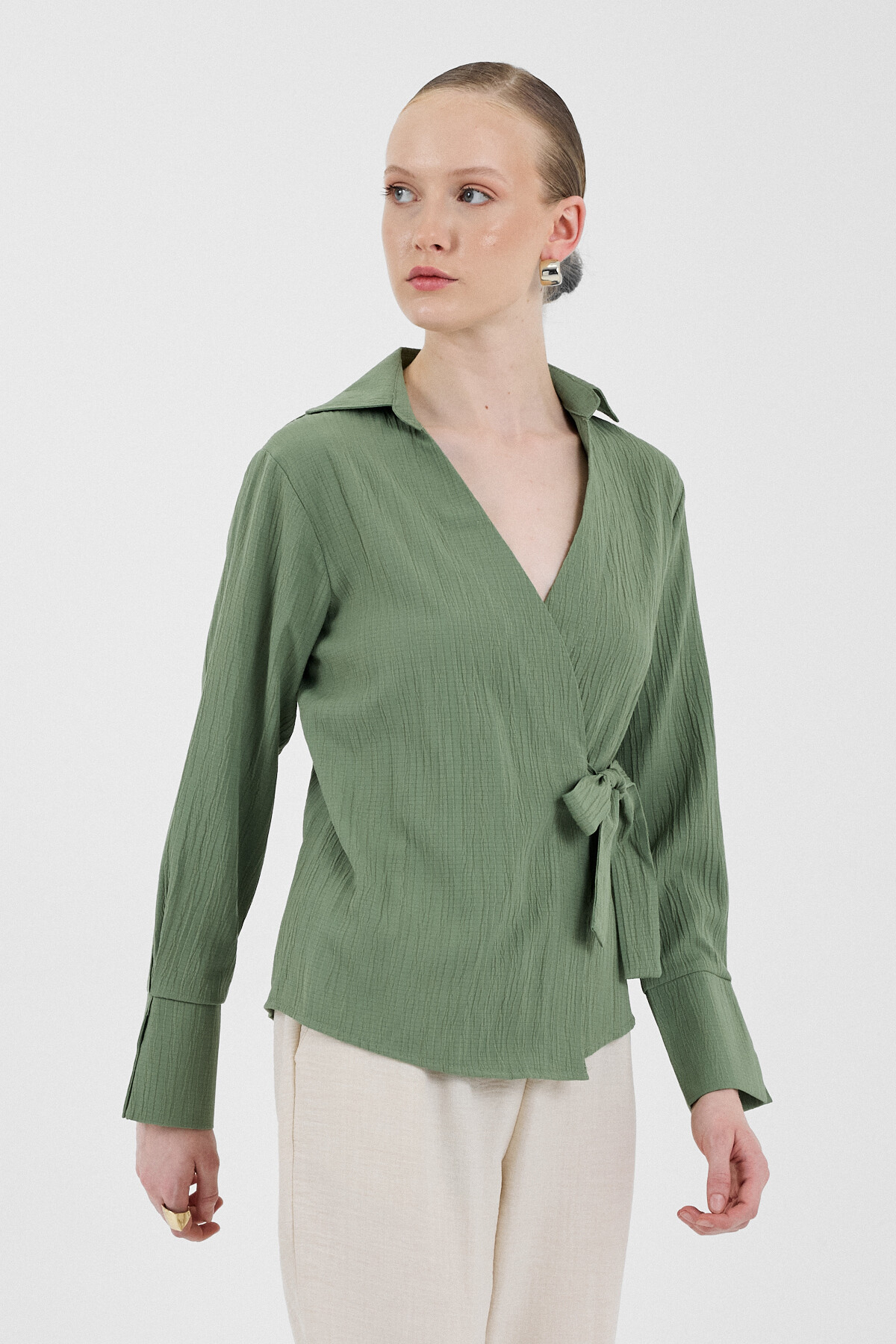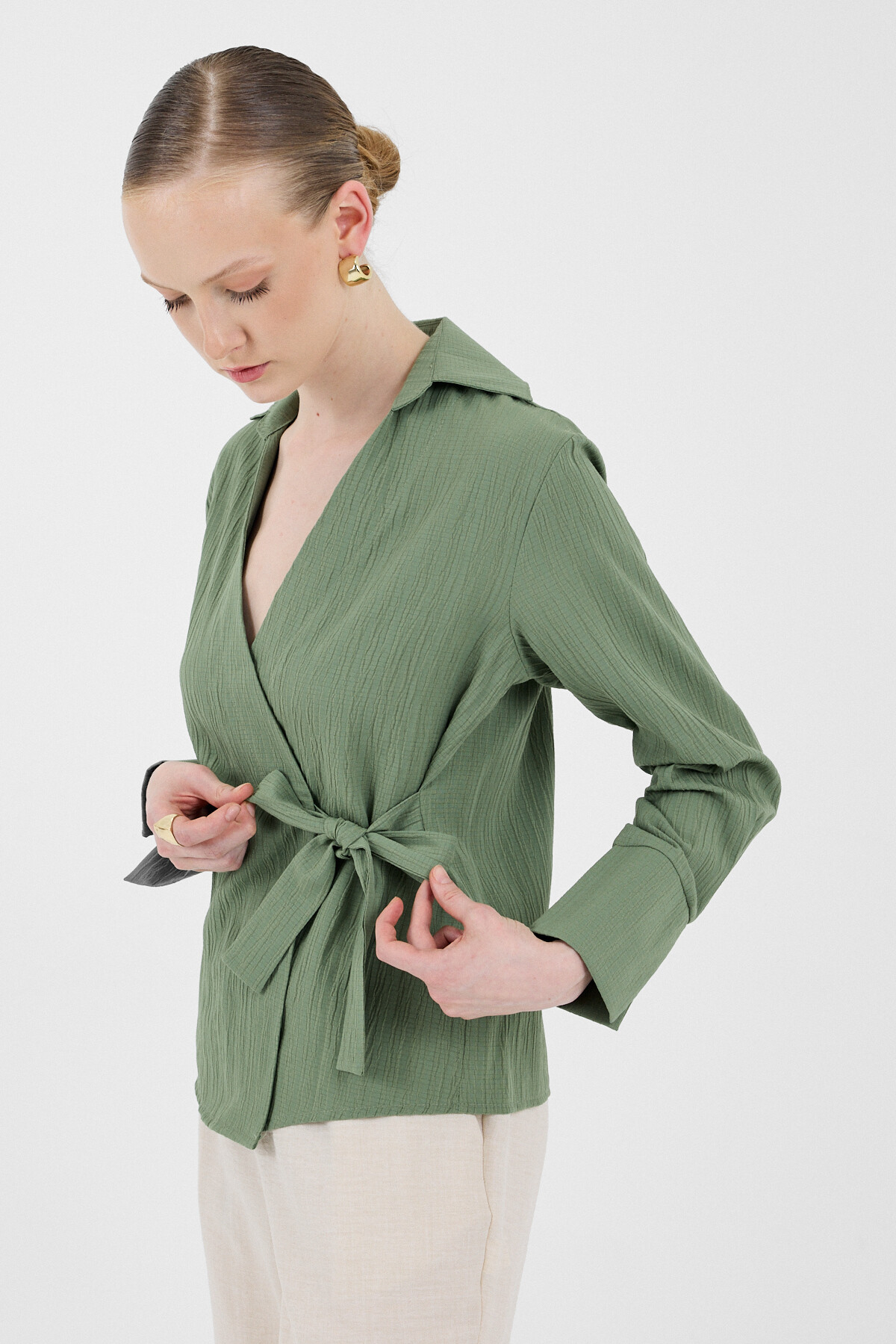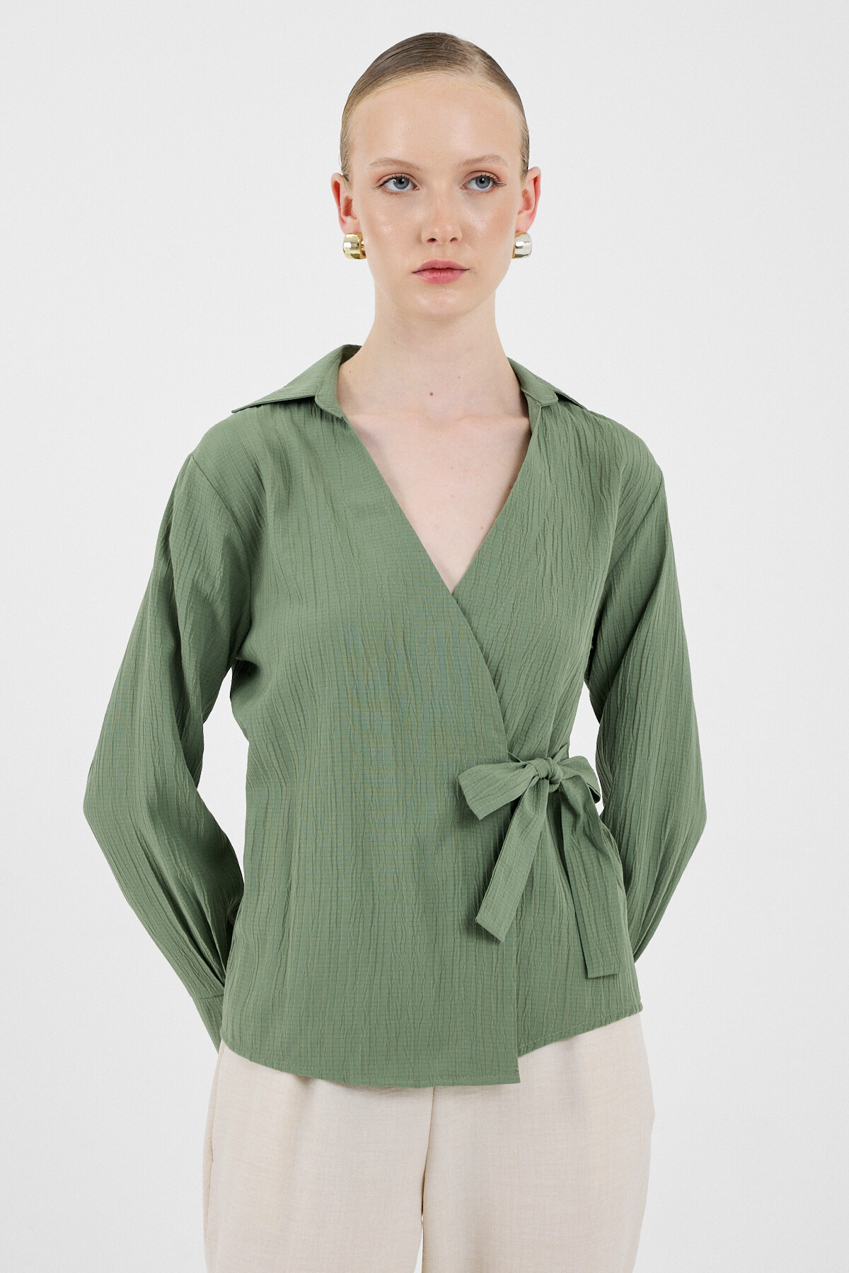 Haki Ön Bağlama Detaylı Uzun Kol Bluz 8019A