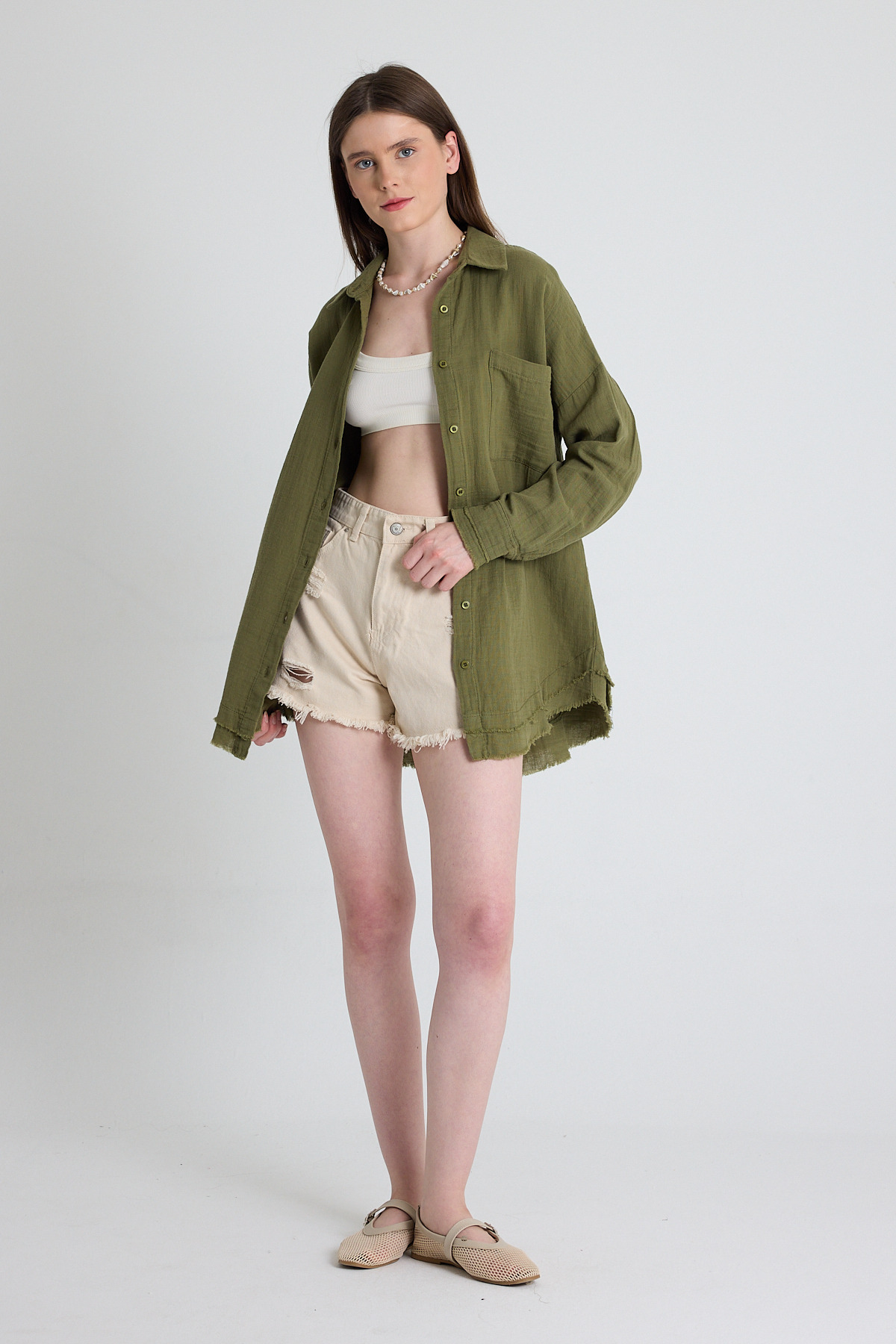 Haki Oversize %100 Pamuk Müslin Gömlek 4786A